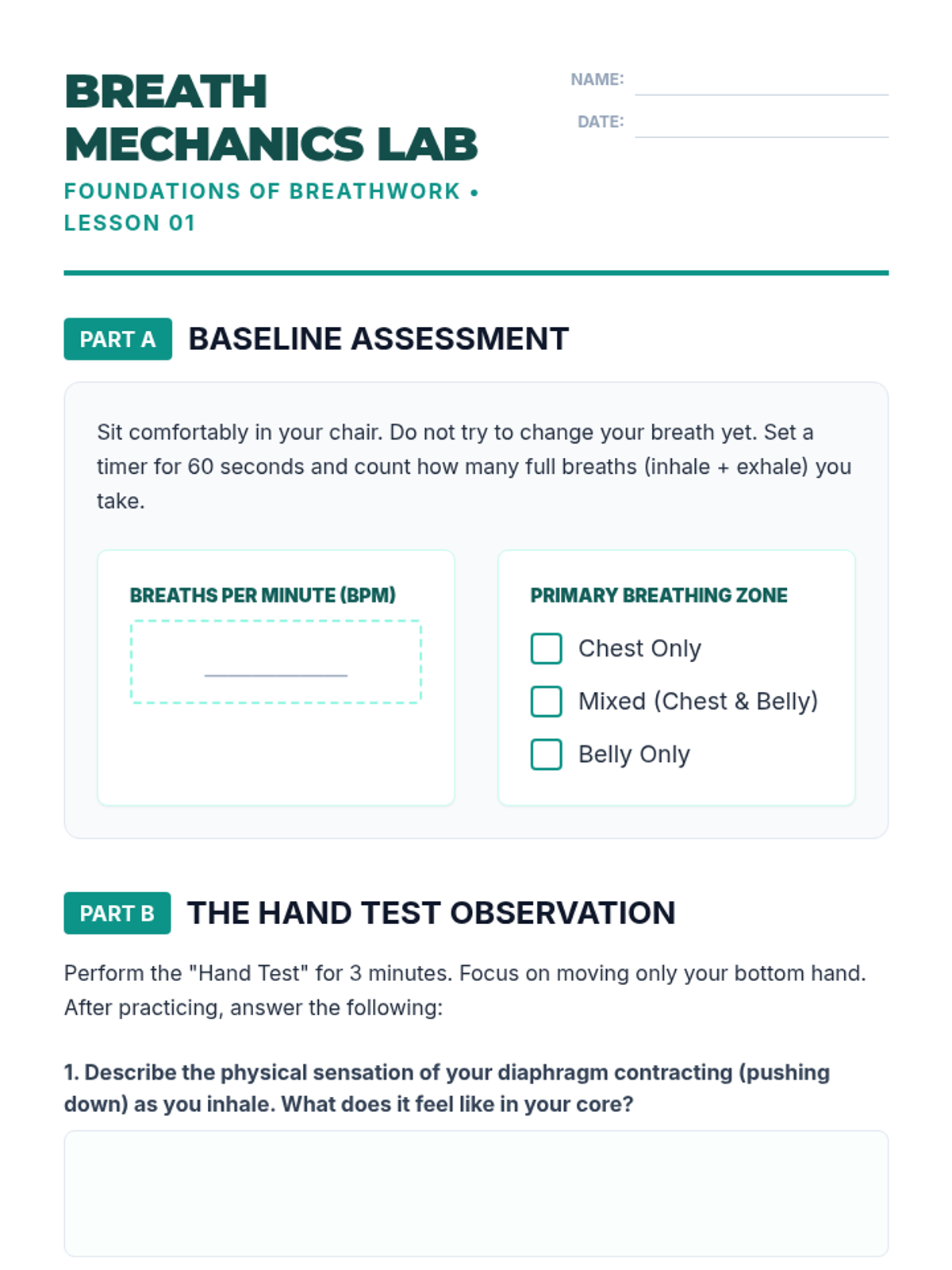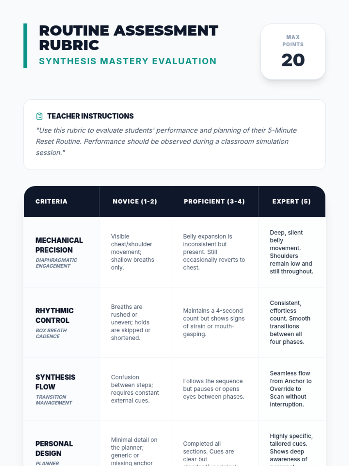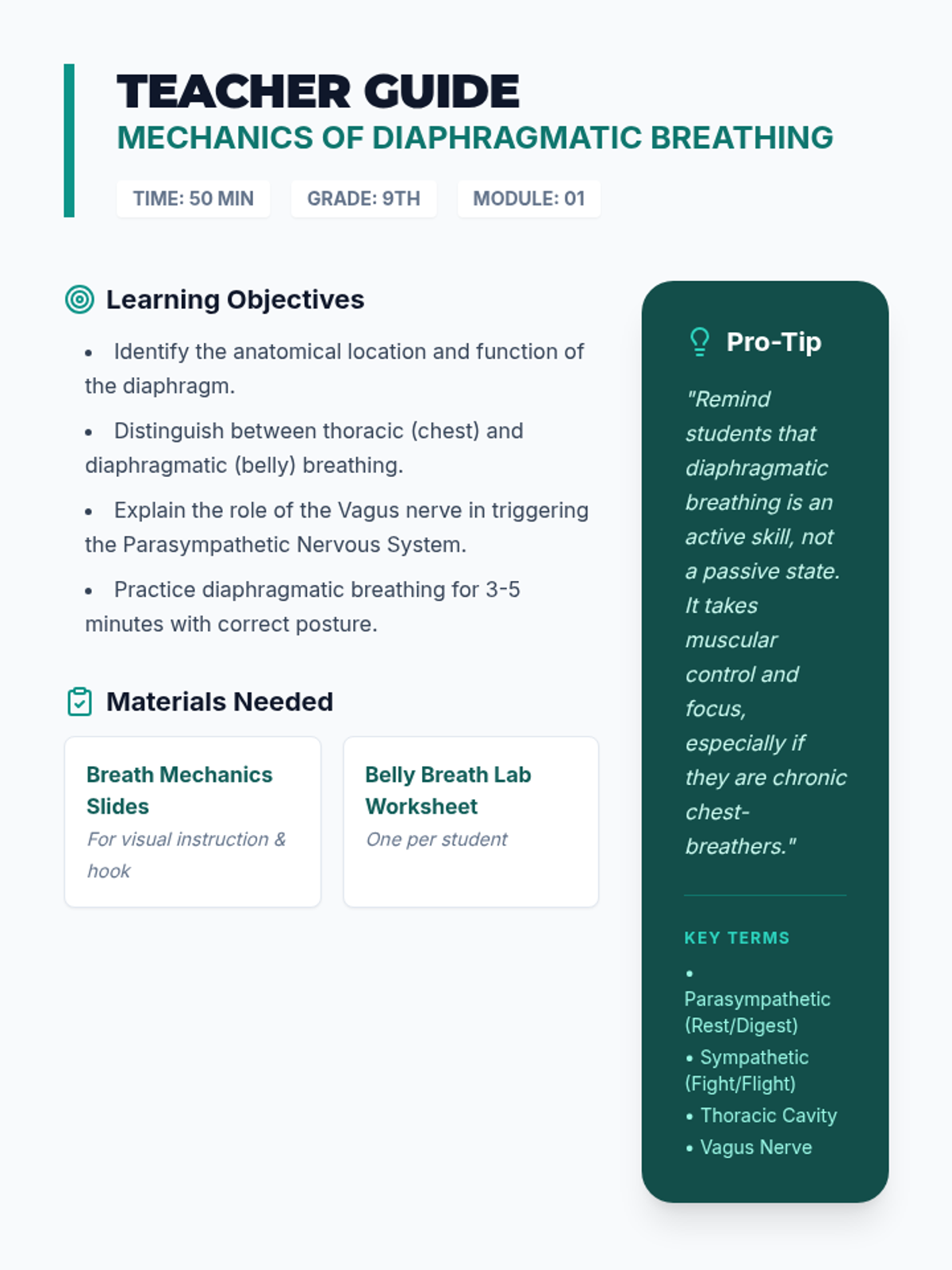 A 5-lesson sequence for 9th grade students focusing on the physiological mechanics of meditation. Students progress from basic diaphragmatic breathing to complex somatic techniques like box breathing and progressive muscle relaxation, culminating in a personal 5-minute stress management routine.