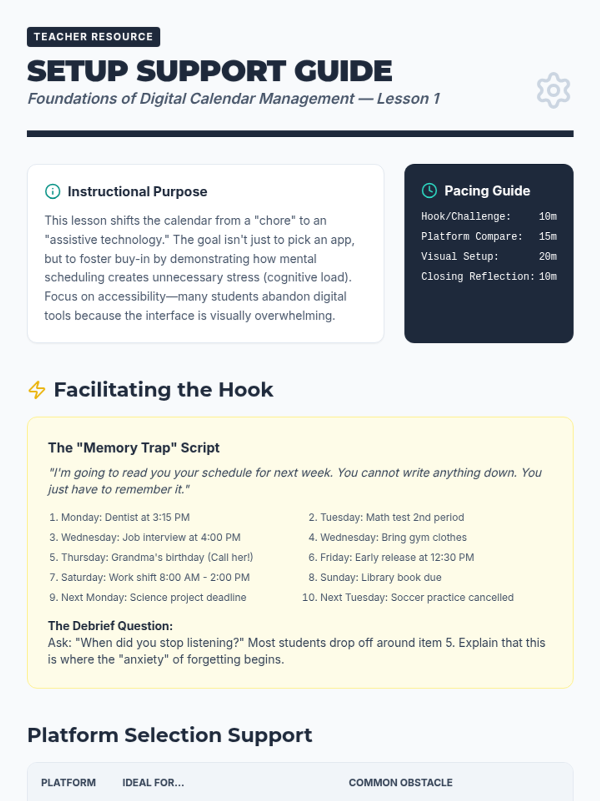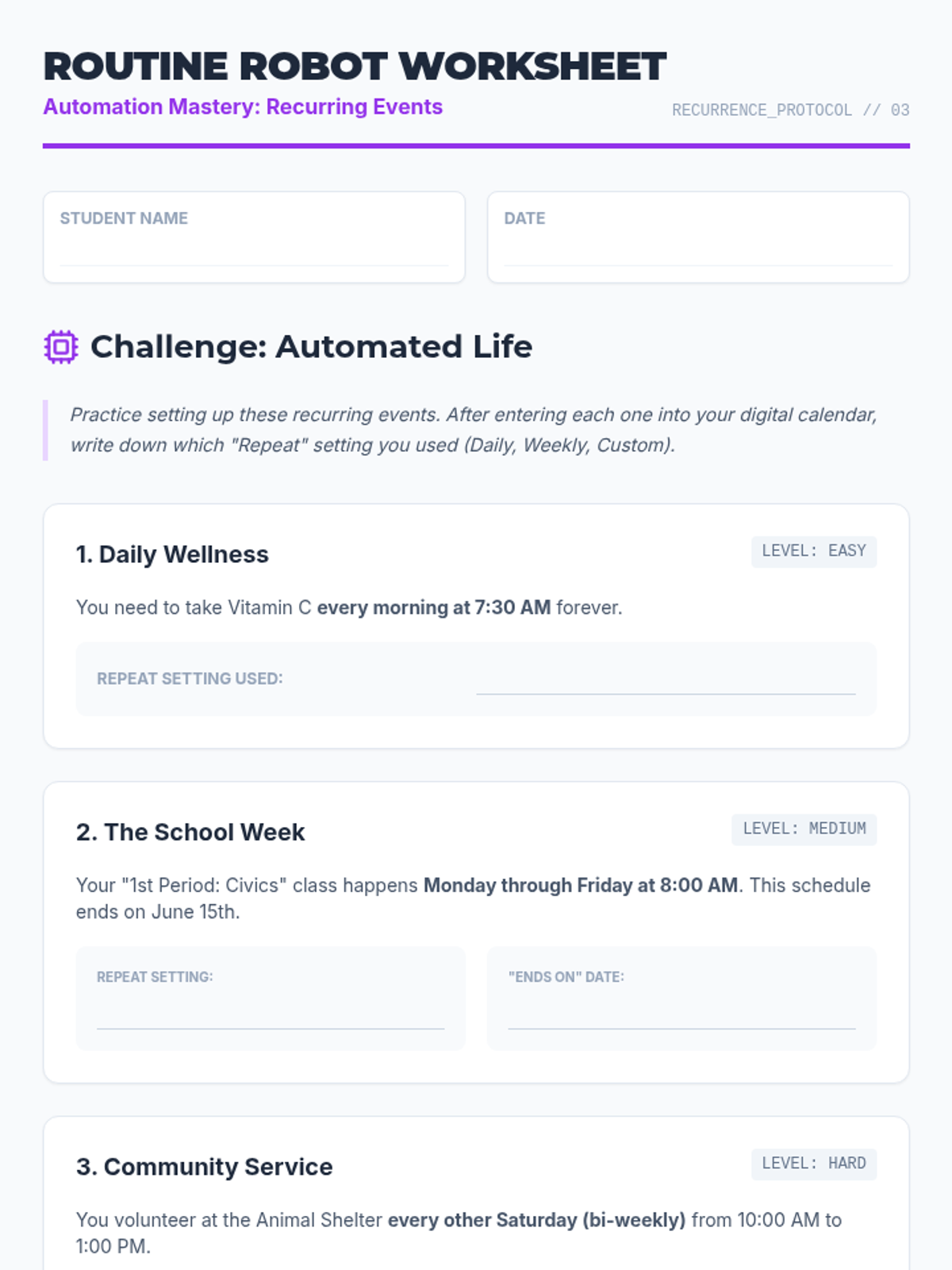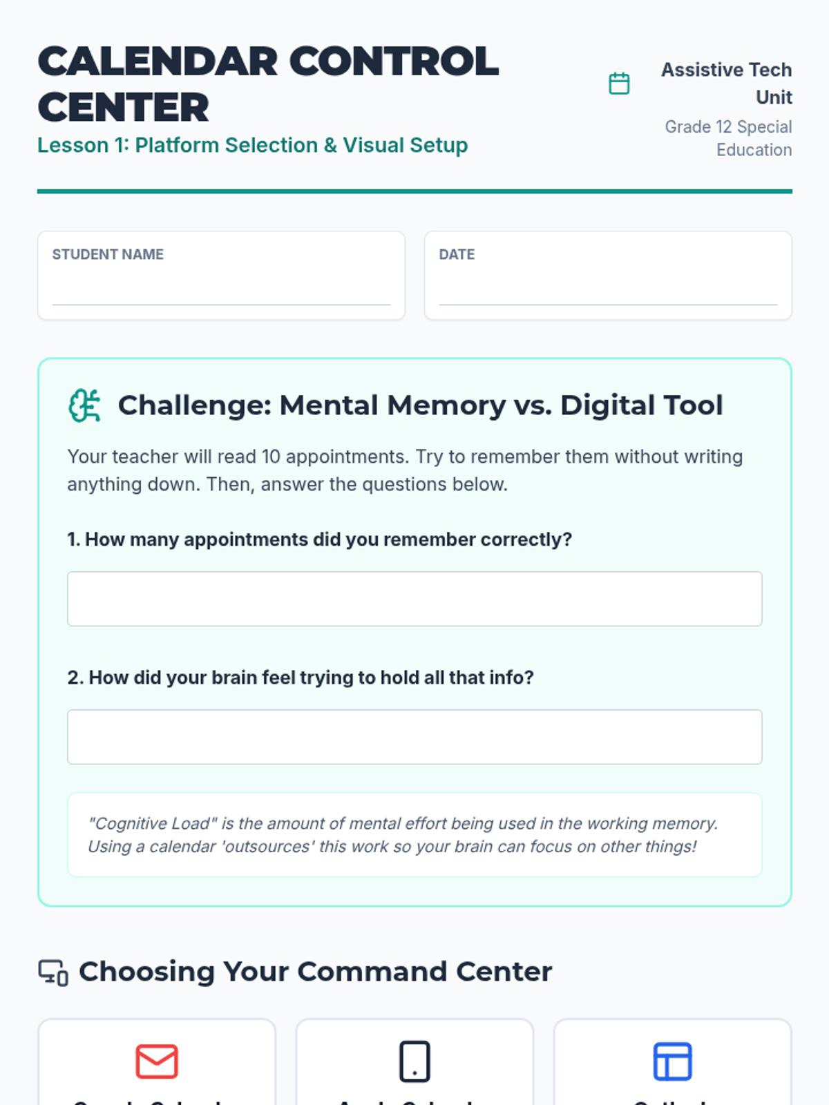 A foundational sequence for 12th-grade students to master digital calendar management as an assistive technology tool, focusing on reducing cognitive load and increasing independence.