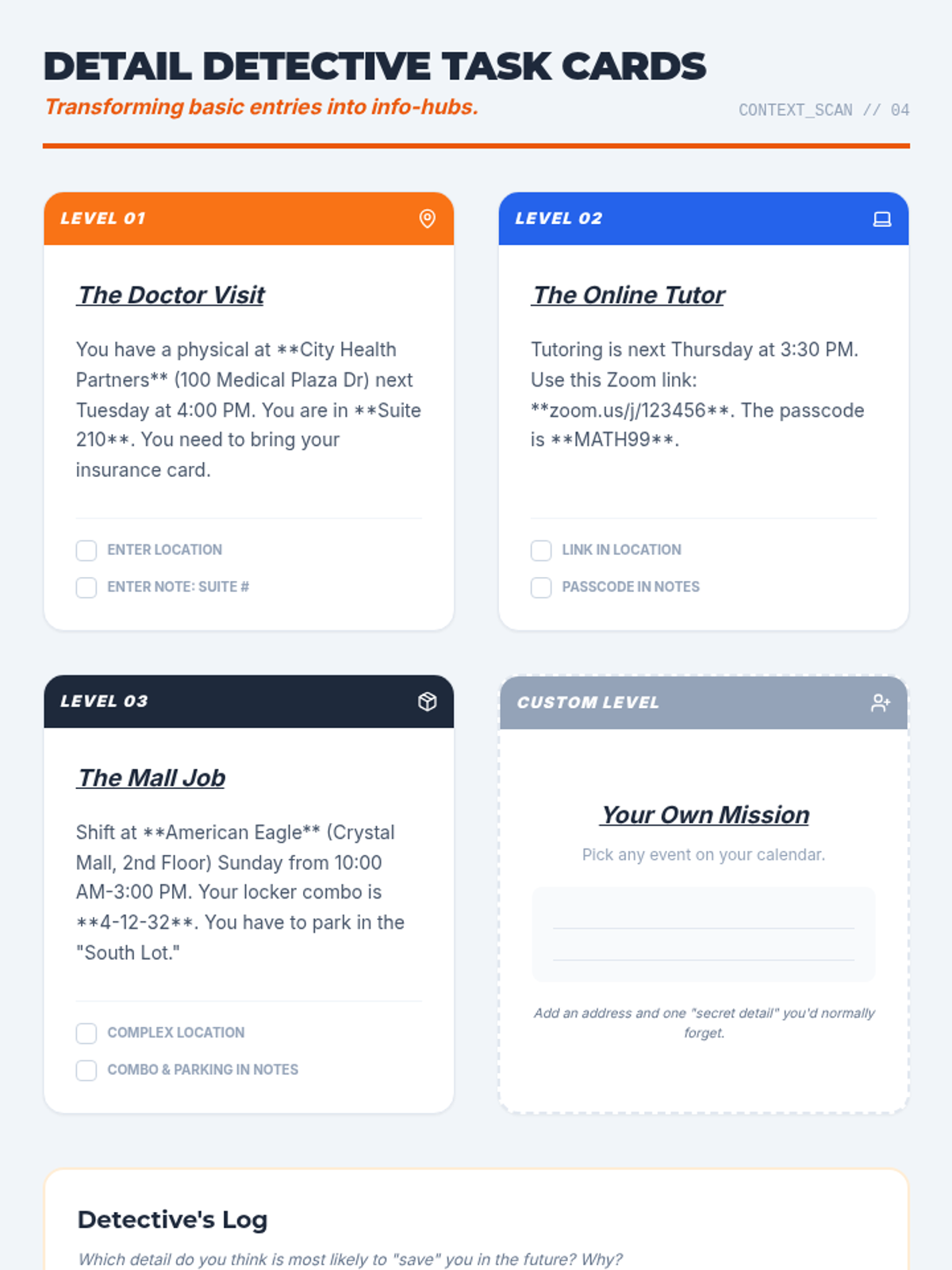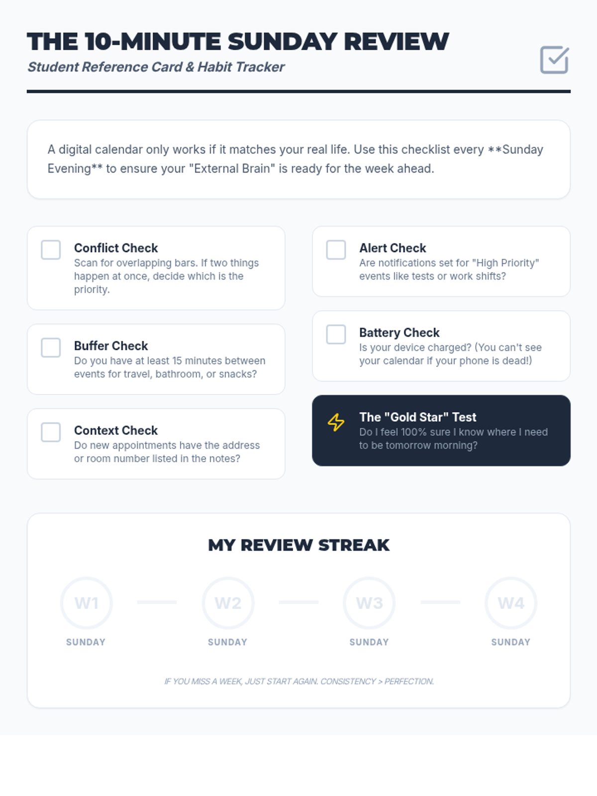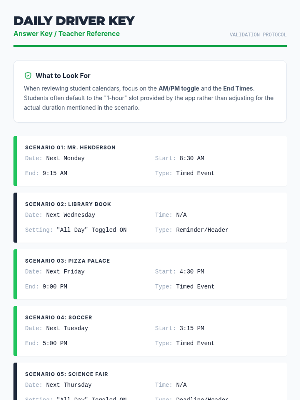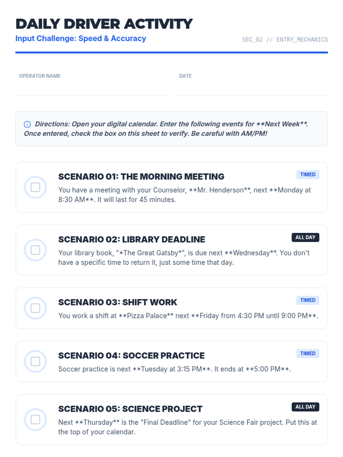 A foundational sequence for 12th-grade students to master digital calendar management as an assistive technology tool, focusing on reducing cognitive load and increasing independence.