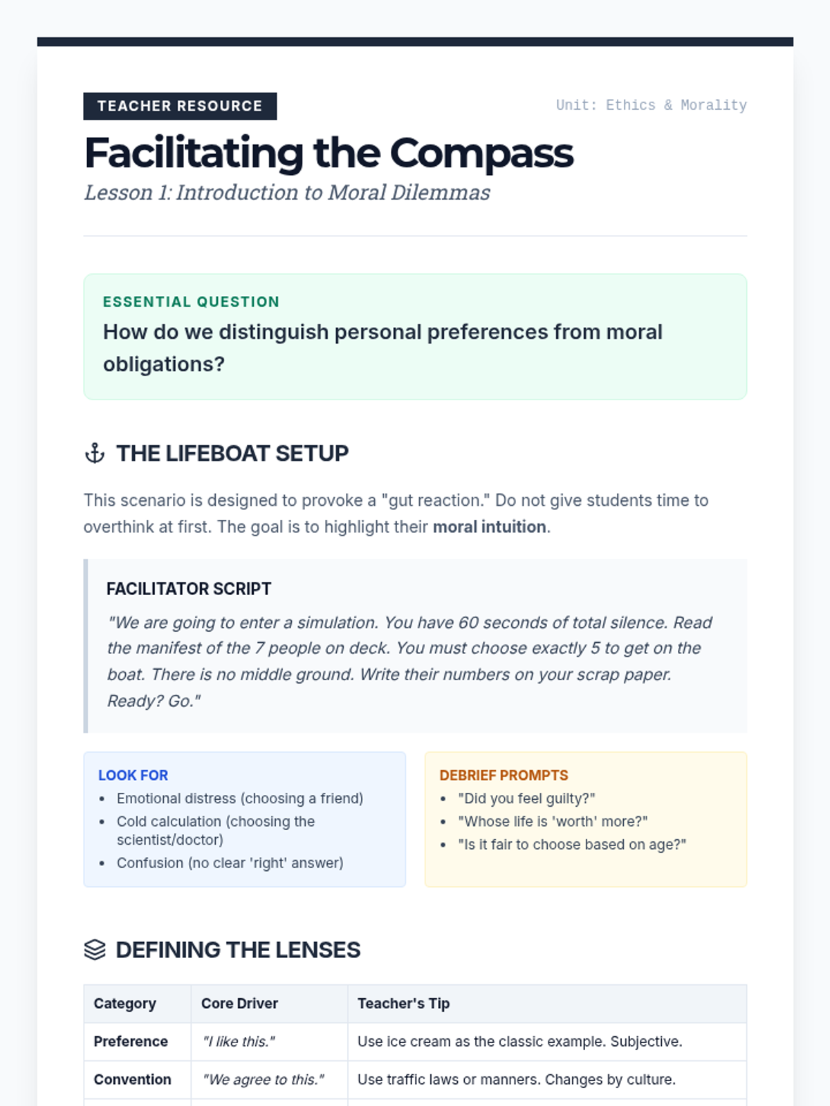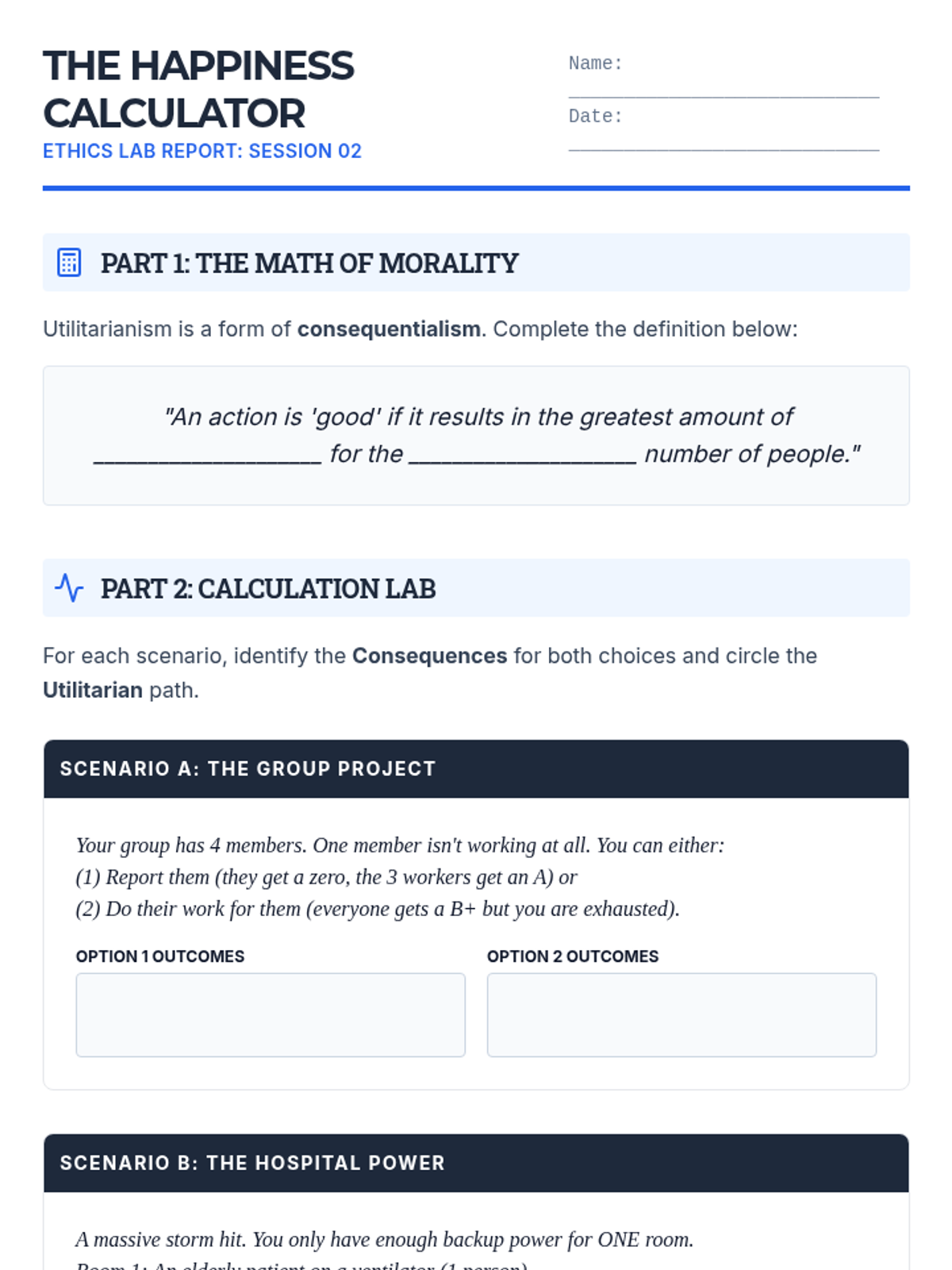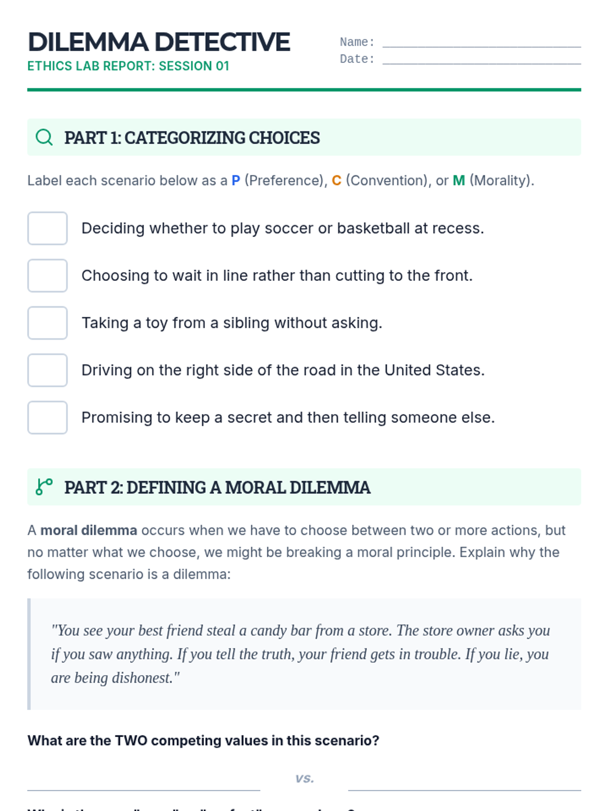 A comprehensive introduction to moral philosophy for middle schoolers, exploring utilitarianism, deontology, and virtue ethics through engaging thought experiments and real-world dilemmas.