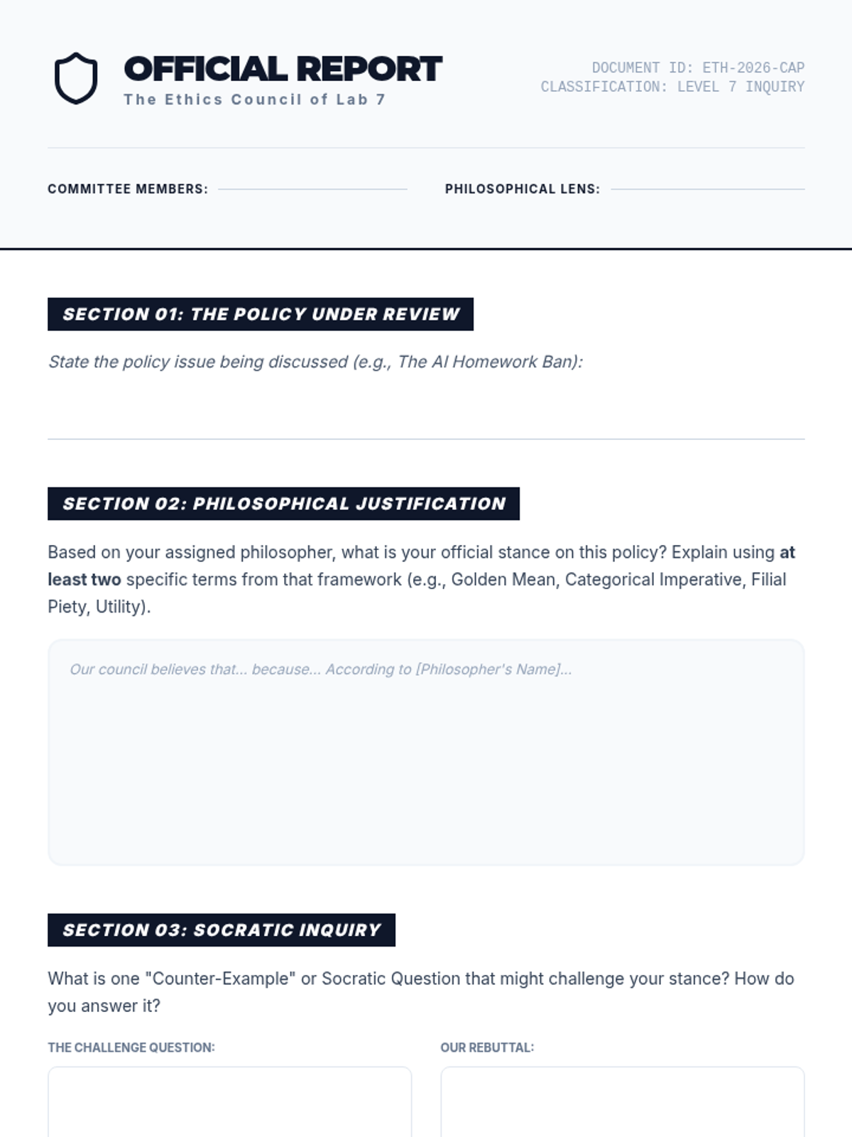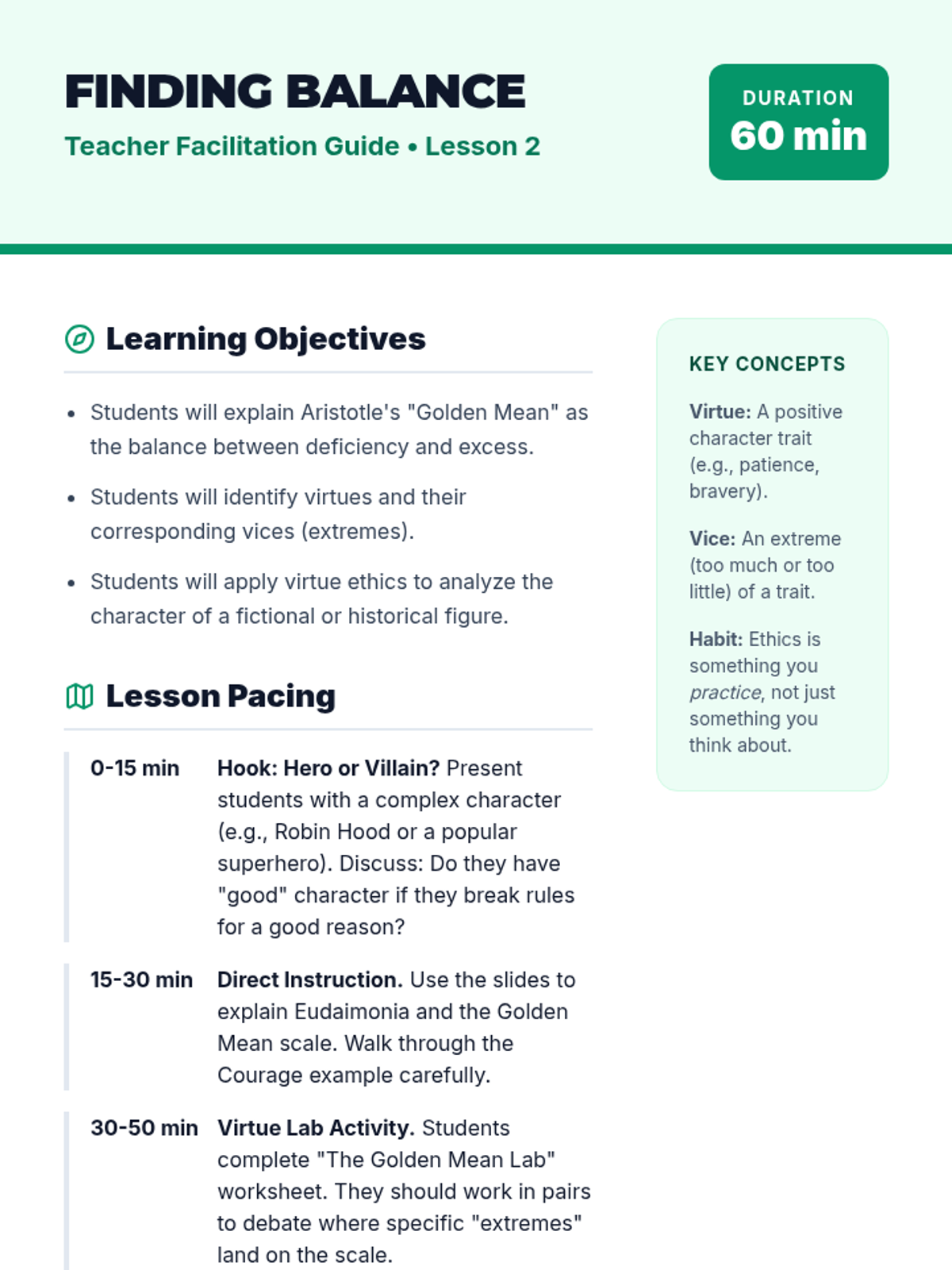 A foundational ethics sequence for 7th graders exploring Western and Eastern philosophical frameworks through inquiry, case studies, and real-world application.