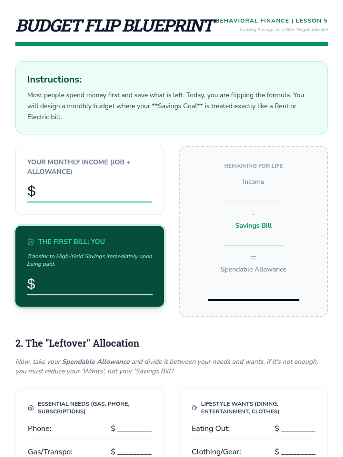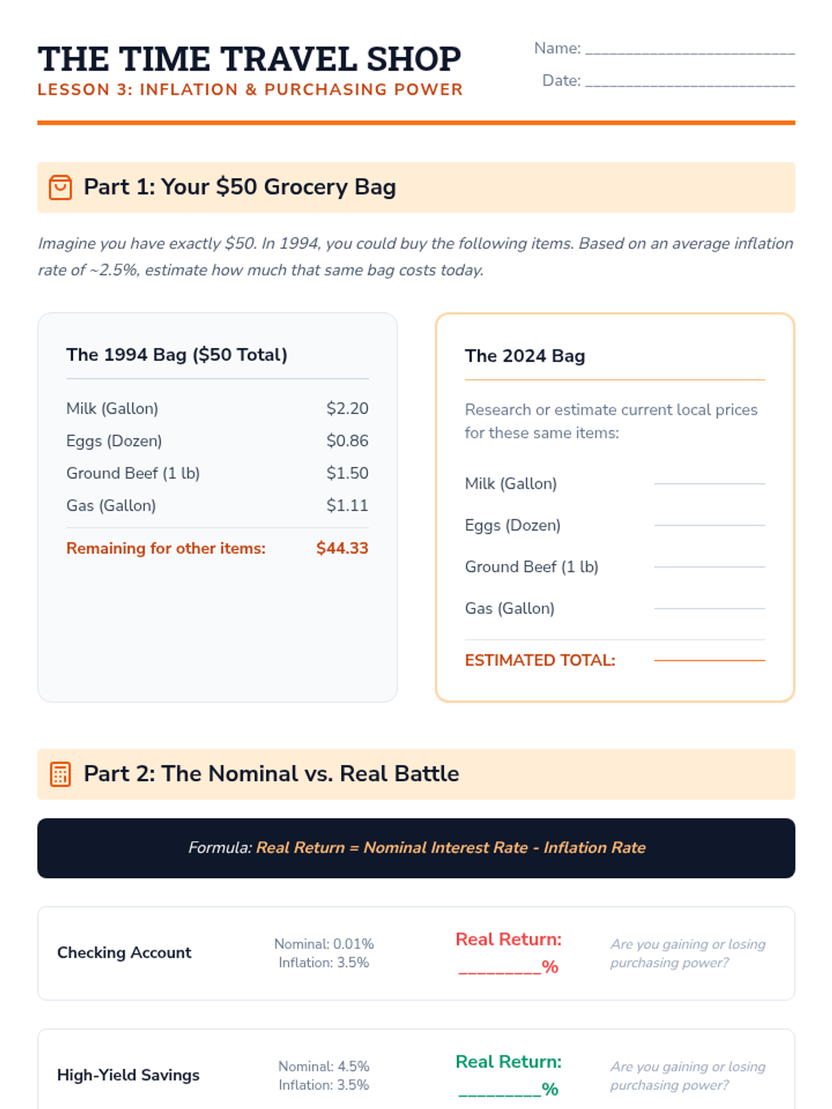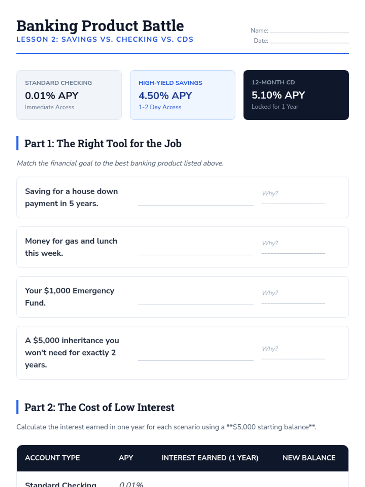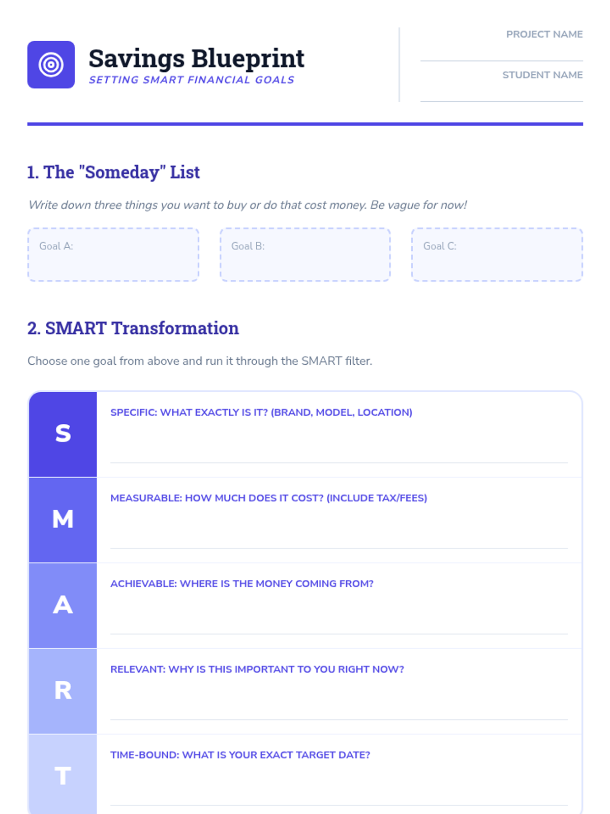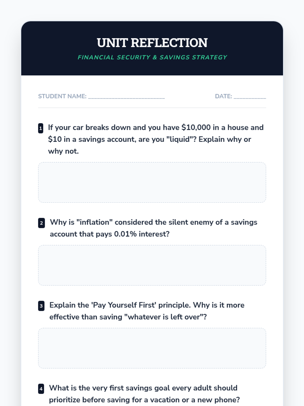 This sequence introduces 9th-grade students to the essentials of saving and liquidity. It covers emergency funds, banking products, the impact of inflation on purchasing power, SMART goal setting, and the behavioral strategy of 'paying yourself first' to build long-term financial security.