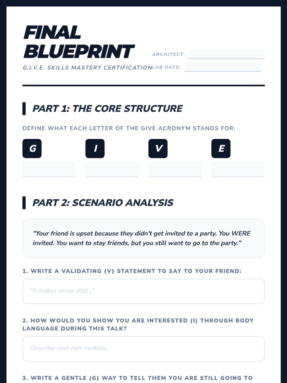 A comprehensive introduction to the GIVE skill set (Gentle, Interested, Validate, Easy manner) for 7th-grade students. This sequence focuses on building and maintaining healthy relationships through specific communication techniques and behavioral awareness.