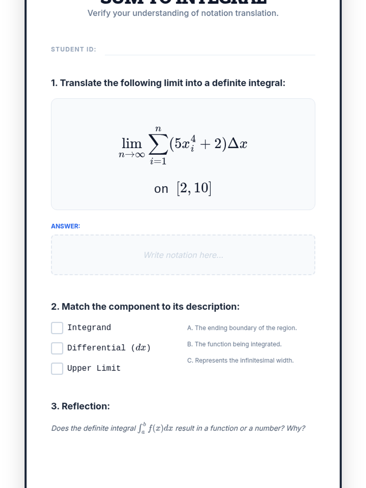 This sequence guides 12th-grade students from the conceptual understanding of area as accumulation to the algebraic precision of the Fundamental Theorem of Calculus. Students explore the 'area problem', formalize approximations via Riemann sums, define the definite integral through limits, and culminate in applying the Fundamental Theorem.