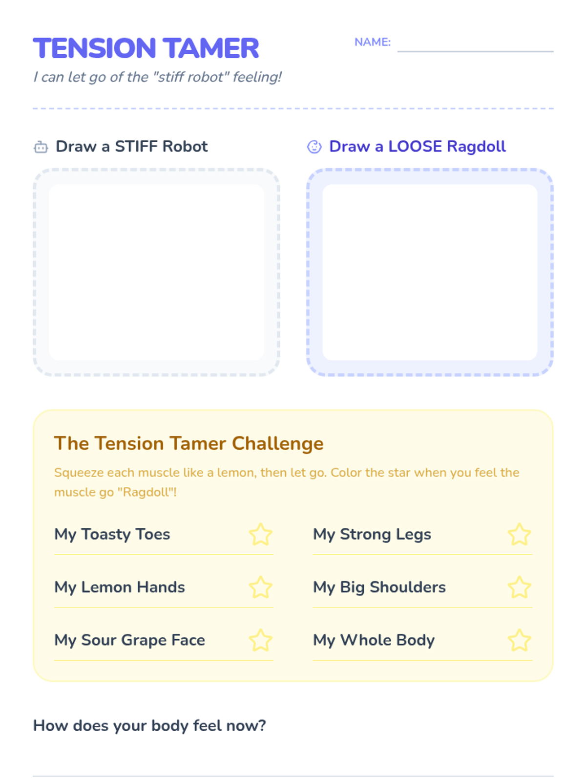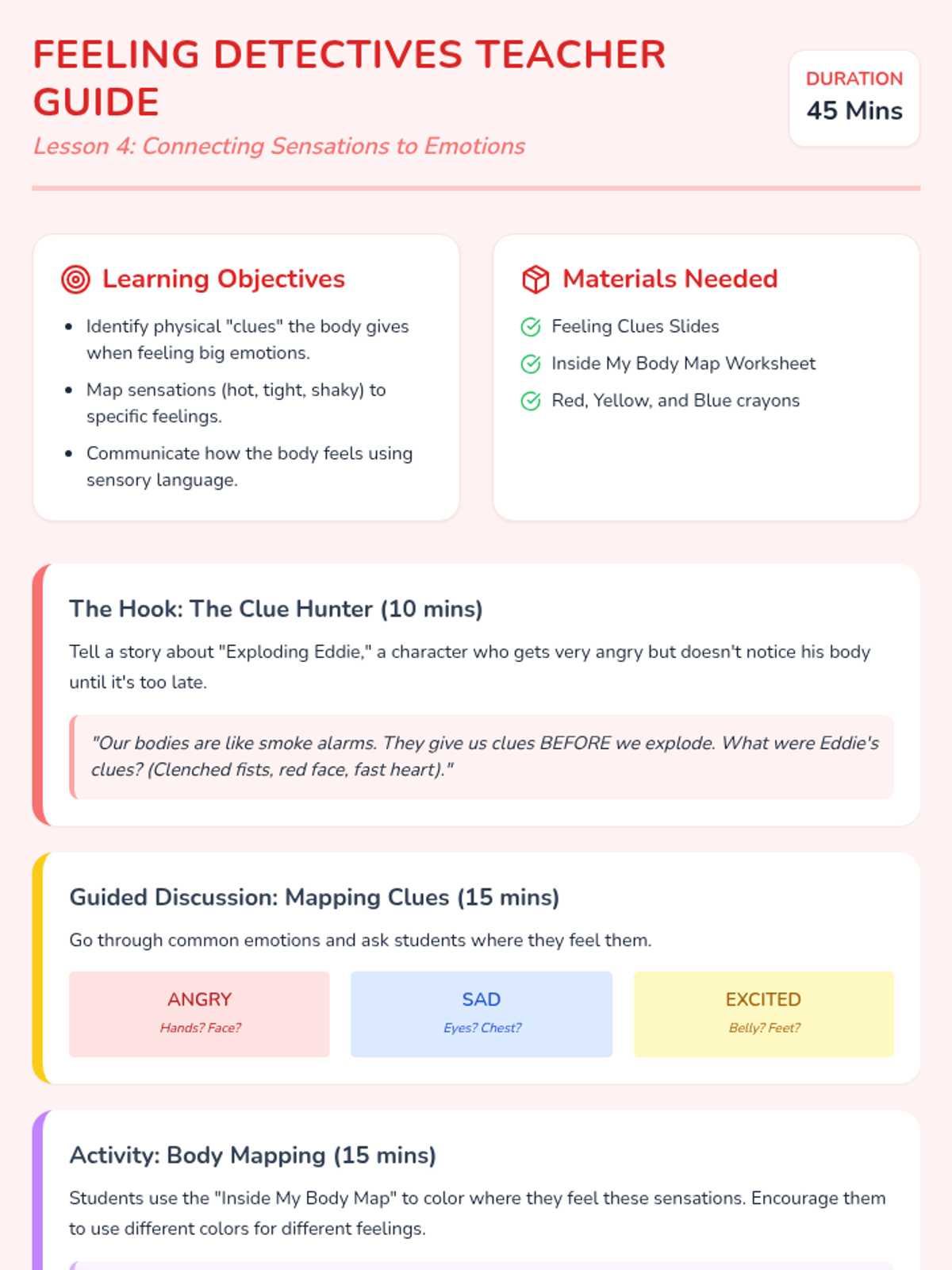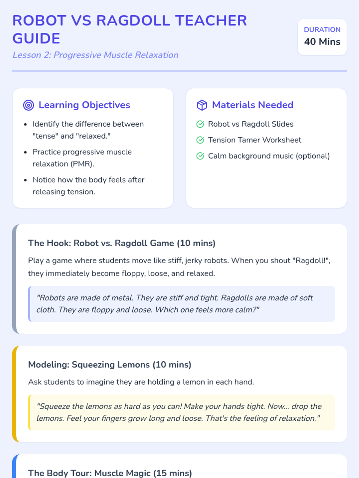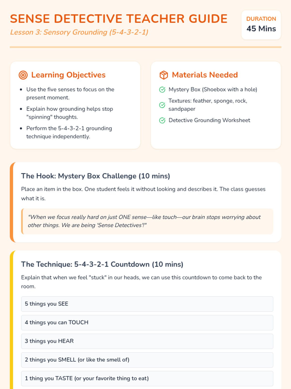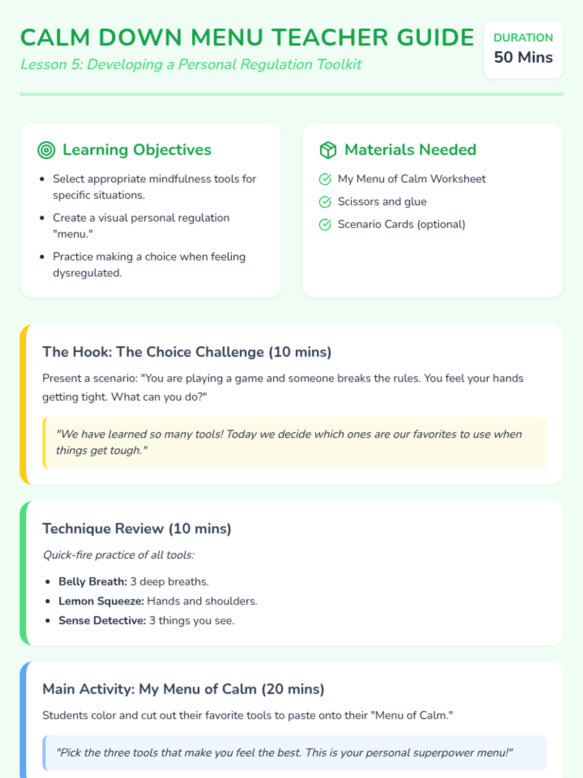 A 5-lesson sequence for 1st-grade students to learn fundamental mindfulness practices, including belly breathing, progressive muscle relaxation, sensory grounding, and emotional awareness, culminating in a personal 'menu' of calm-down strategies.