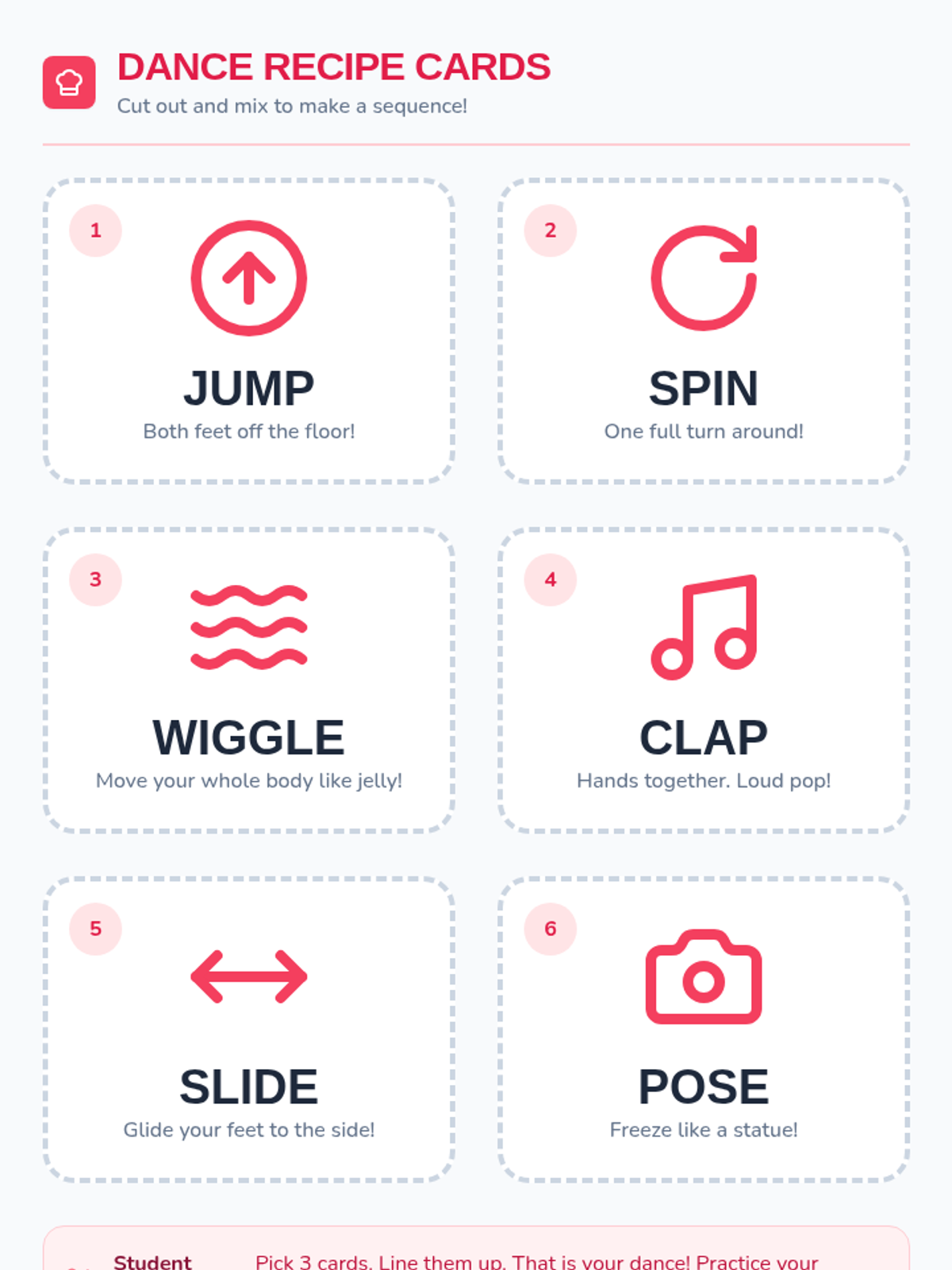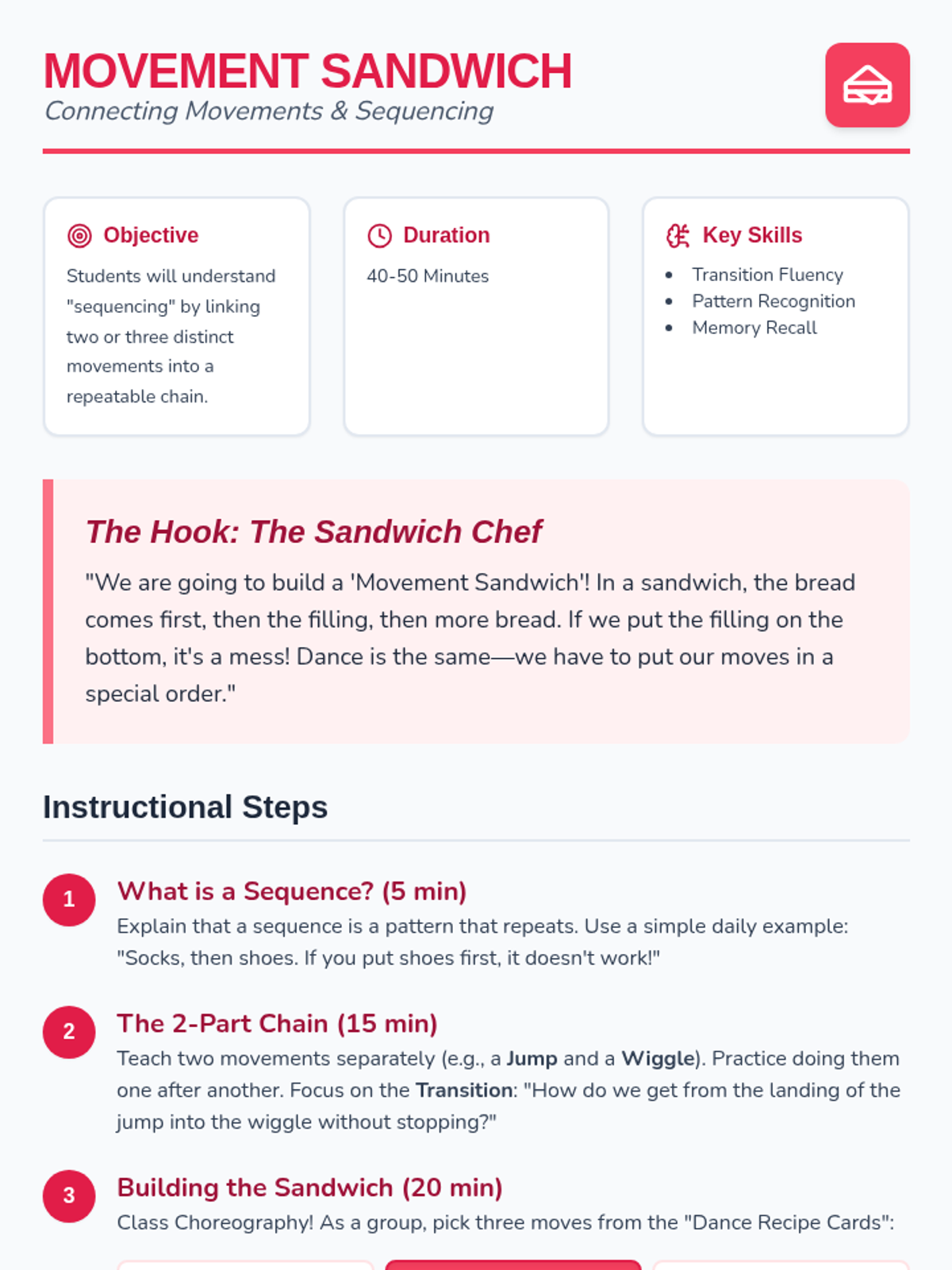 Kindergarten students explore the foundations of dance composition through creative play, investigating how to link movements into coherent patterns and sequences.
