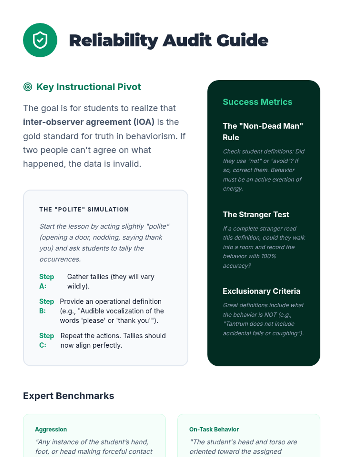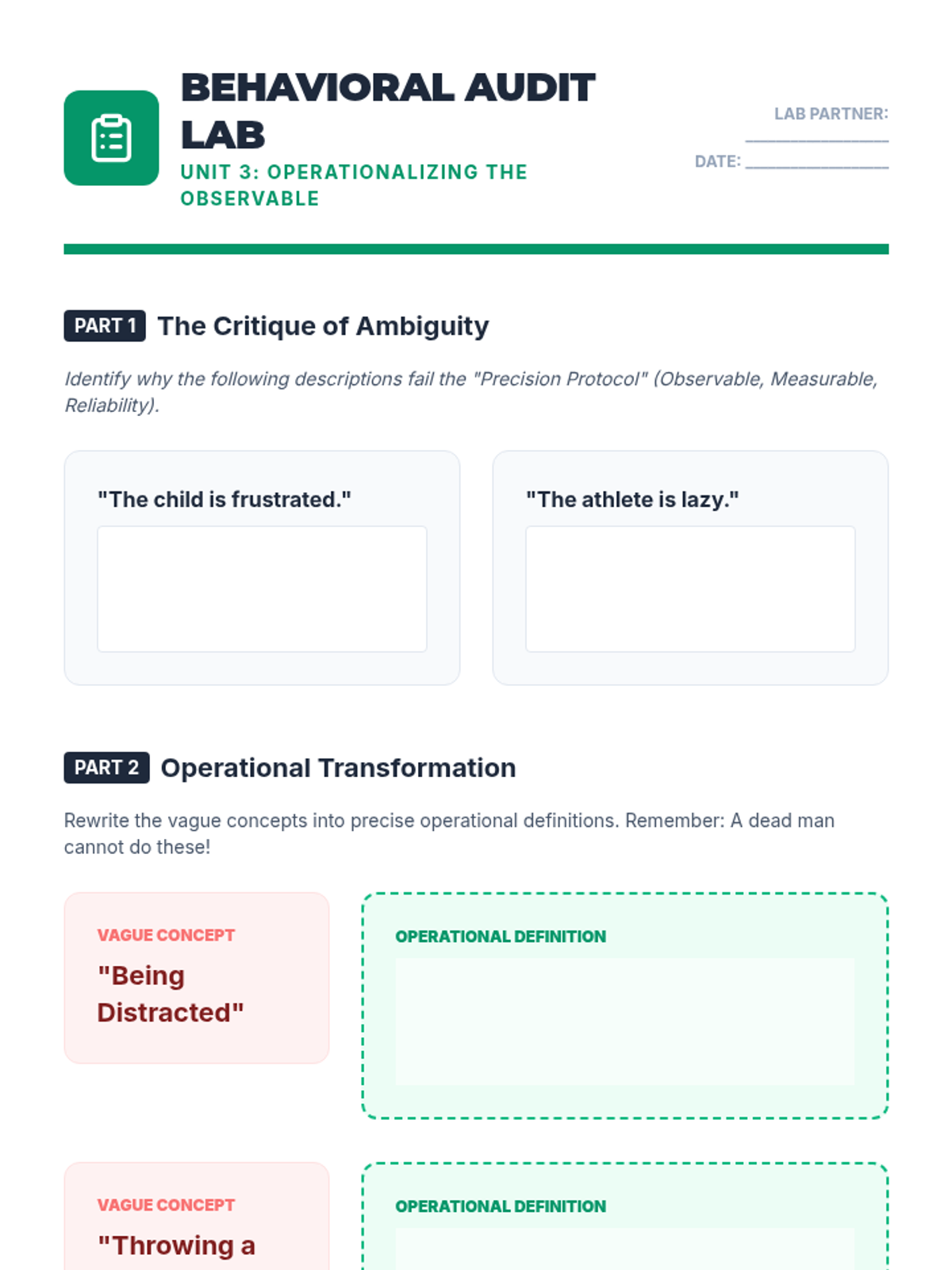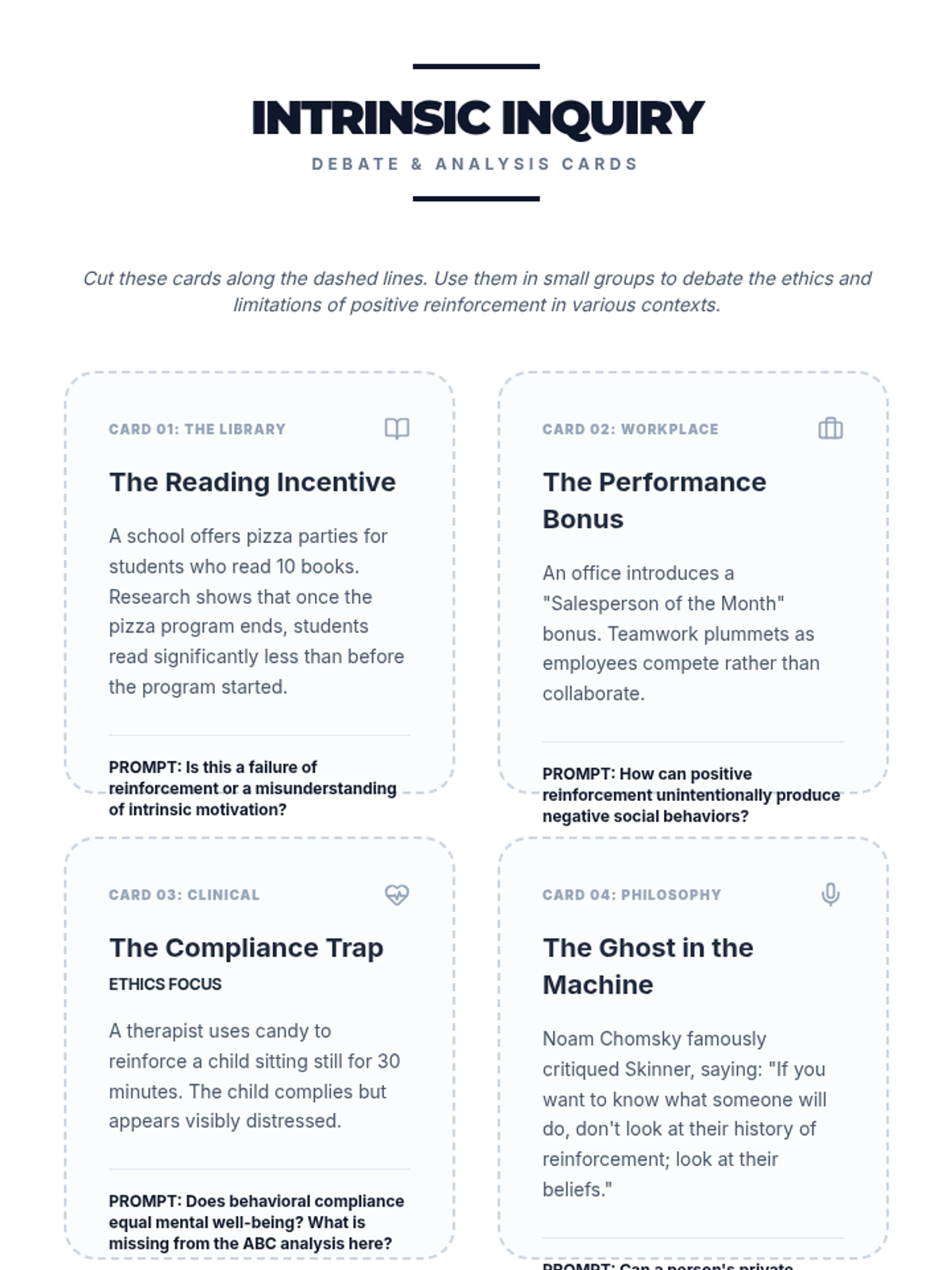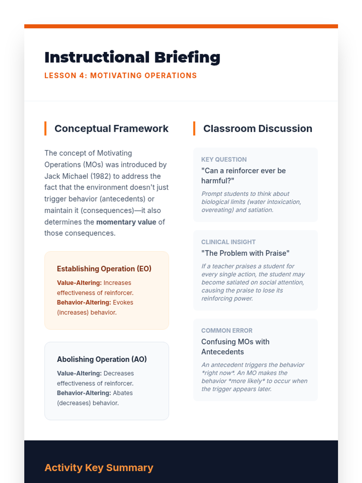 This sequence provides a rigorous introduction to operant conditioning for undergraduate students, focusing on the technical application of positive reinforcement. It covers the Three-Term Contingency, discrimination between consequences, operational definitions, motivational operations, and theoretical critiques.
