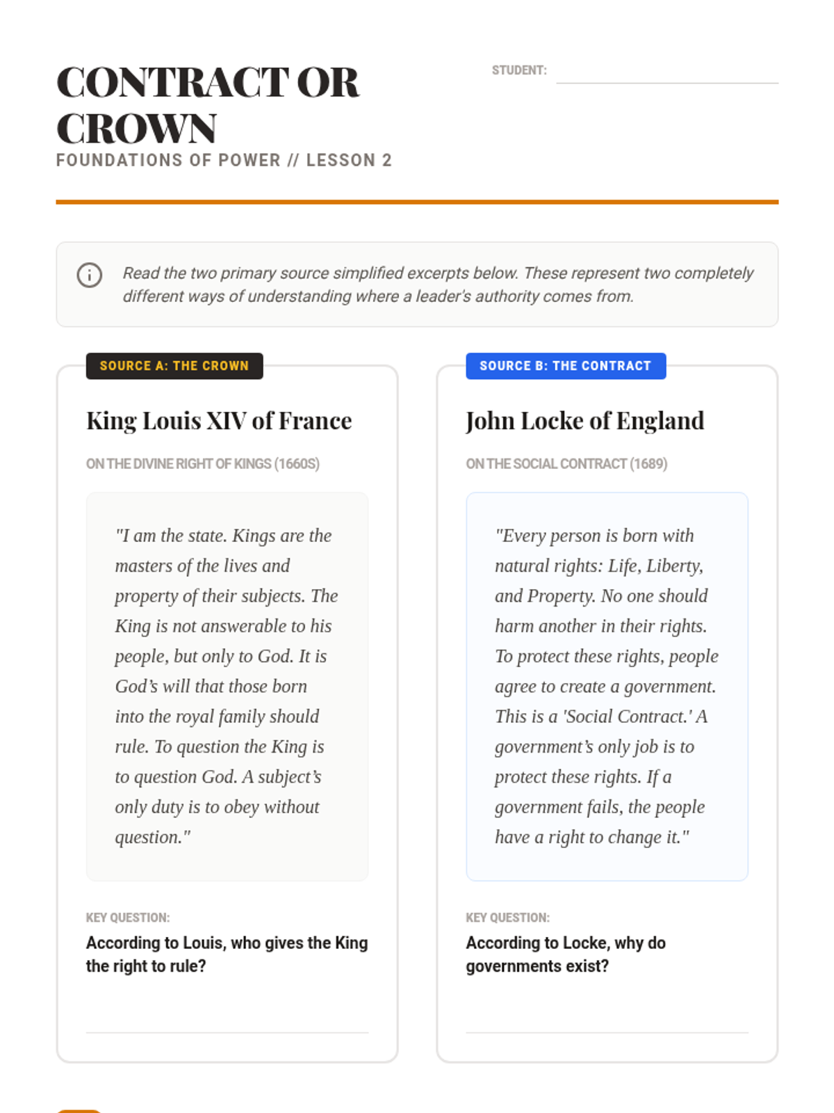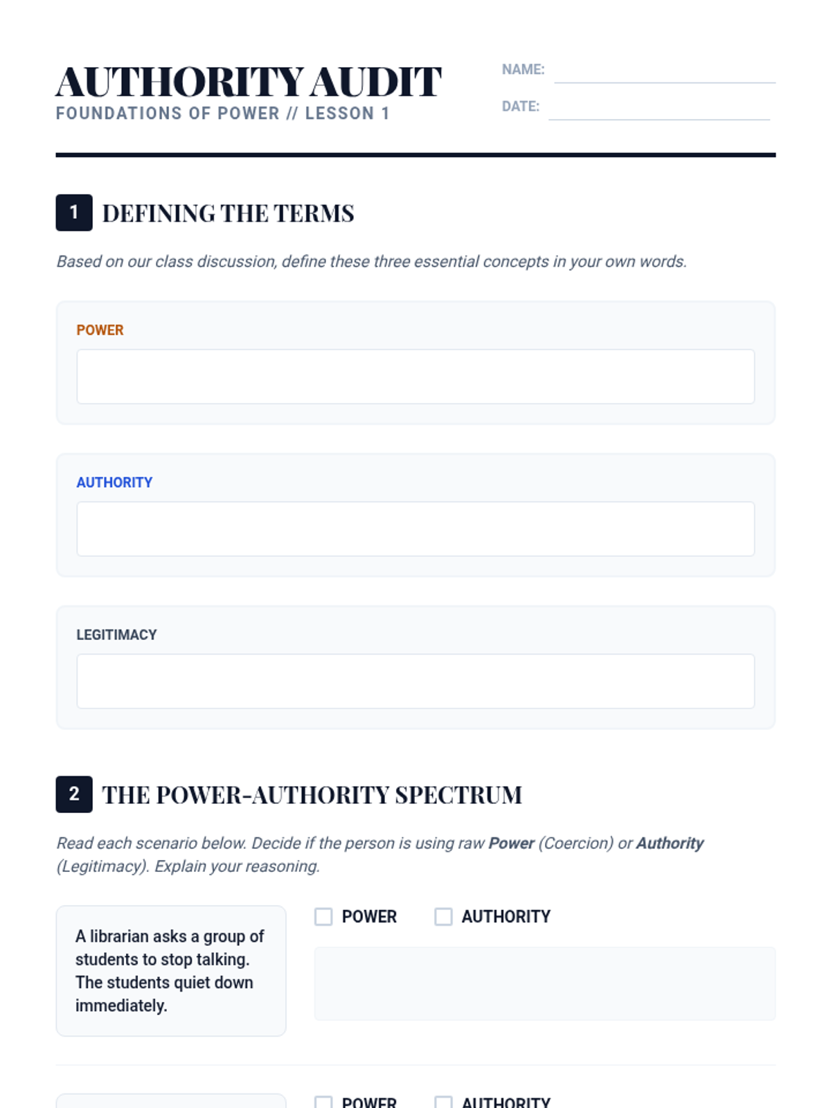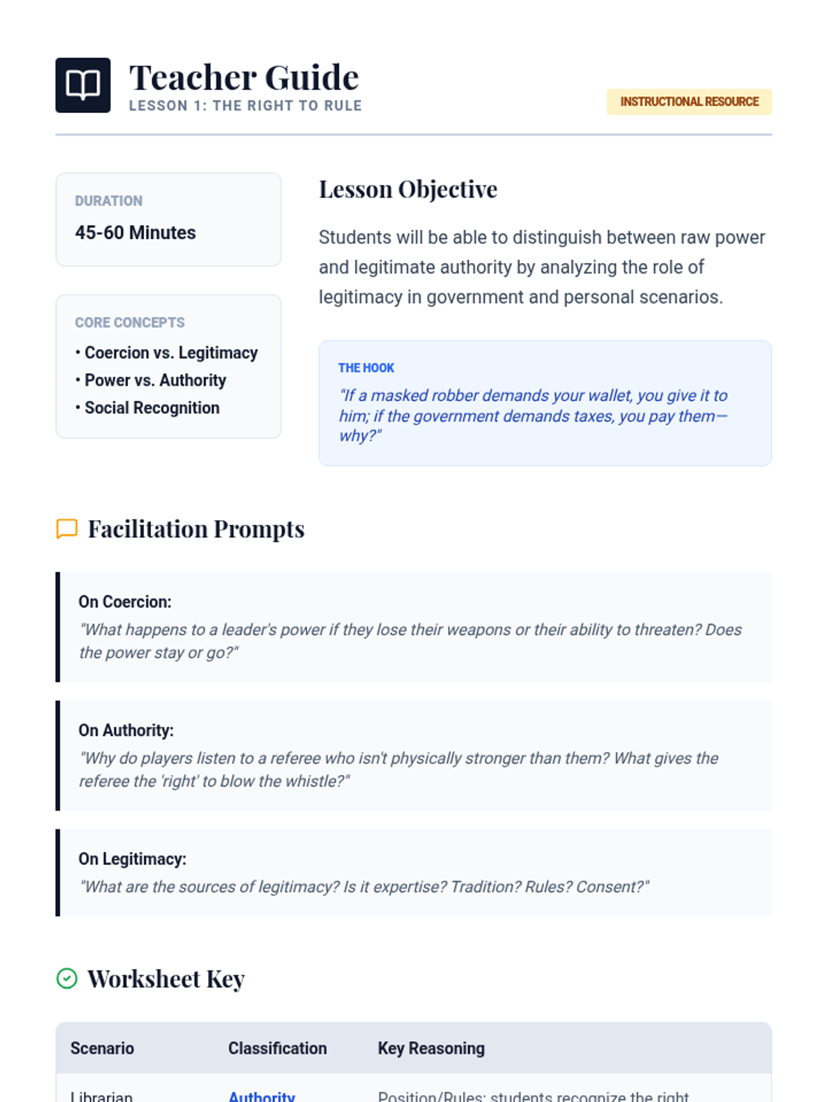 This unit explores the philosophical foundations of government, focusing on the distinction between coercive power and legitimate authority. Students examine the transition from divine right to social contract theory, investigate the Rule of Law, and analyze how constitutions map and limit power.