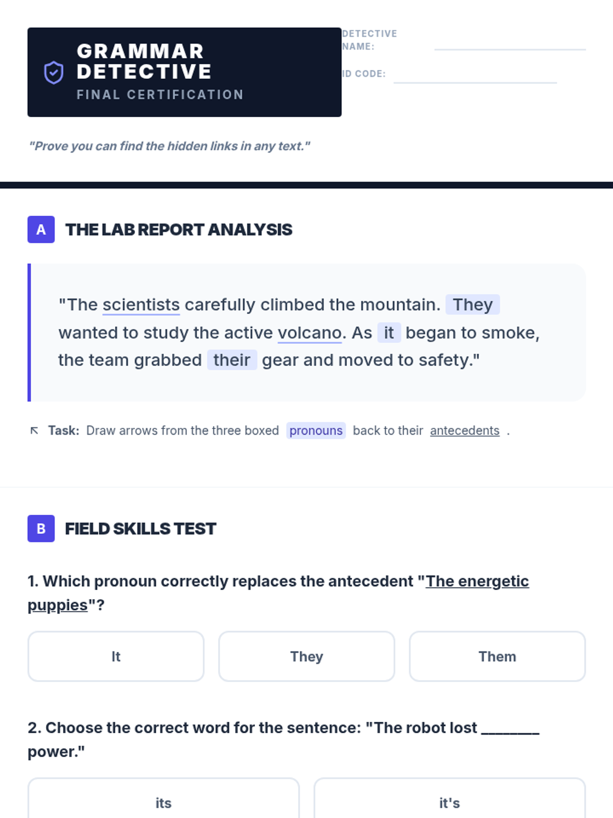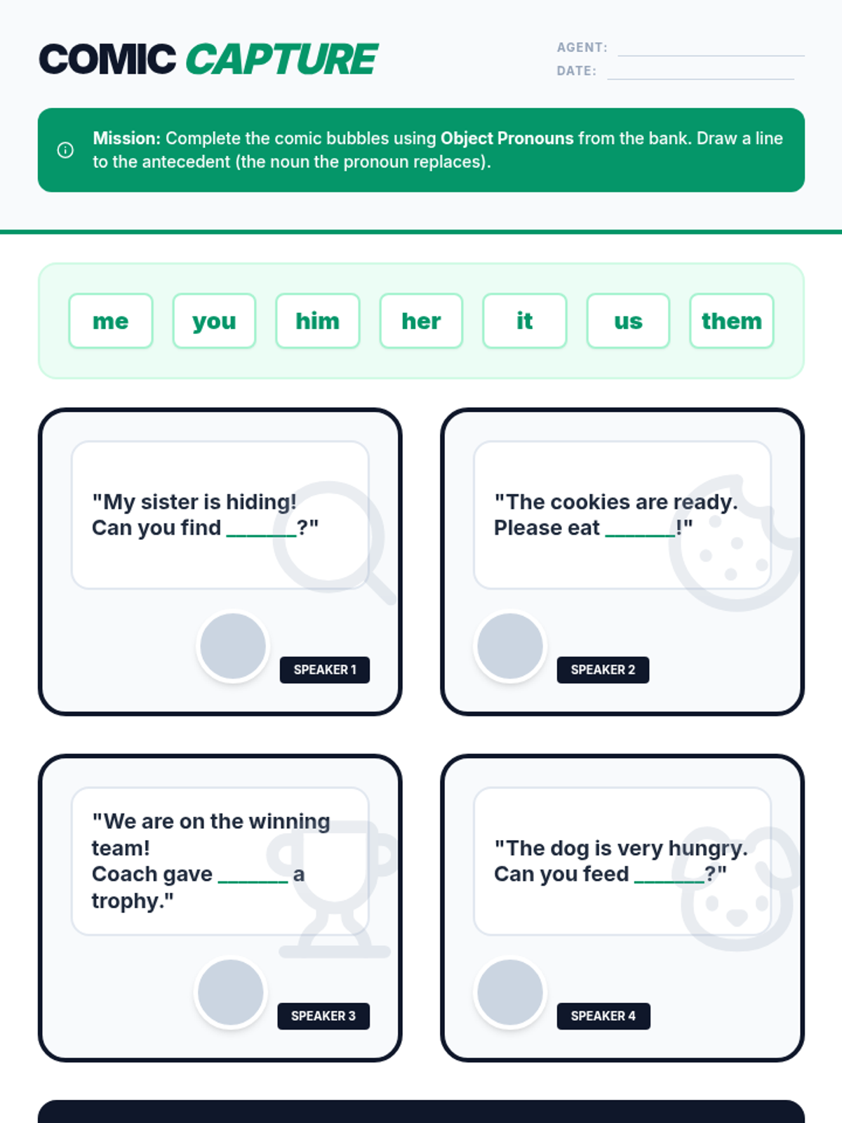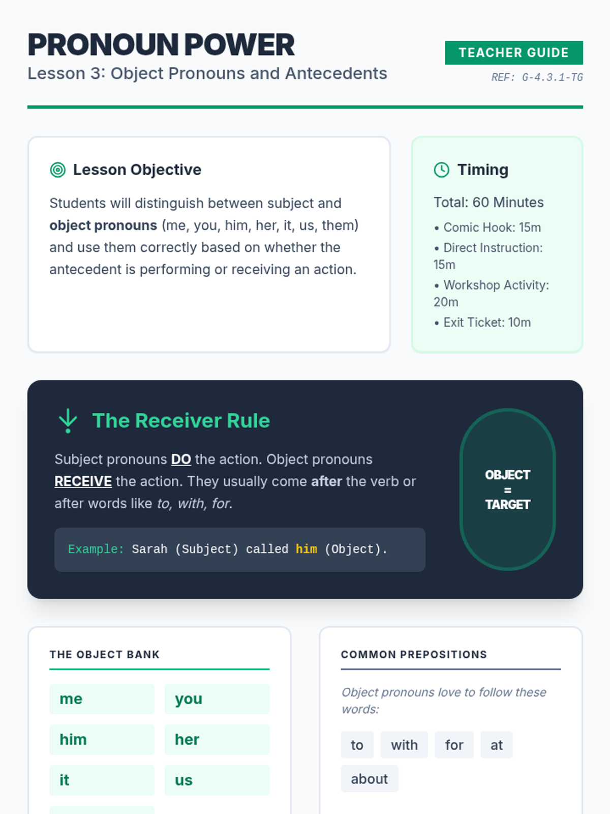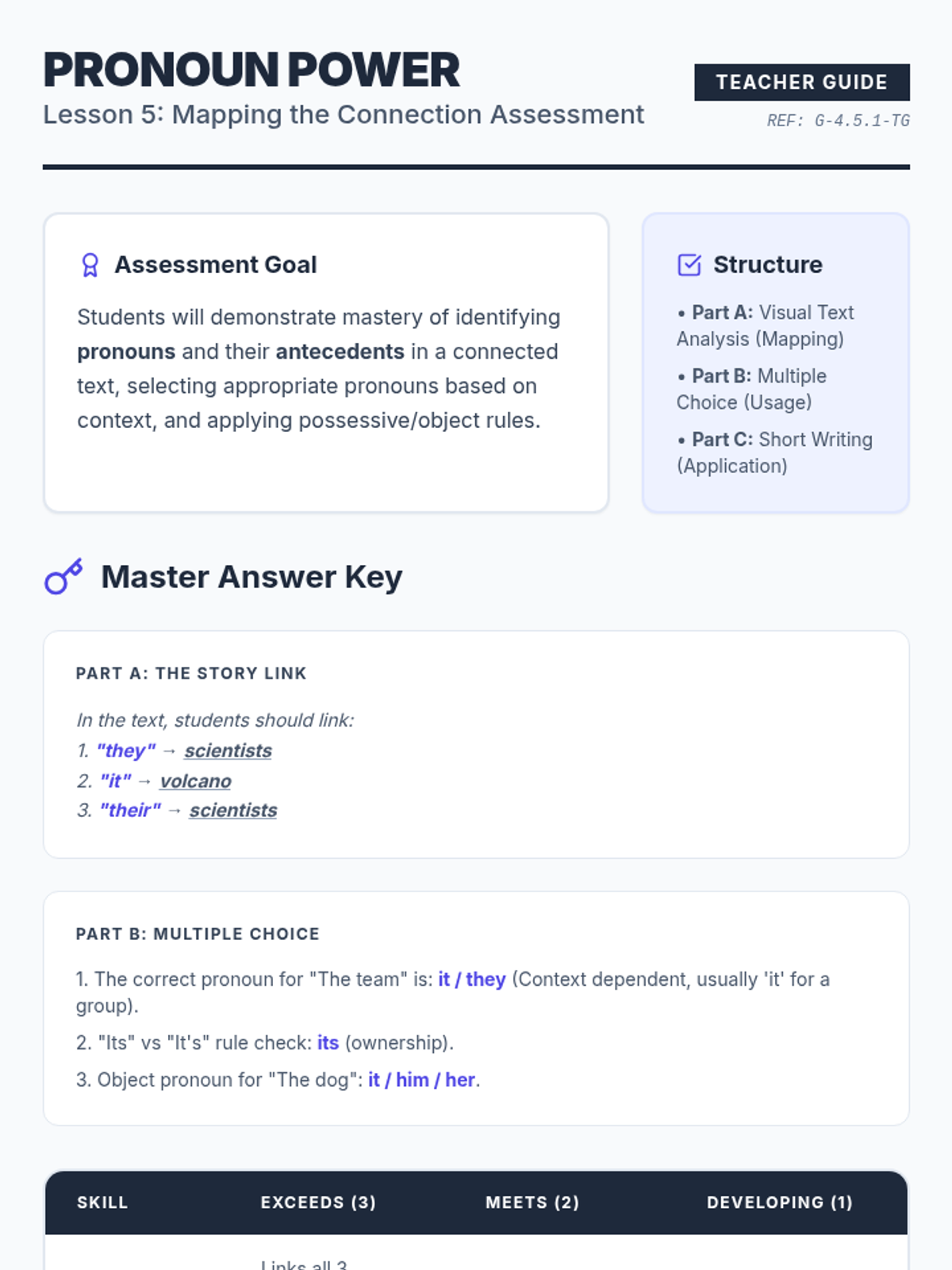 This 4th-grade grammar sequence teaches students how to identify and use pronouns and their antecedents. Through visual mapping and skill-building activities, students learn to create clear and concise sentences by establishing strong links between these two parts of speech.