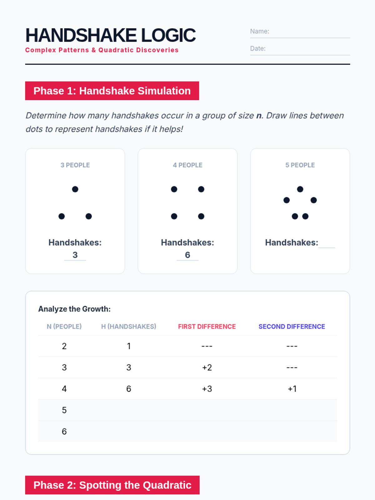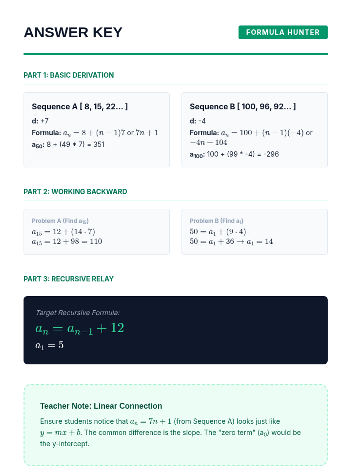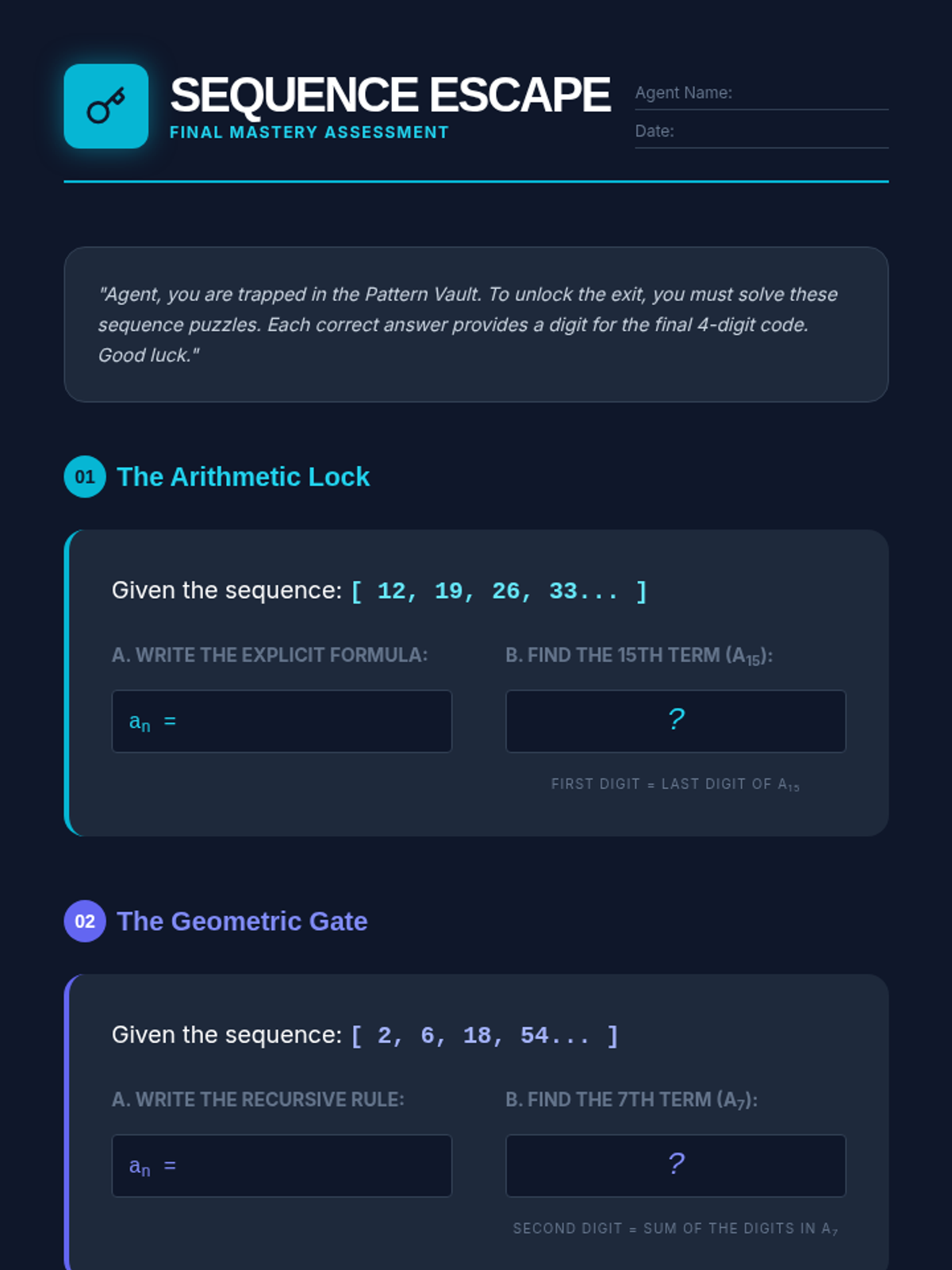 This sequence introduces students to arithmetic and geometric sequences, moving from visual patterns to formal algebraic formulas. Students explore the connections between sequences and linear or exponential functions, analyze complex non-standard patterns, and apply their knowledge in a culminating mastery assessment.
