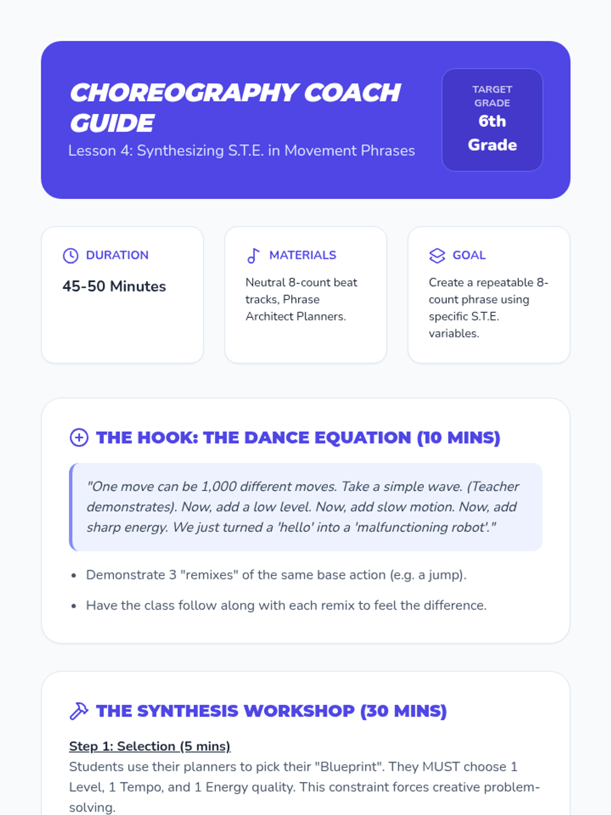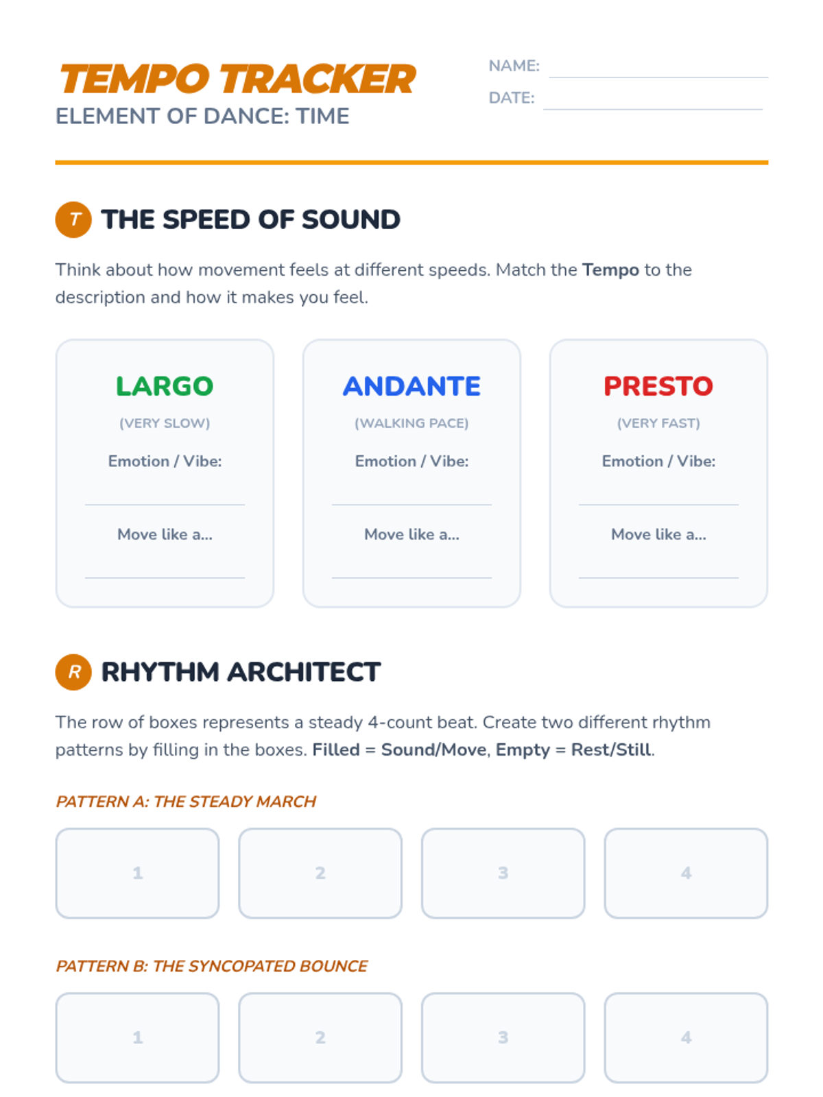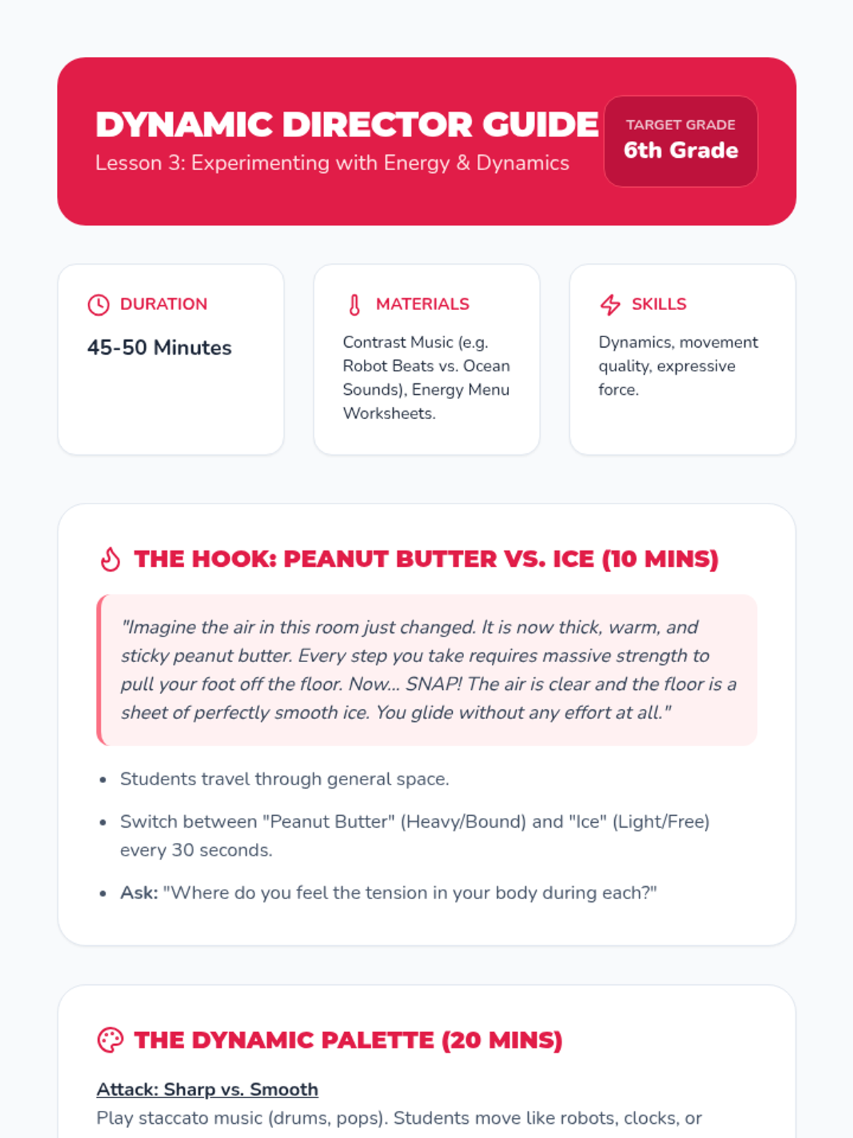 This sequence introduces students to the core building blocks of dance: Space, Time, and Energy. Students explore levels, pathways, tempo, rhythm, and dynamics to understand how movement conveys meaning and impact.