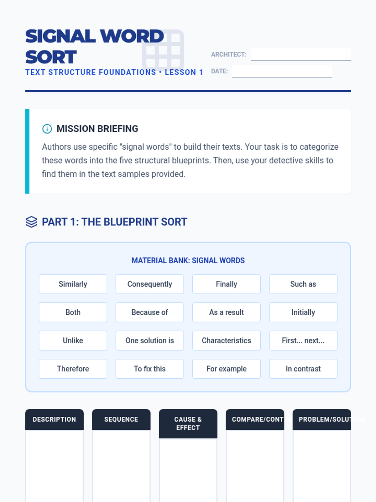 A comprehensive 5th-grade ELA sequence focused on identifying and analyzing the five primary informational text structures: description, sequence, cause and effect, compare and contrast, and problem and solution. Students move from signal word identification to complex analysis using graphic organizers.