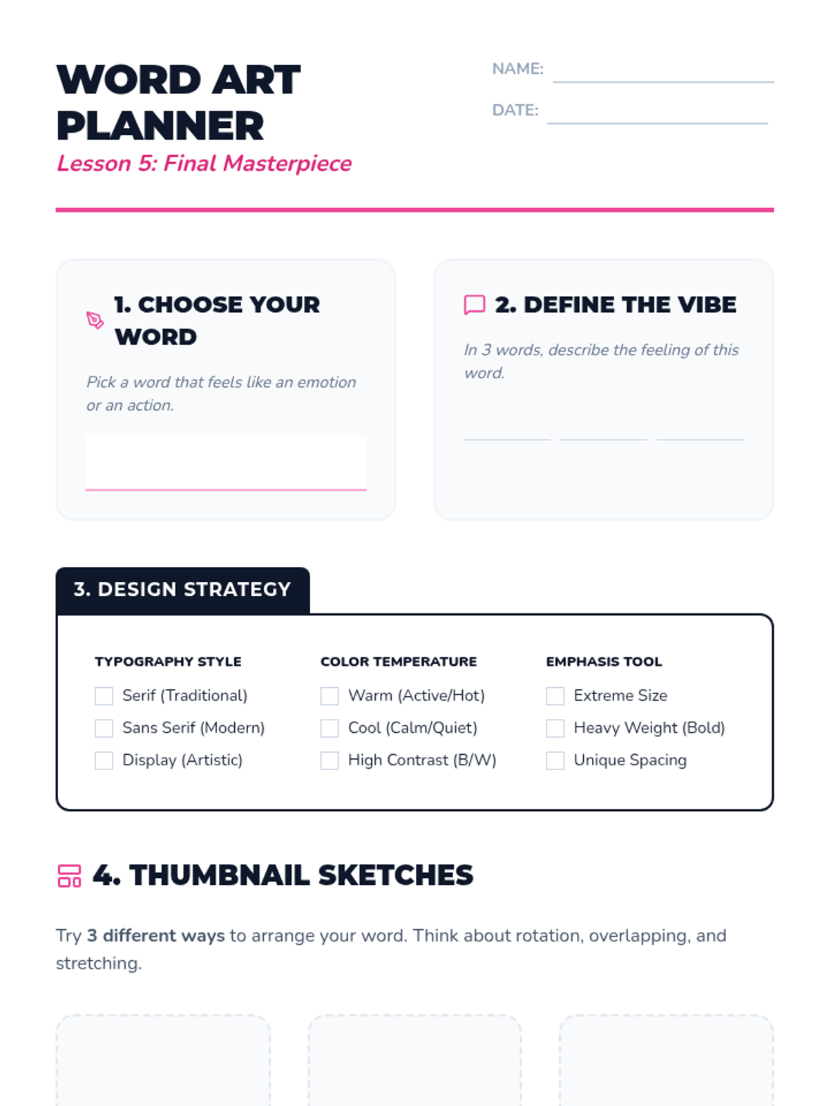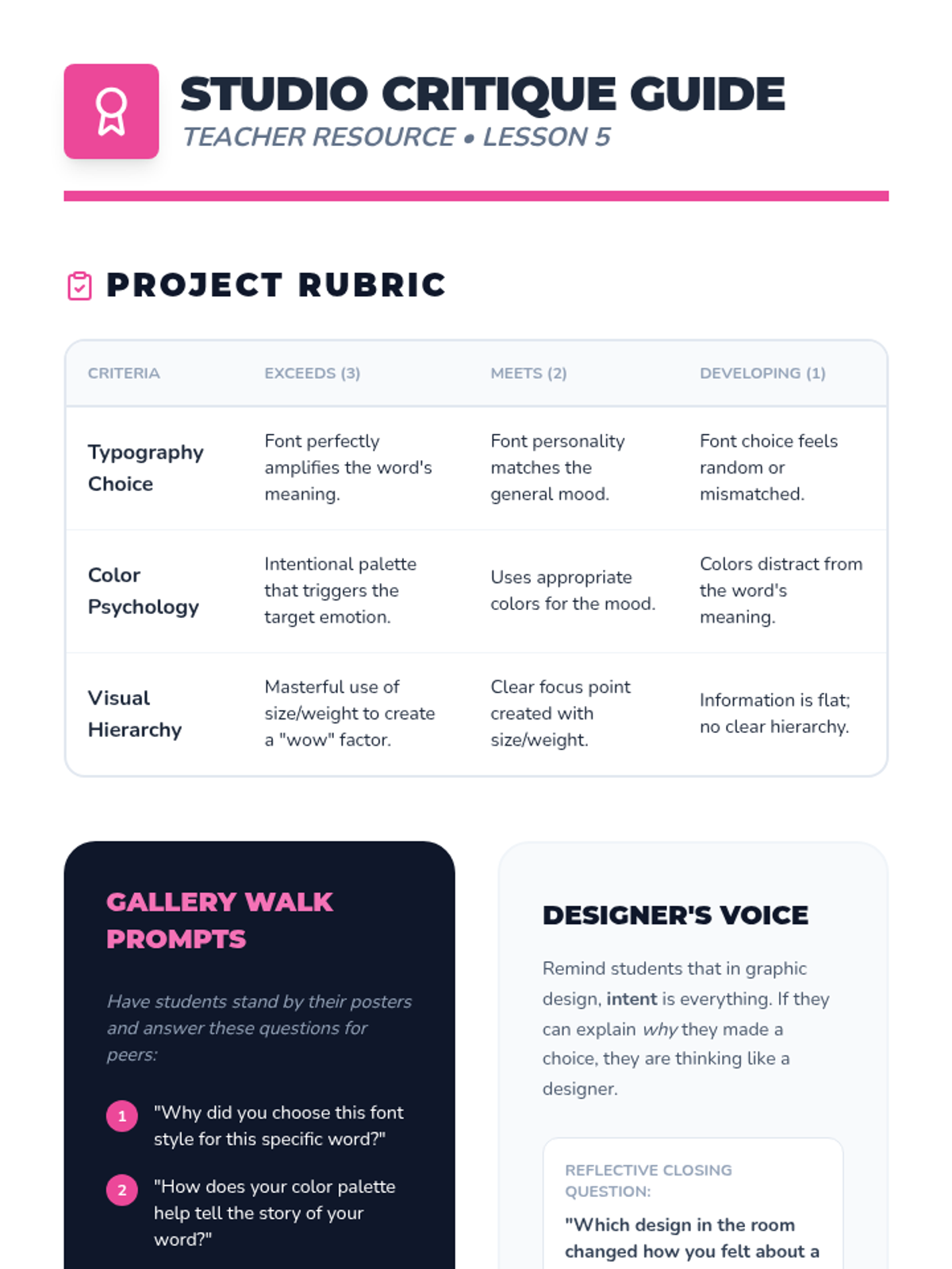 A 5-lesson sequence for 5th-grade students exploring the fundamentals of graphic design through typography, color theory, contrast, and visual hierarchy. Students learn to communicate emotions and messages effectively before creating a final expressive typographic poster.
