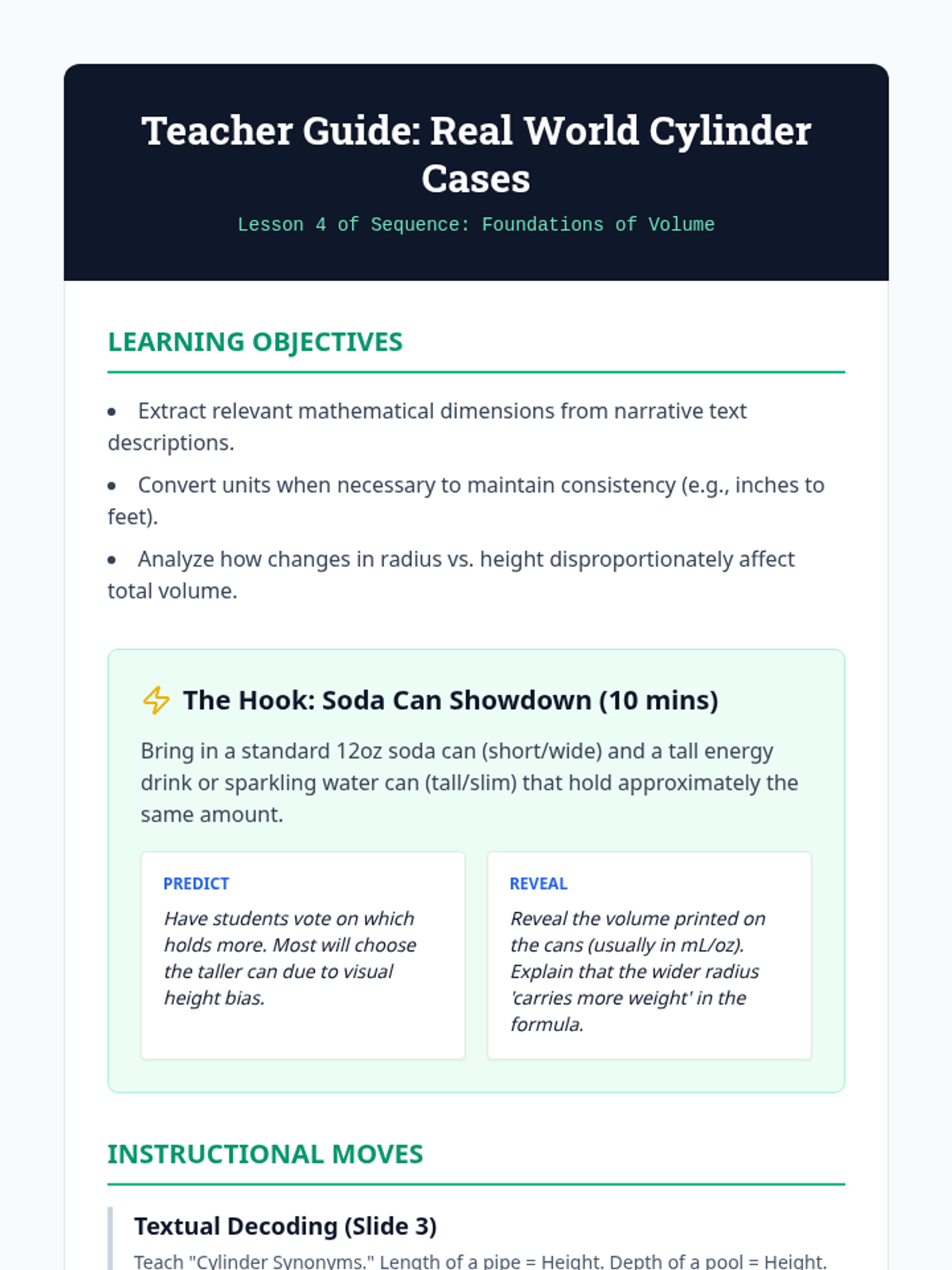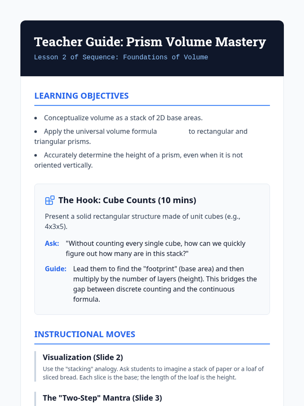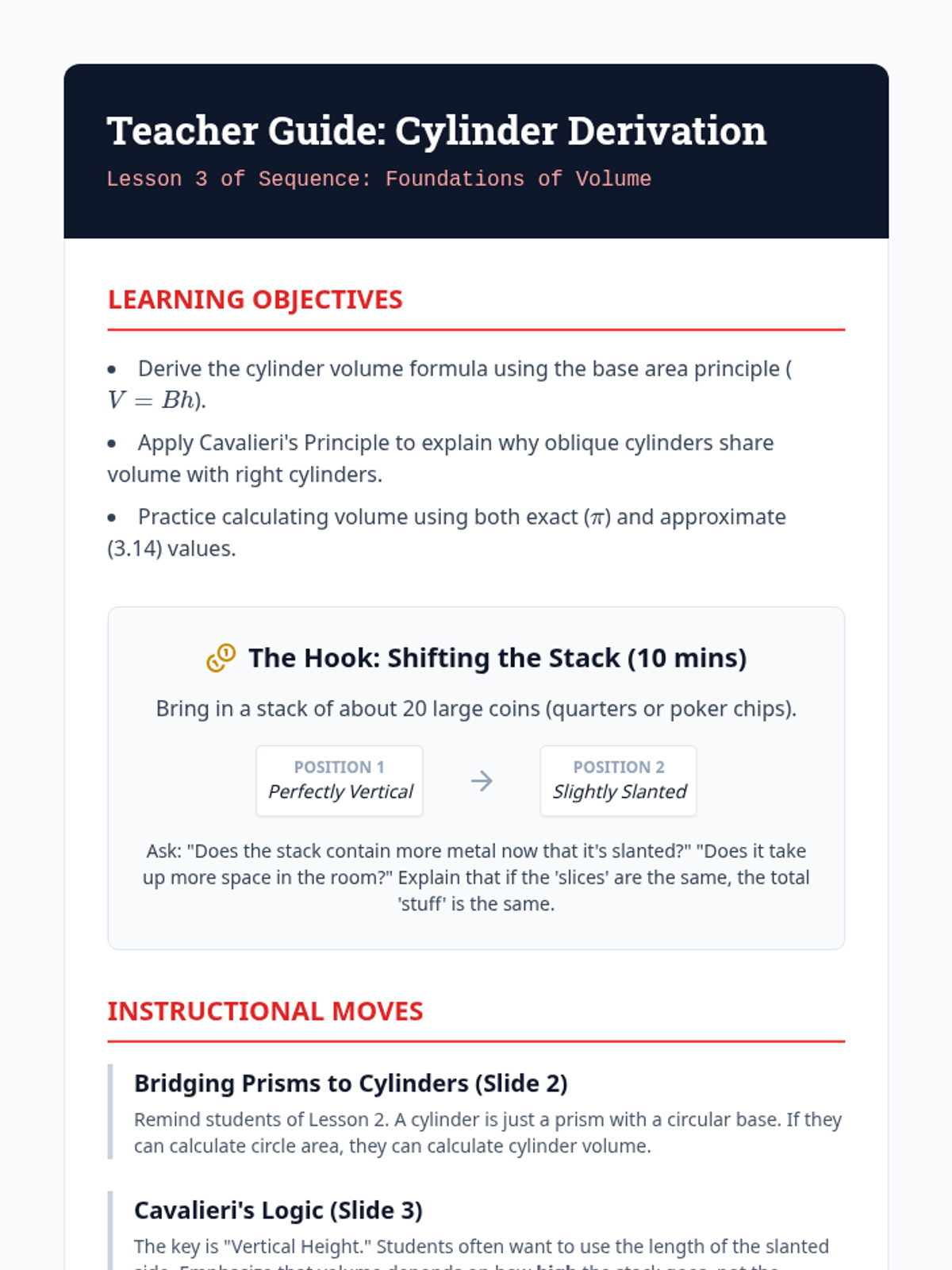 This sequence explores the relationship between 2D base area and 3D volume for prisms and cylinders. Students build a deep conceptual understanding of the \(V = Bh\) formula through hands-on hooks, visual derivations, and real-world application problems.