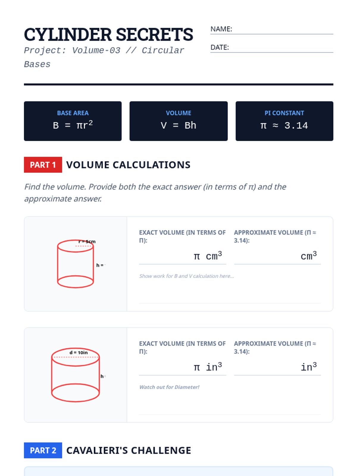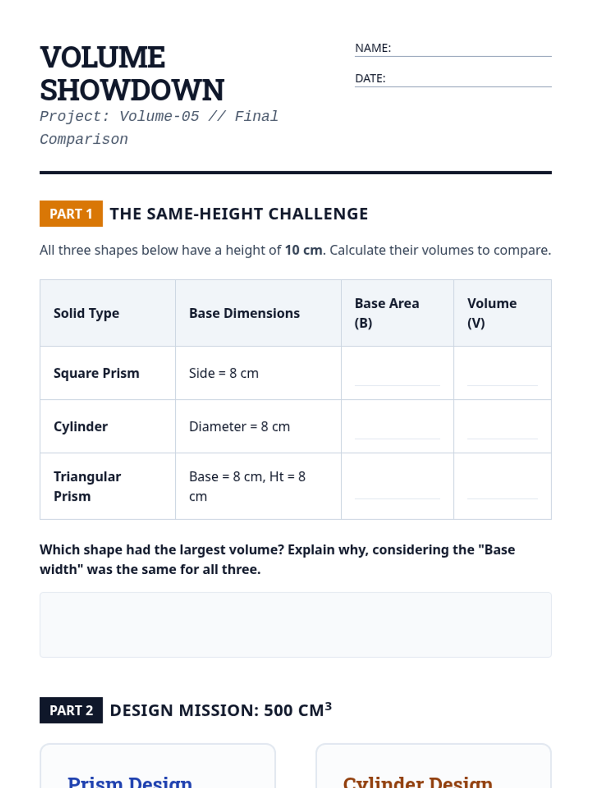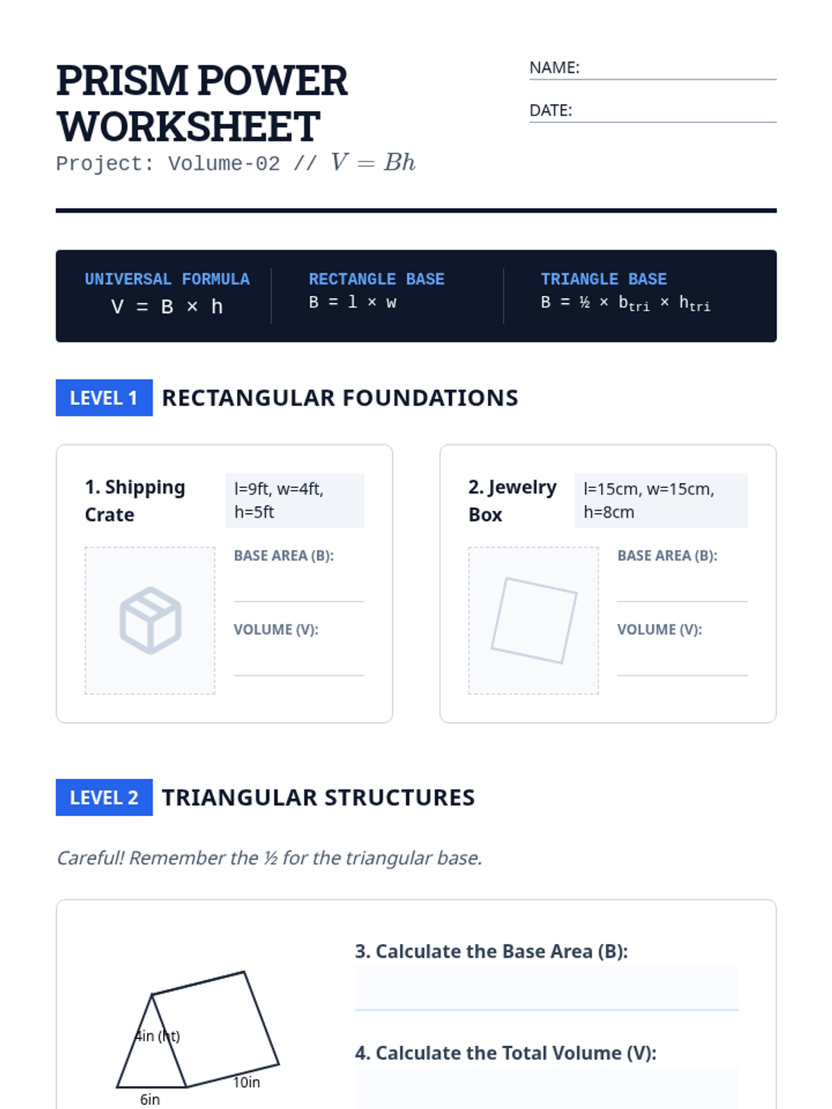 This sequence explores the relationship between 2D base area and 3D volume for prisms and cylinders. Students build a deep conceptual understanding of the \(V = Bh\) formula through hands-on hooks, visual derivations, and real-world application problems.