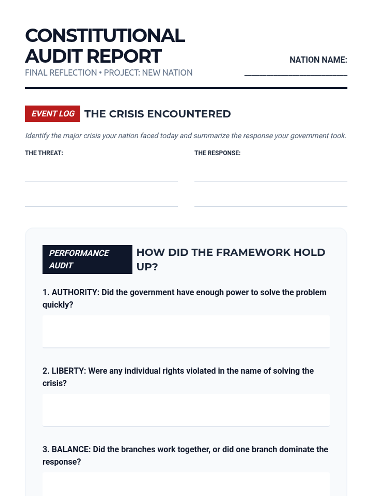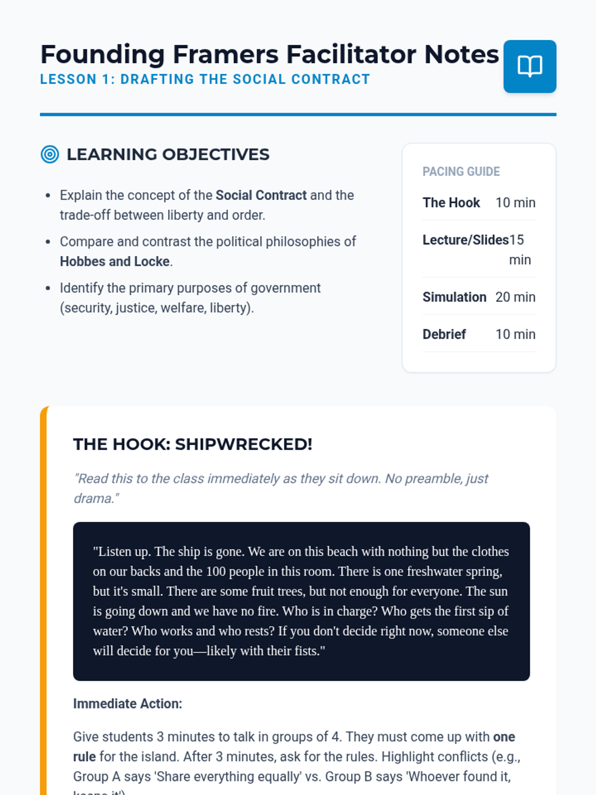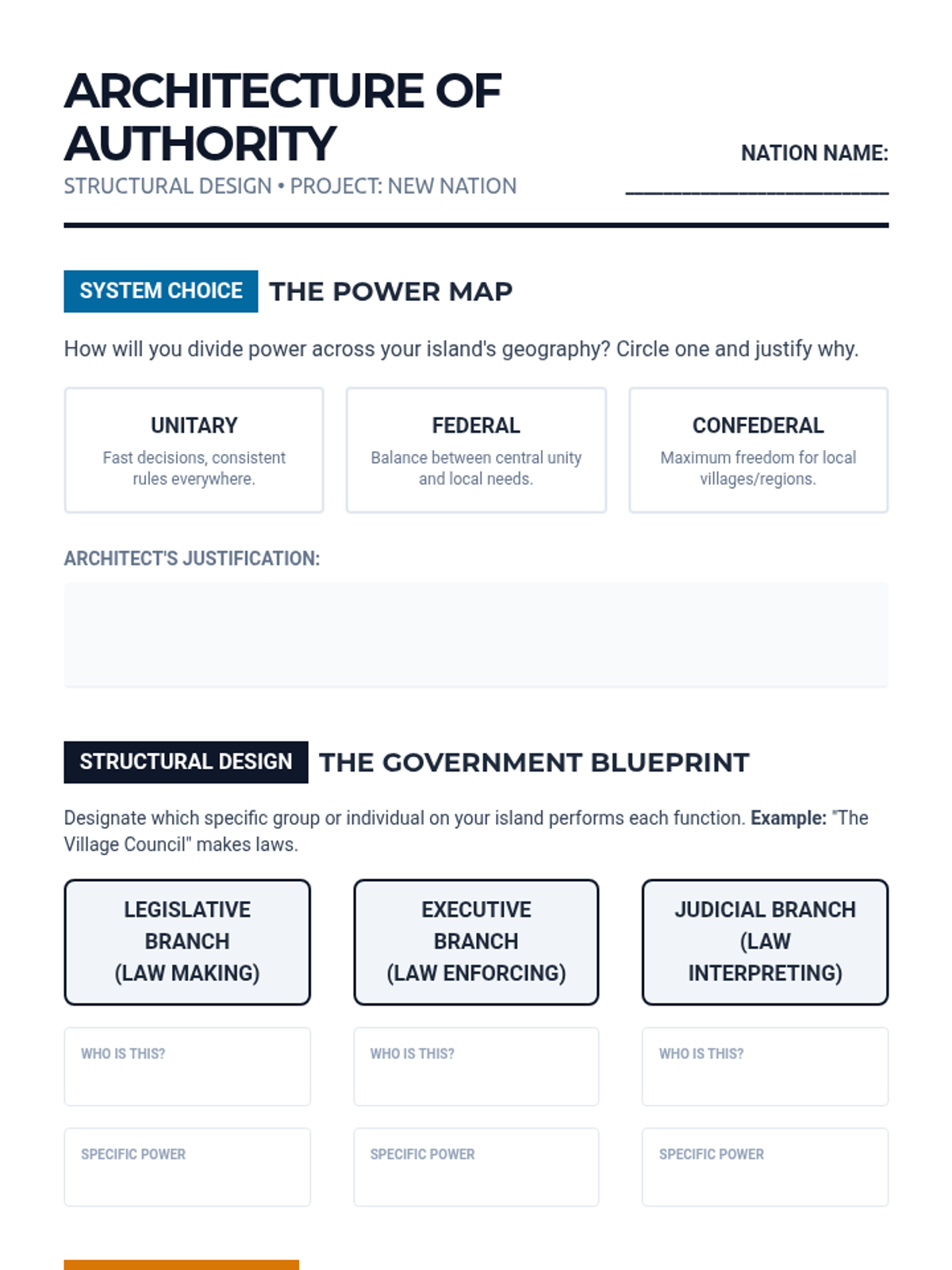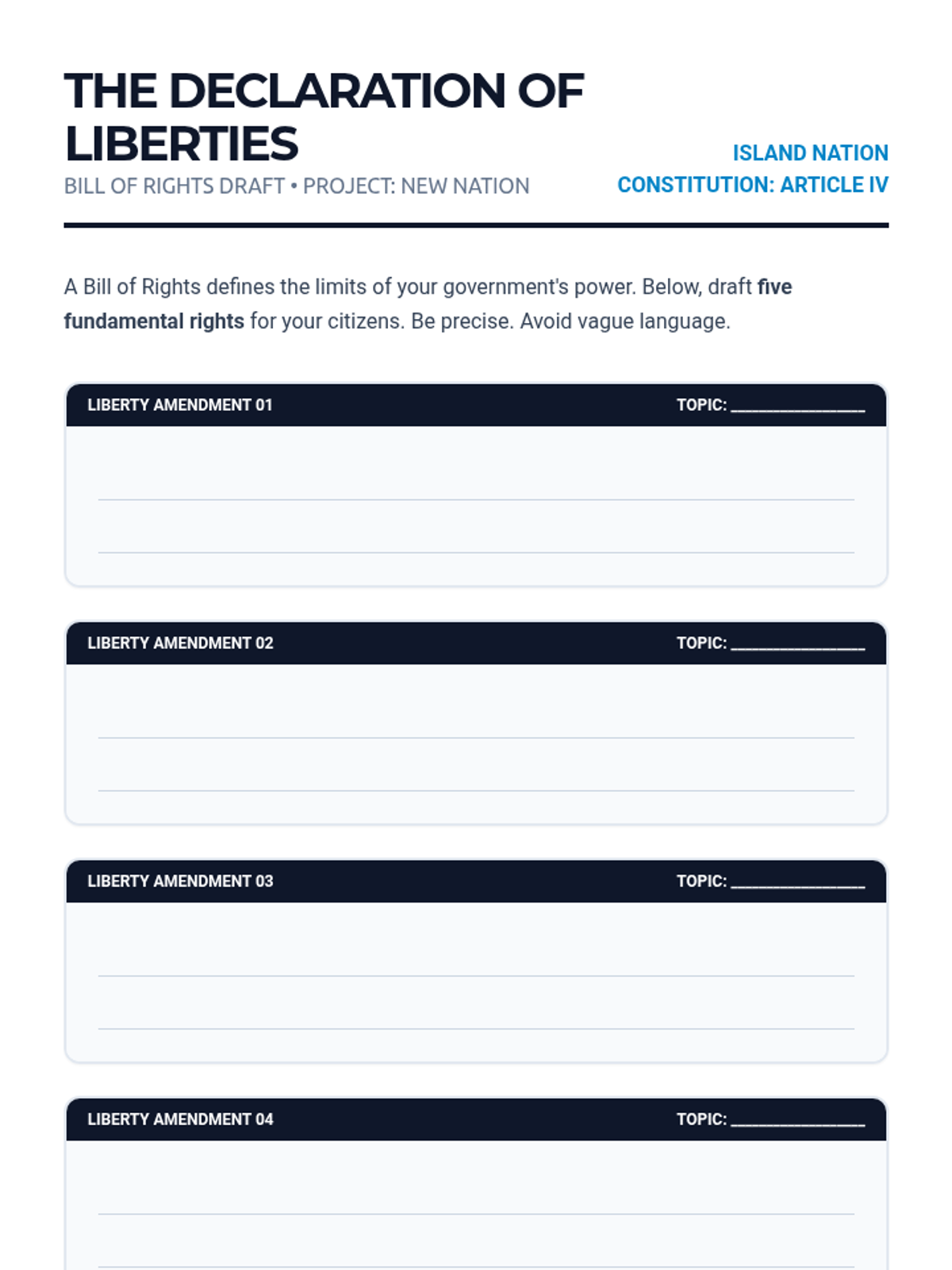 An immersive 8th-grade civics sequence where students act as 'Founding Framers' to design a fictional nation's constitutional framework, exploring power distribution, leadership, and rights.