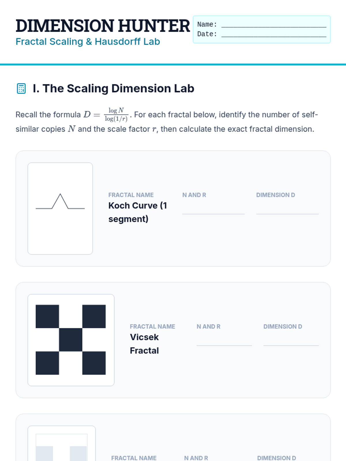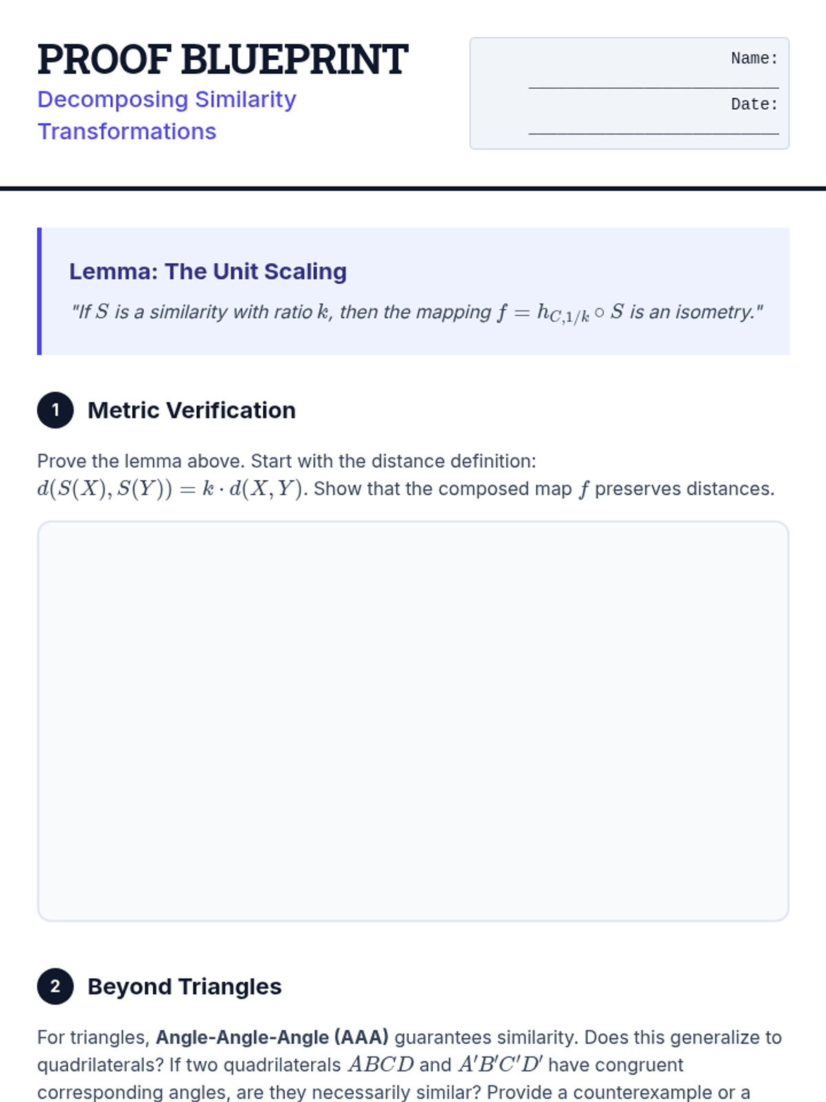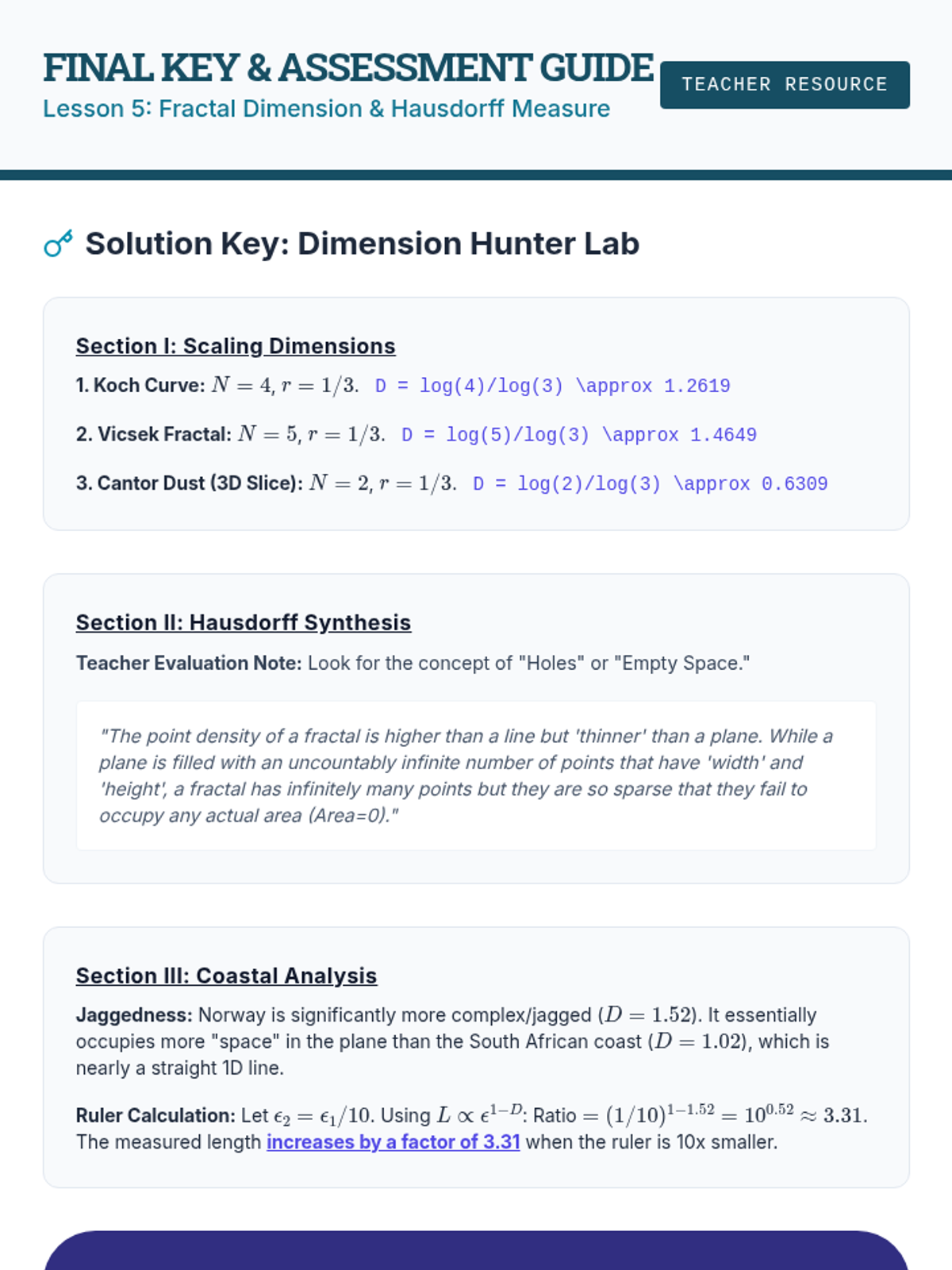 This undergraduate geometry sequence bridges classical Euclidean similarity with modern fractal theory. Students progress from formal proofs of homothety to calculating the Hausdorff dimension of self-similar sets, exploring how scaling laws govern both biological structures and infinite recursive shapes.