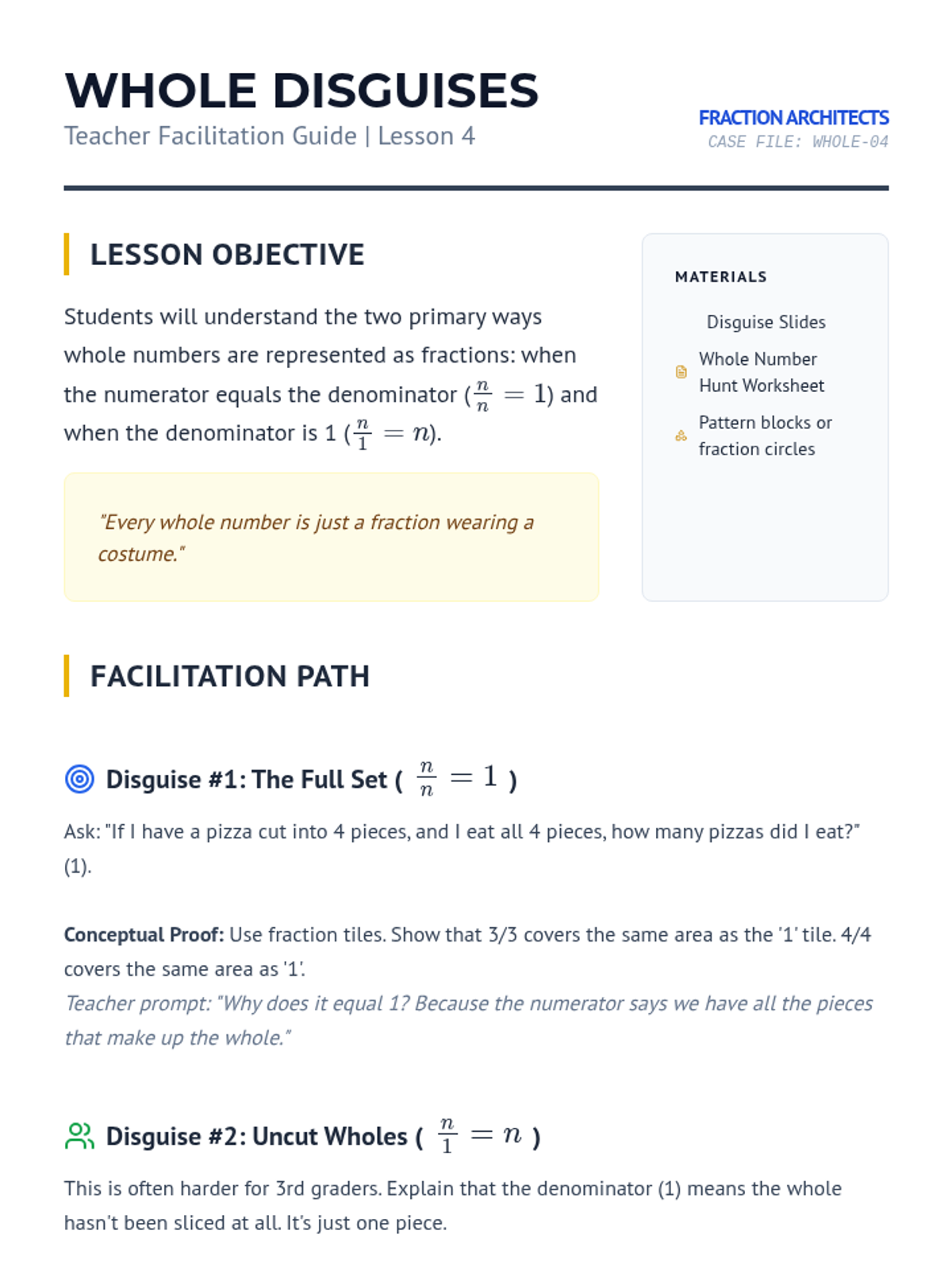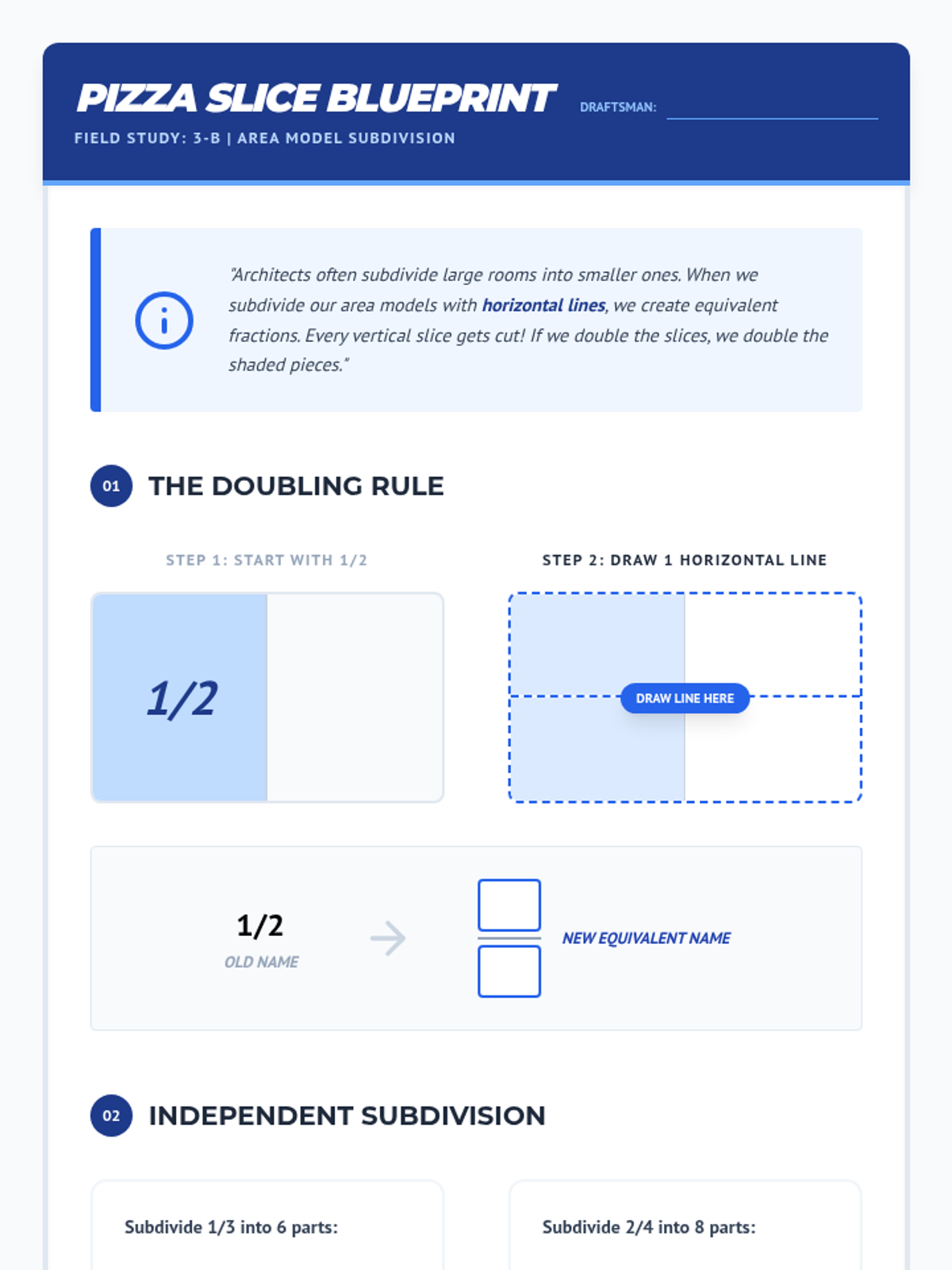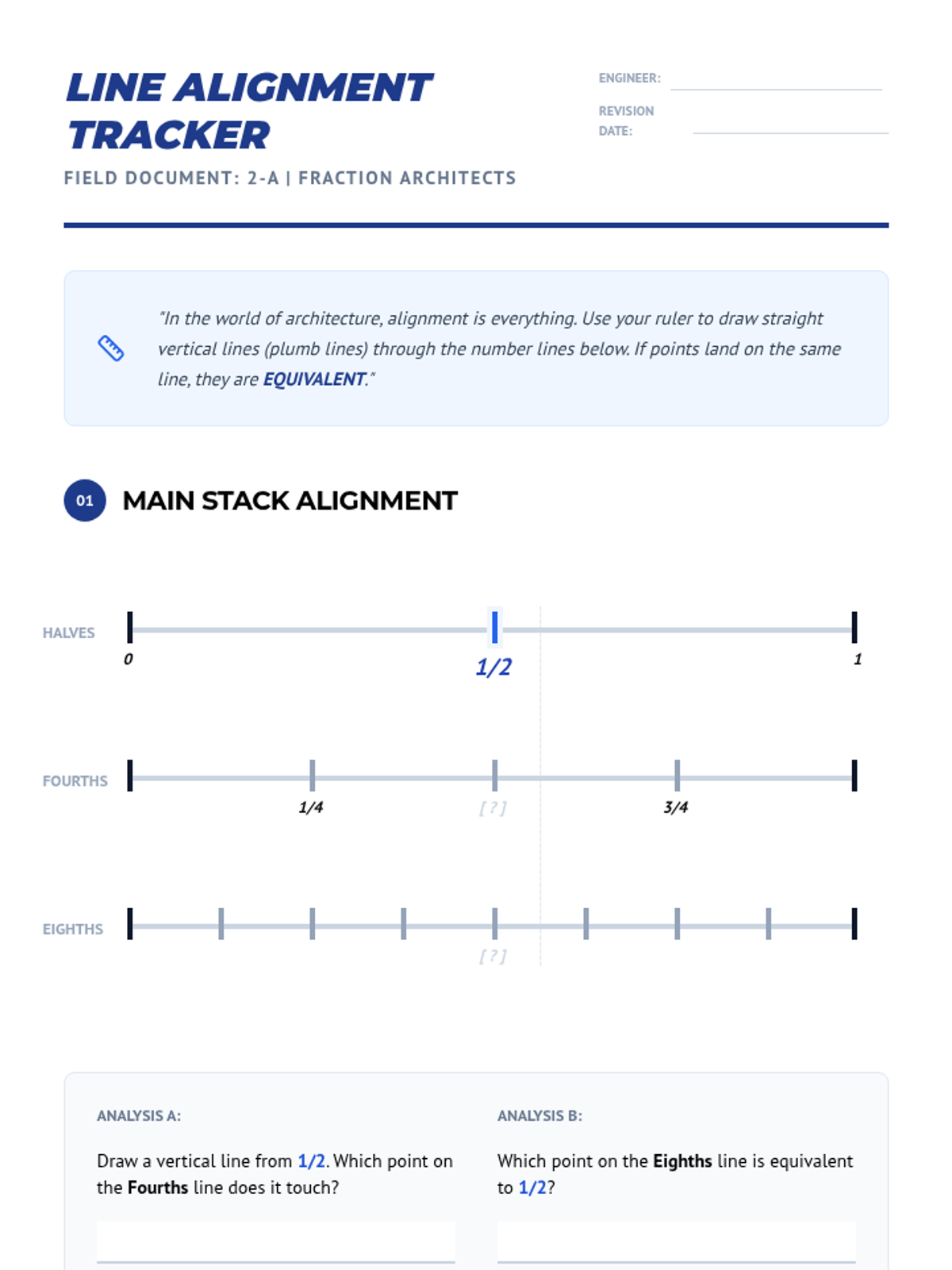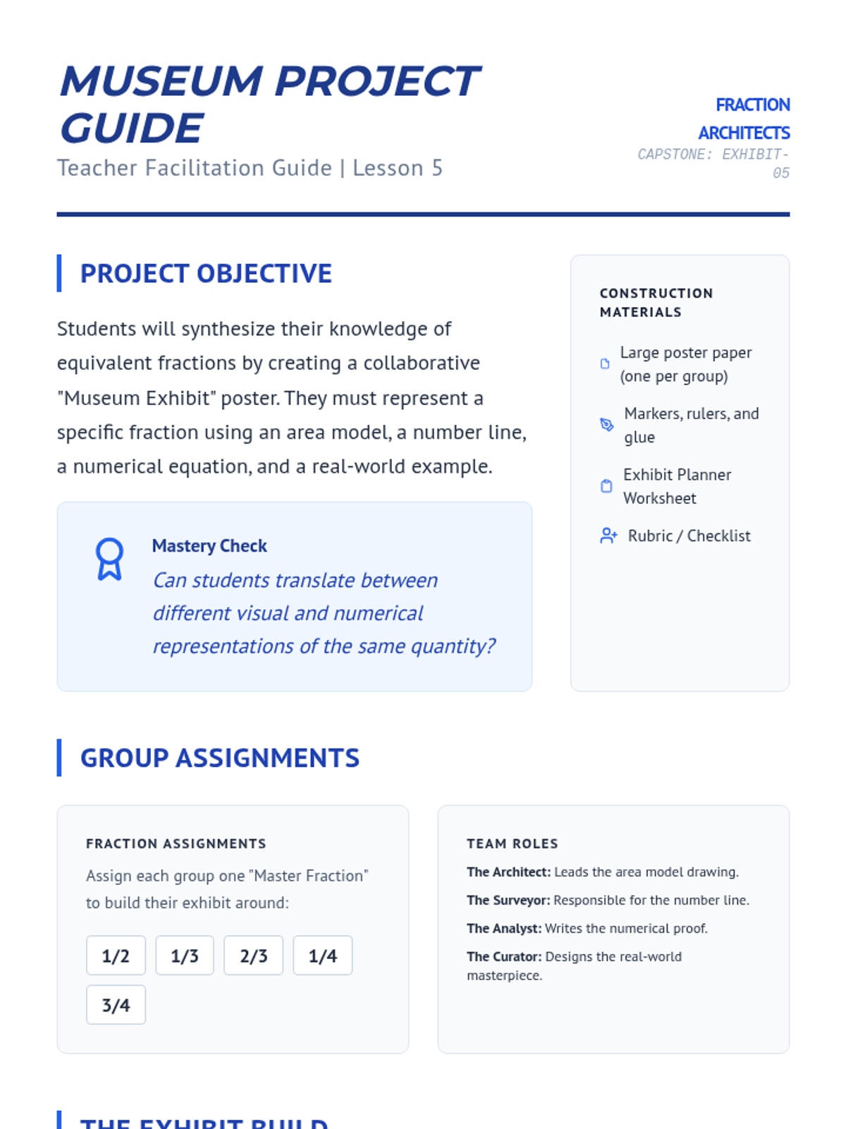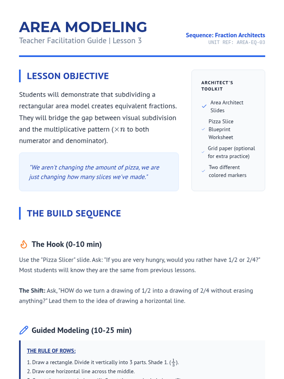 A 3rd-grade sequence exploring equivalent fractions through paper folding, number lines, area models, and project-based learning. Students move from concrete visualizations to conceptual understanding of how different numbers represent the same quantity.