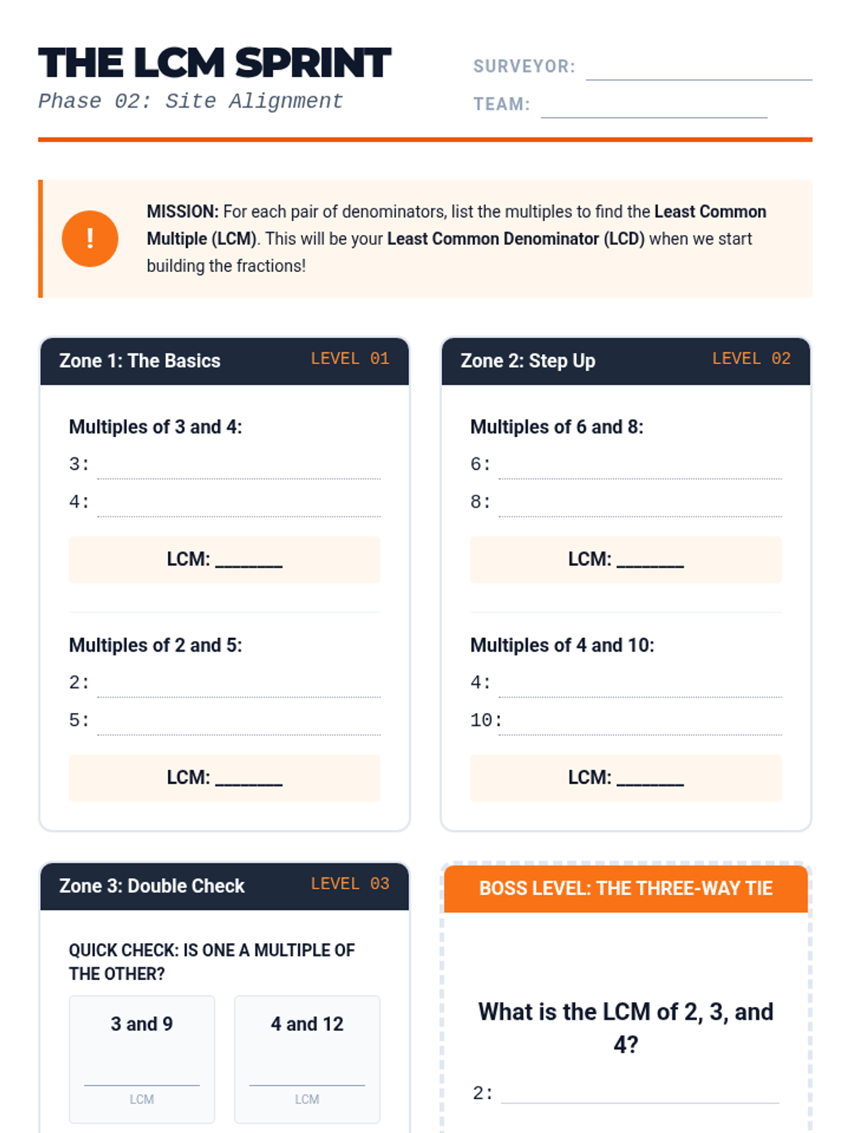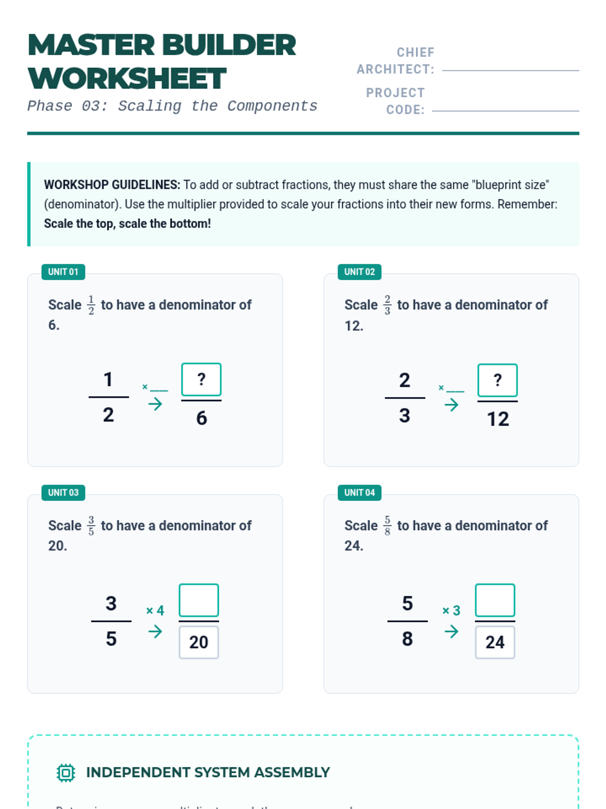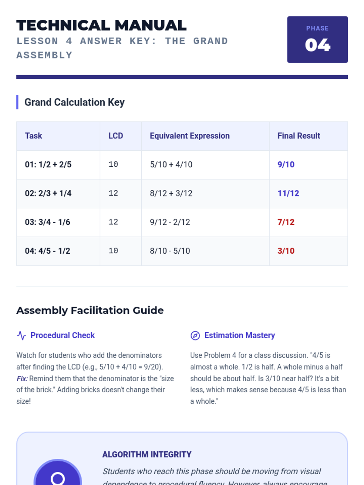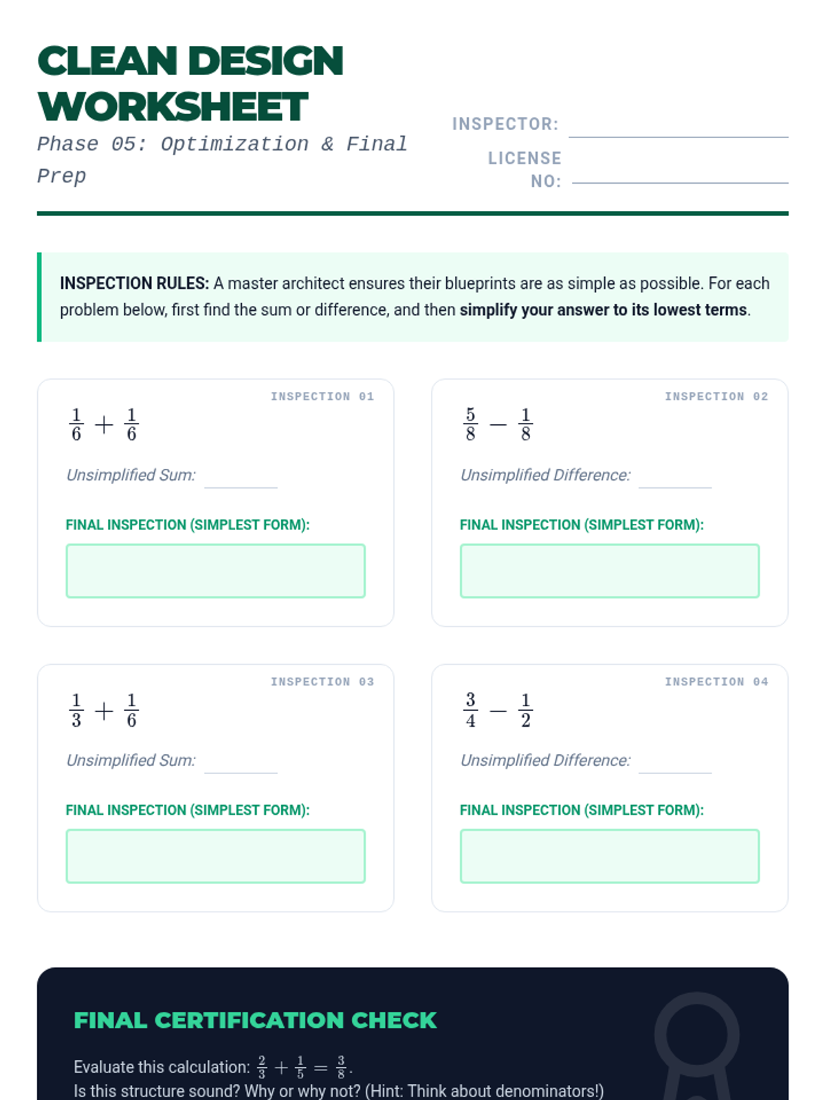 A comprehensive 6th-grade math sequence exploring the conceptual and procedural foundations of adding and subtracting fractions with unlike denominators through a 'Blueprint Architects' theme. Students progress from visual modeling to mastery of the standard algorithm and simplification.