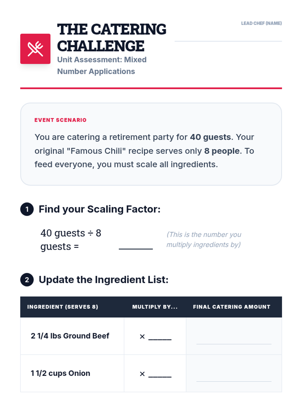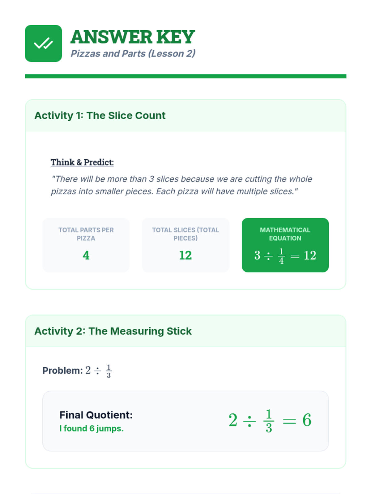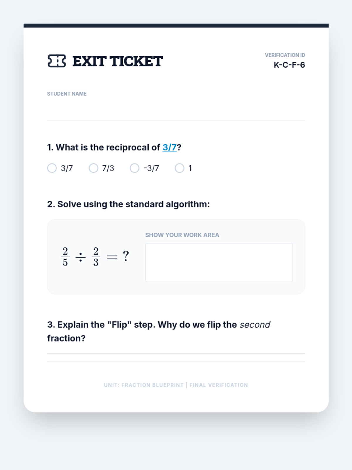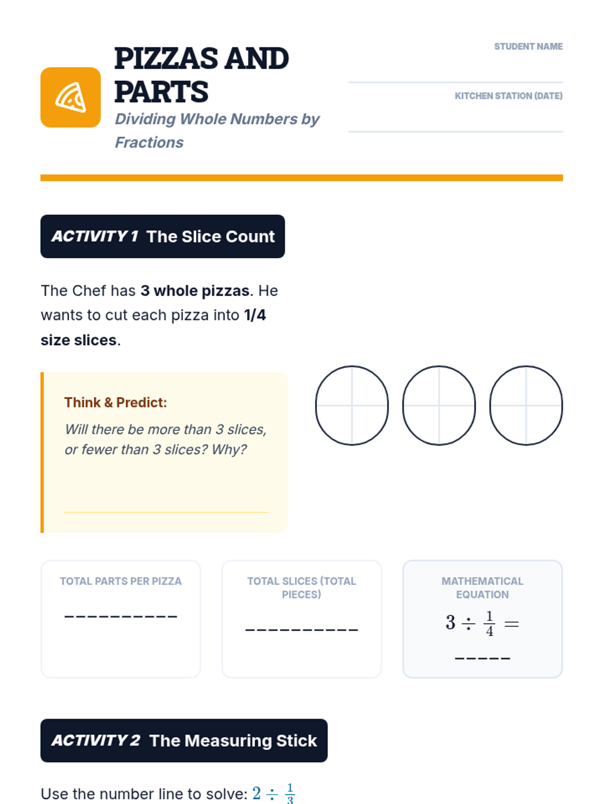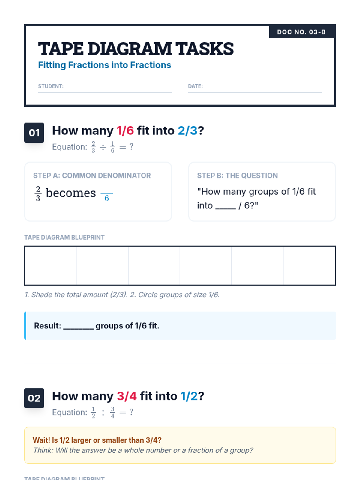 A comprehensive 6th-grade sequence on multiplying and dividing fractions. Students transition from visual area models and tape diagrams to mastering the standard reciprocal multiplication algorithm through inquiry and real-world scaling projects.