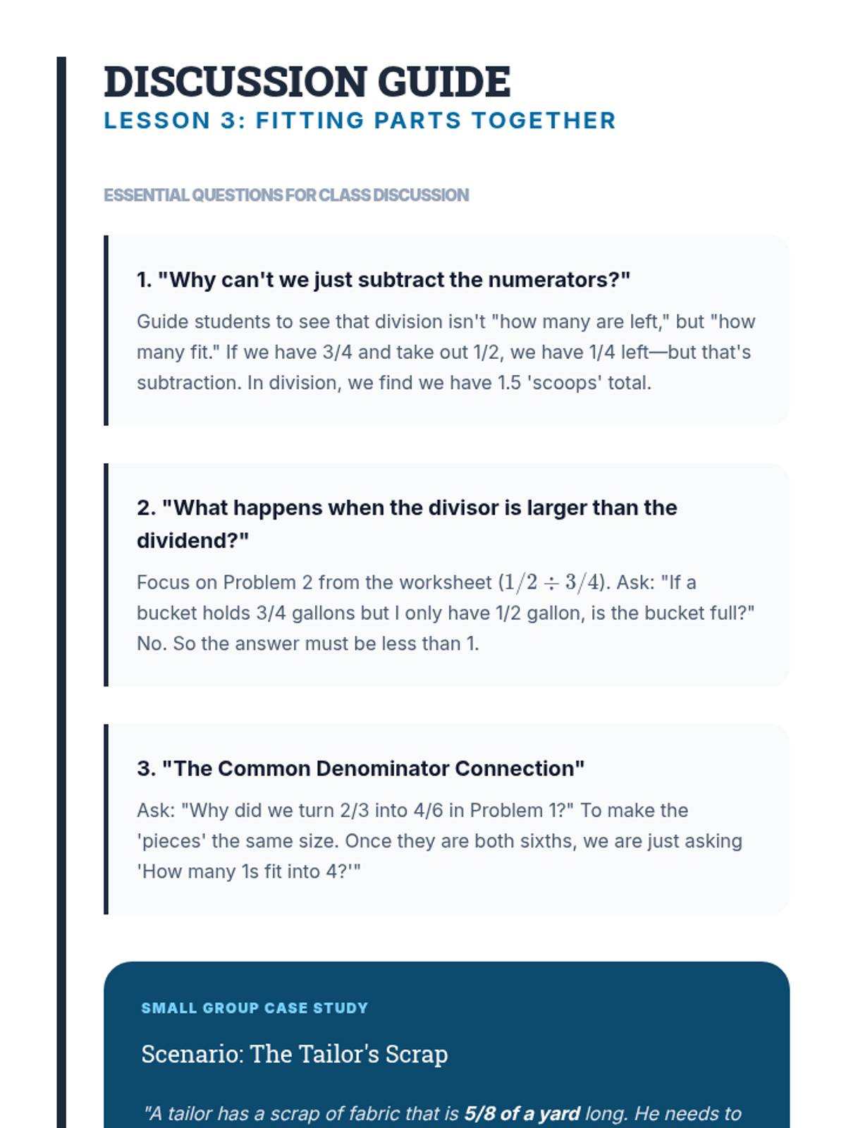 A comprehensive 7-lesson intervention sequence designed to build conceptual fraction understanding through visual models, number lines, and scaffolded practice. The sequence moves from basic area models to adding and subtracting with unlike denominators, prioritizing 'why' over 'how'.