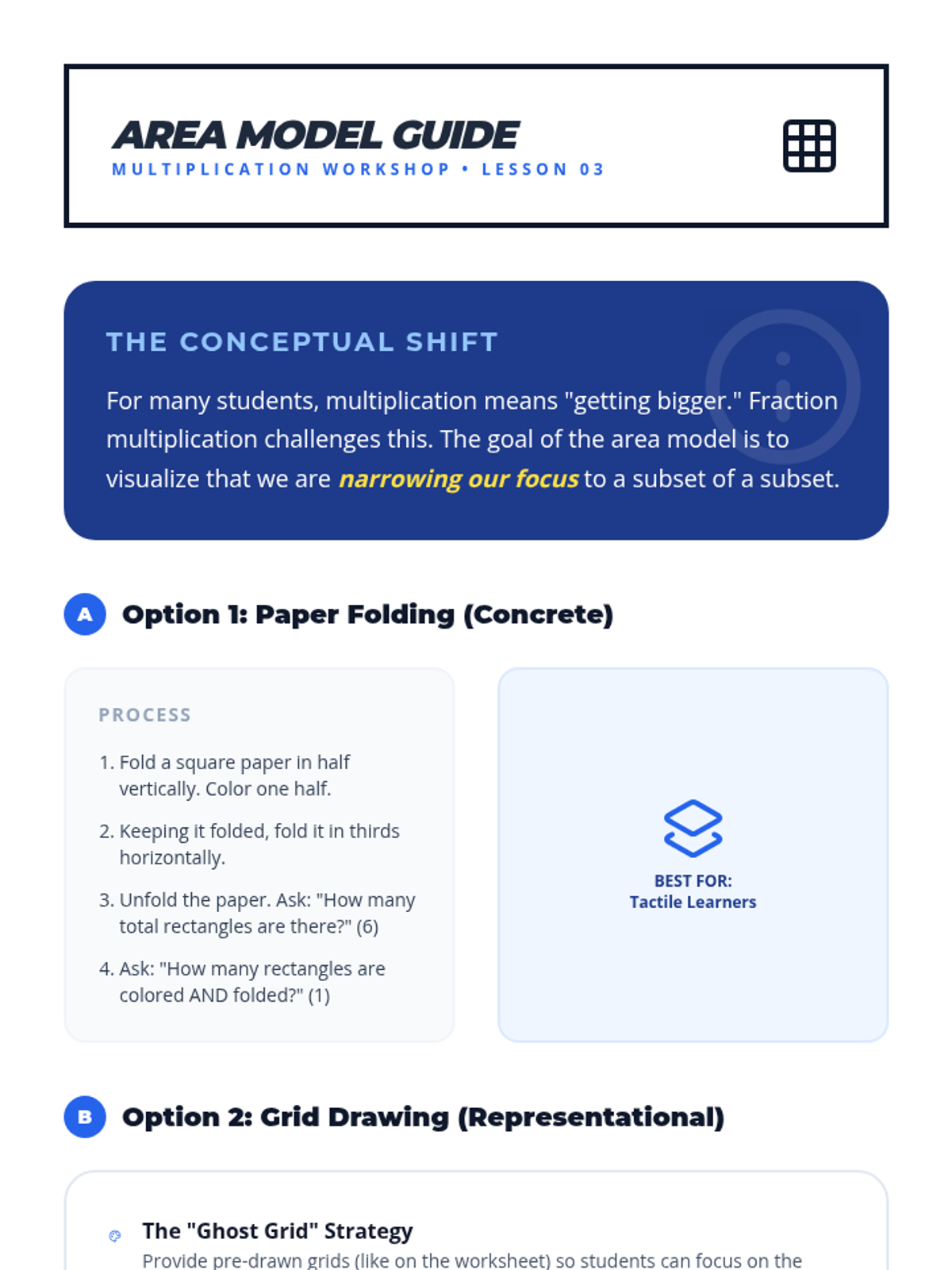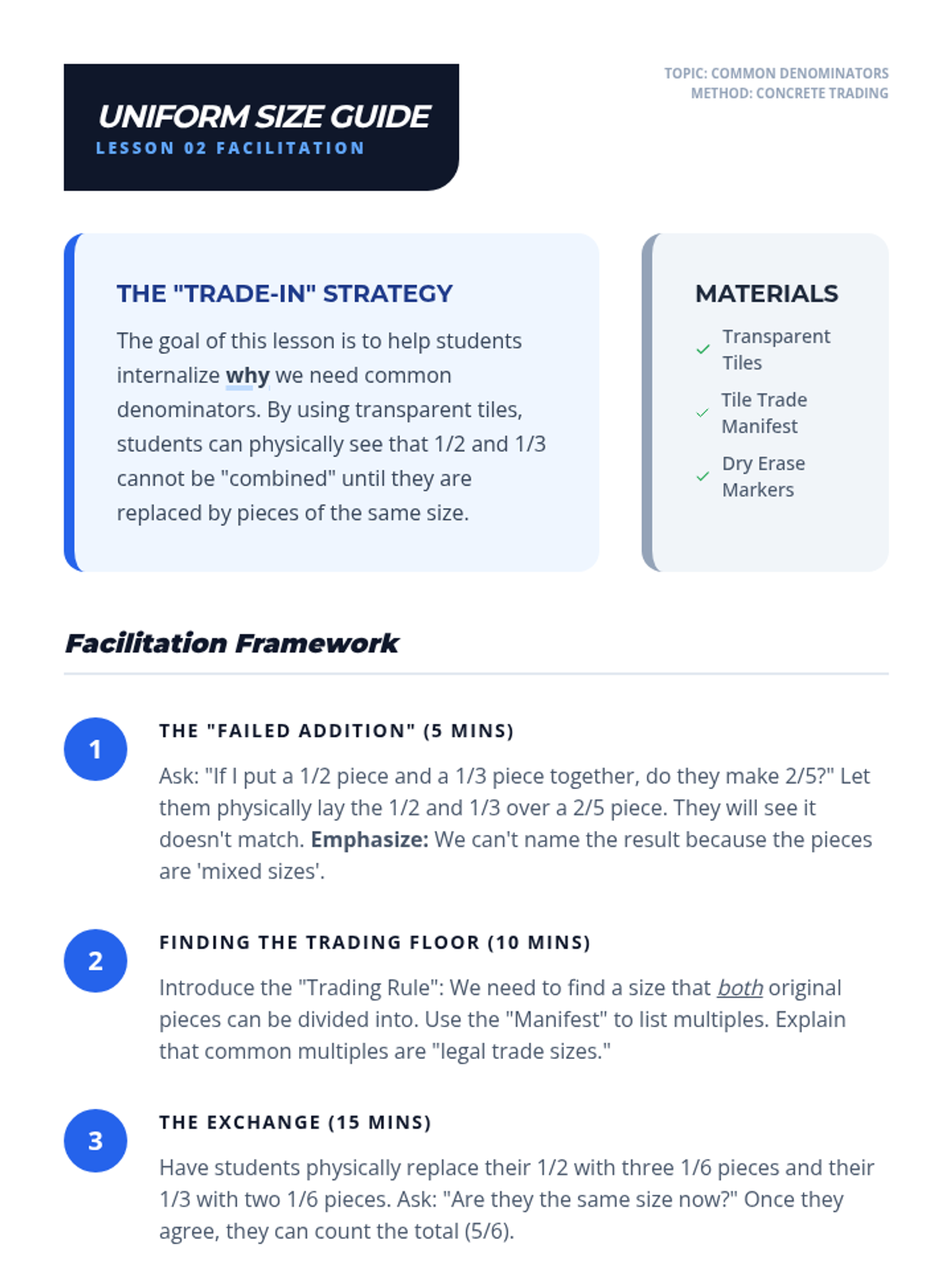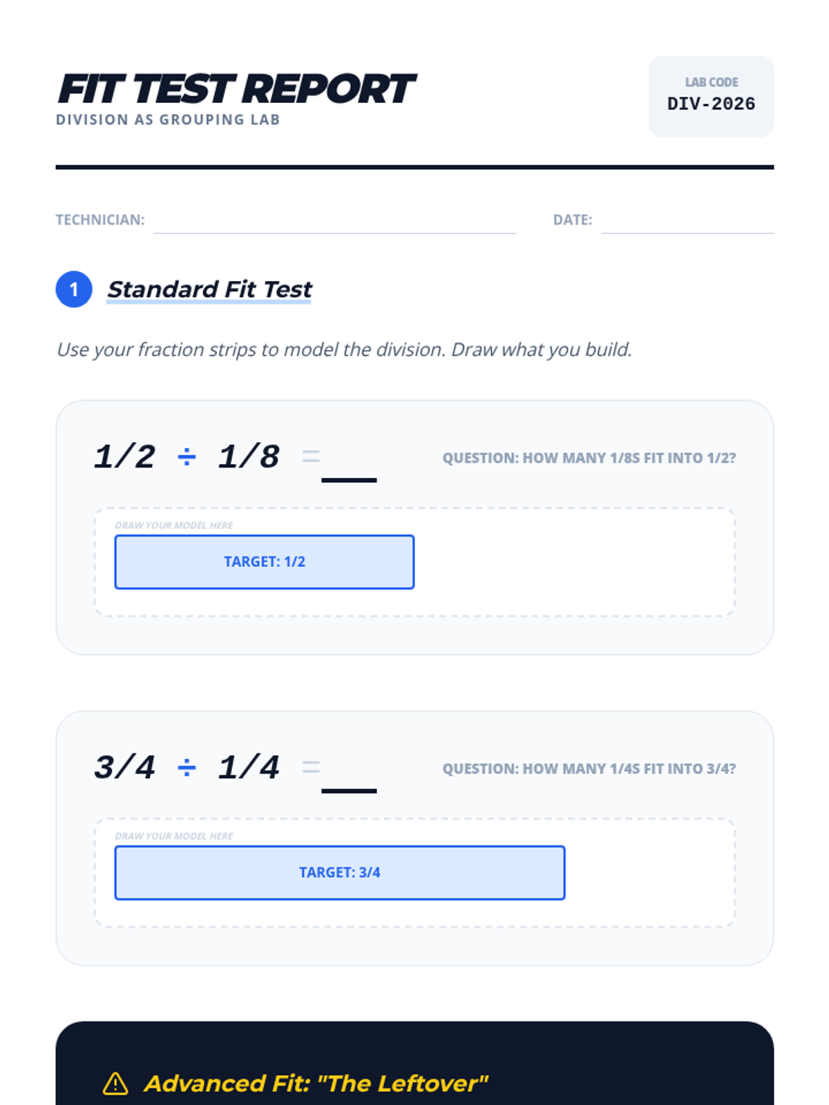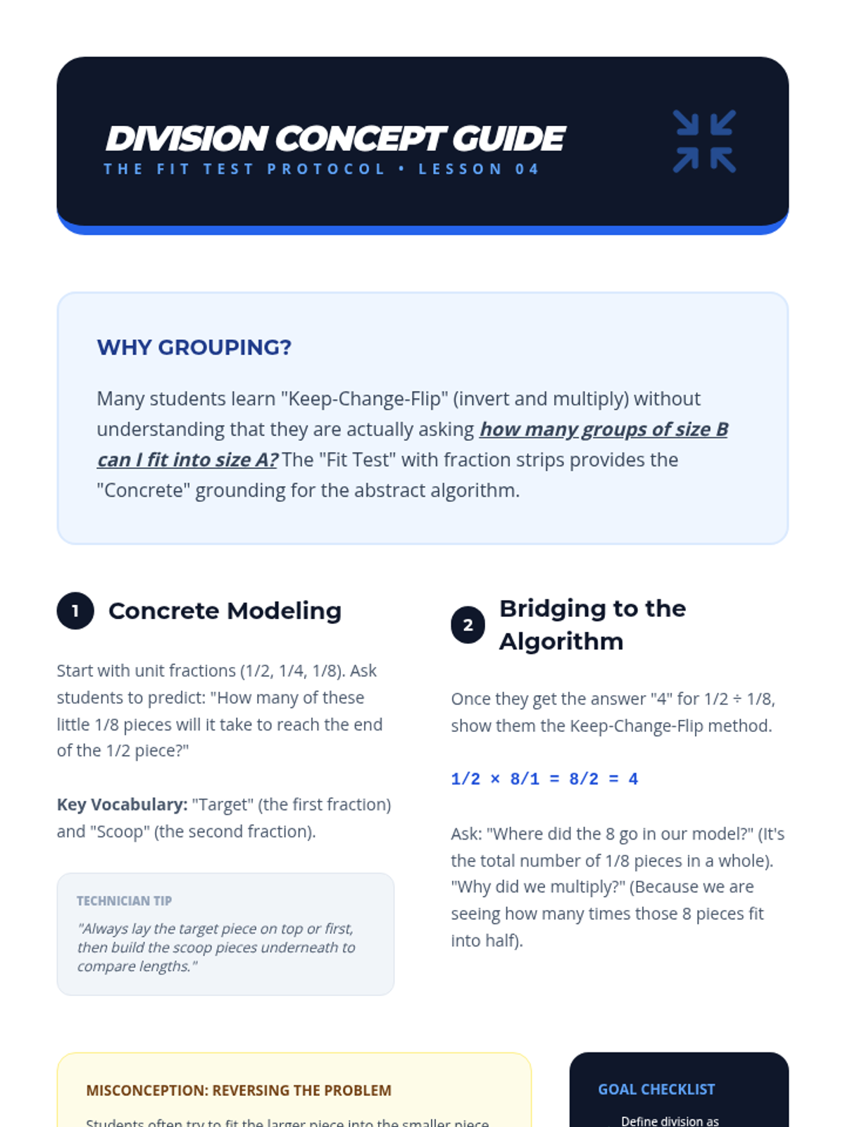 A 12-session tier 2 intervention sequence designed to build conceptual mastery of fraction division. Grounded in All Learners Network (ALN) principles, students progress from visual measurement models to the common denominator strategy and eventually the standard algorithm through deep reasoning and high-leverage concepts.