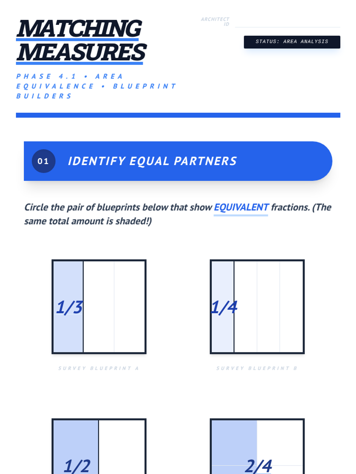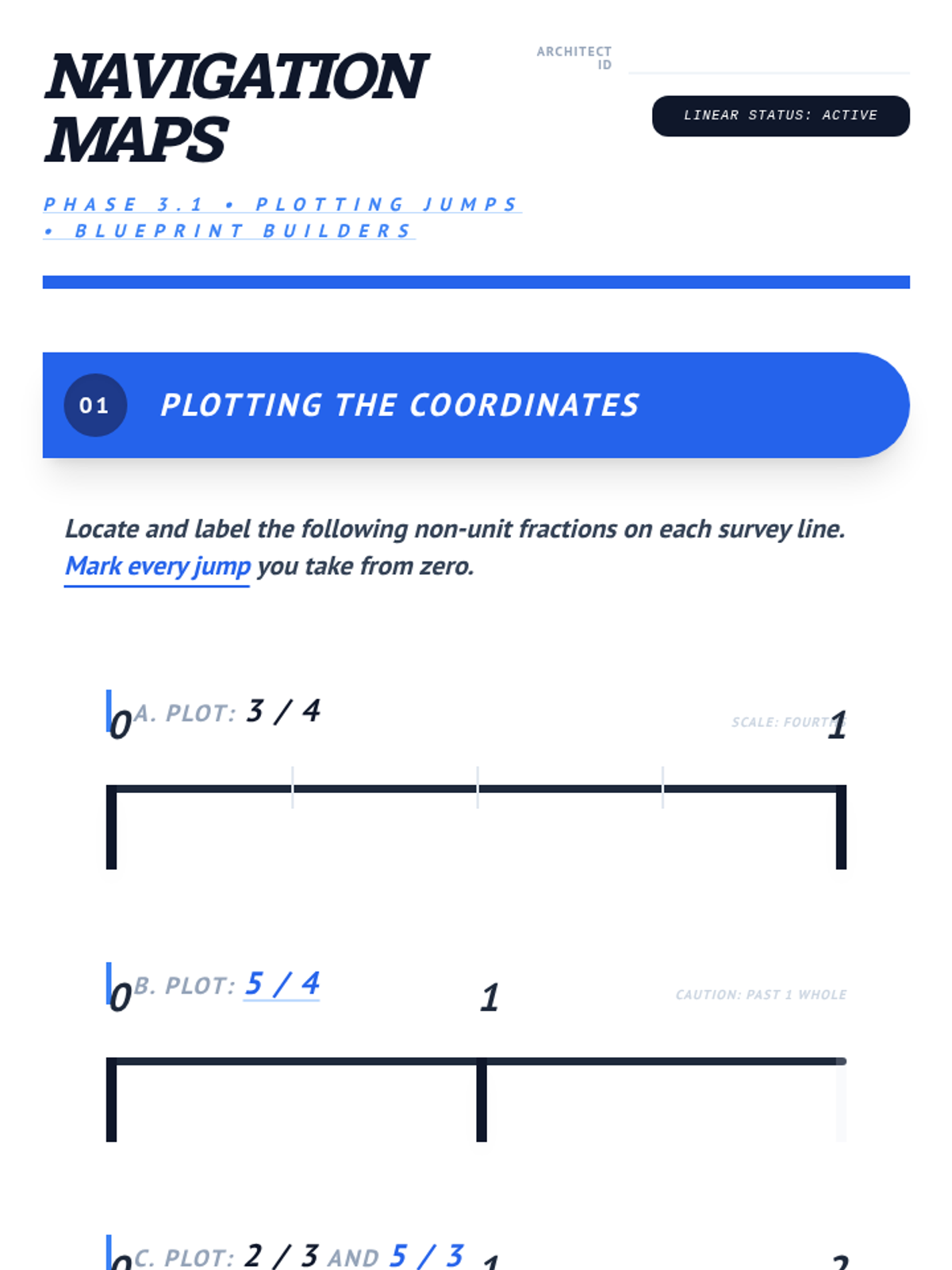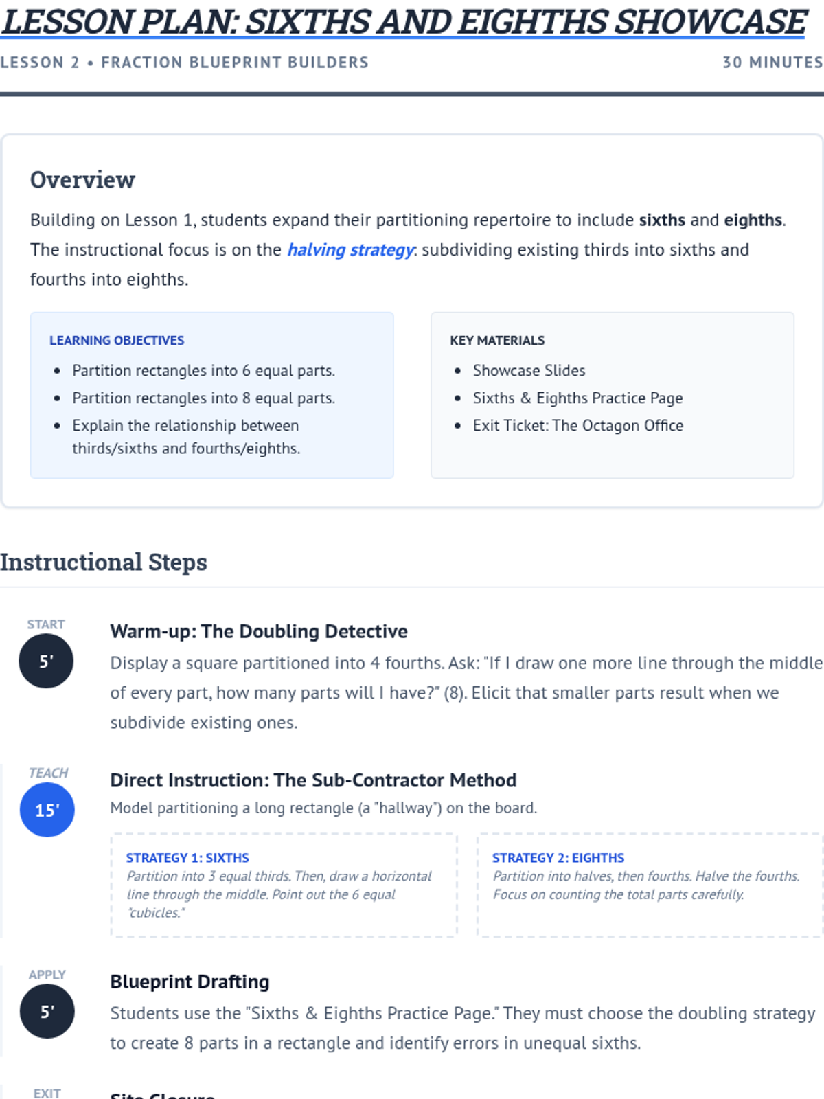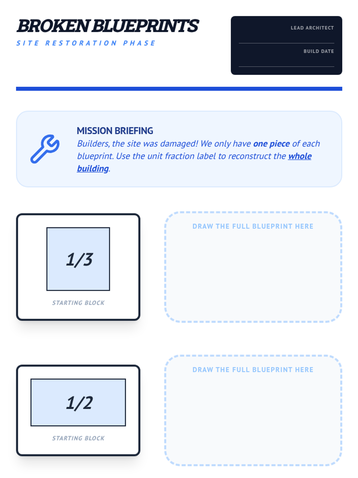 A 12-lesson series focused on understanding fractions as numbers, partitioning shapes and number lines, and exploring equivalence through a 'Blueprint Builder' architectural theme. Students progress from naming parts of a whole to locating fractions greater than 1 on number lines.