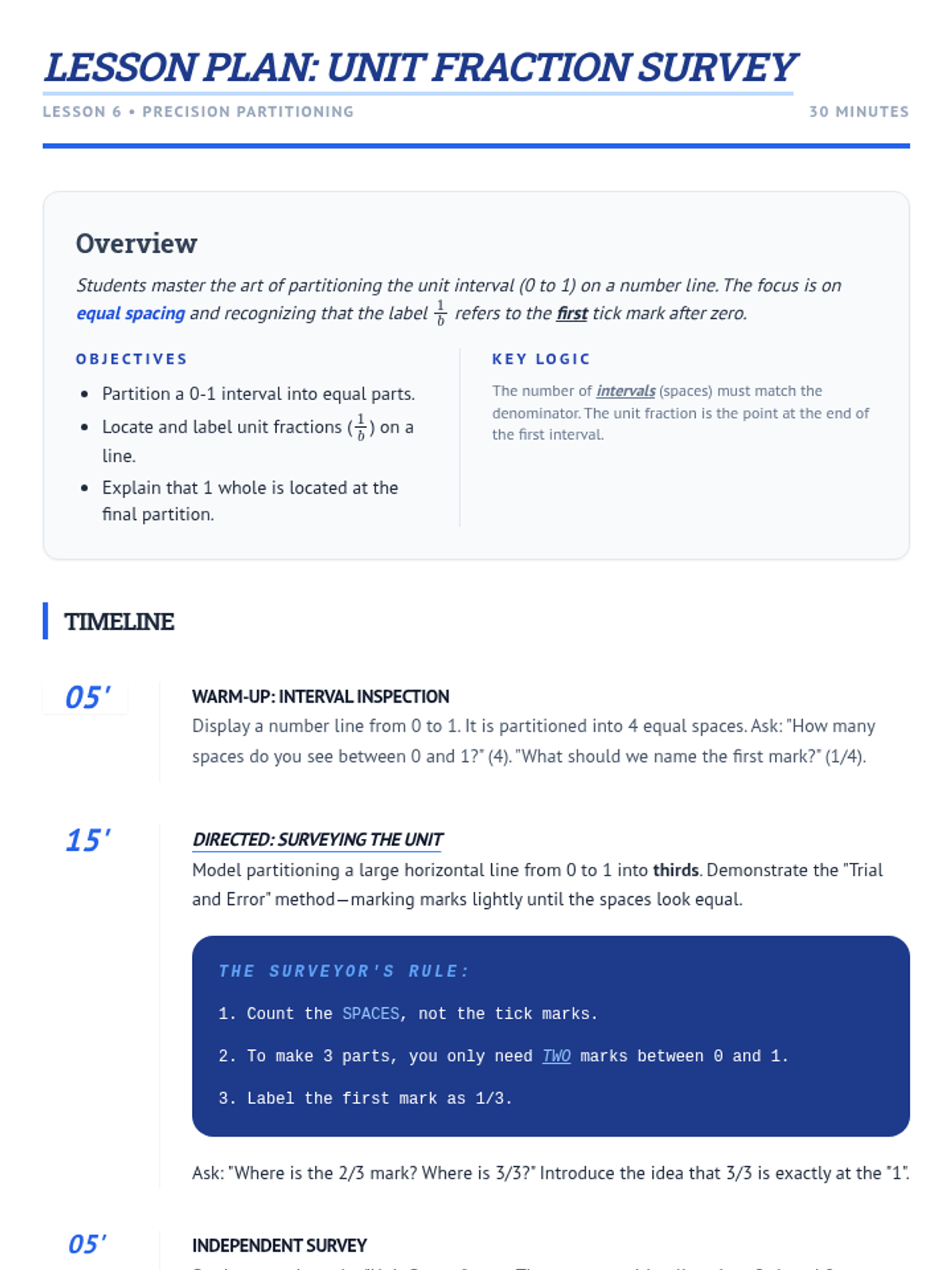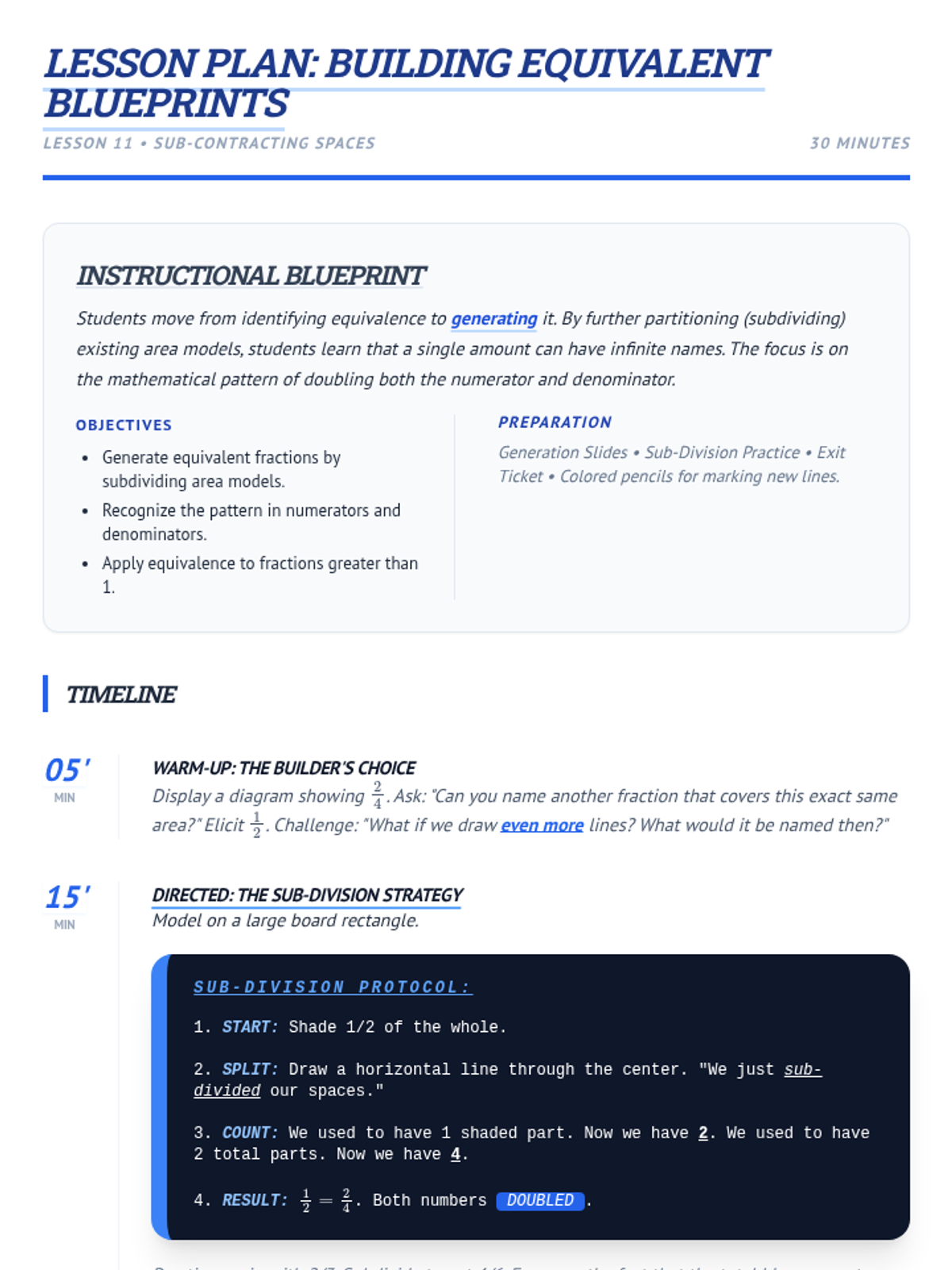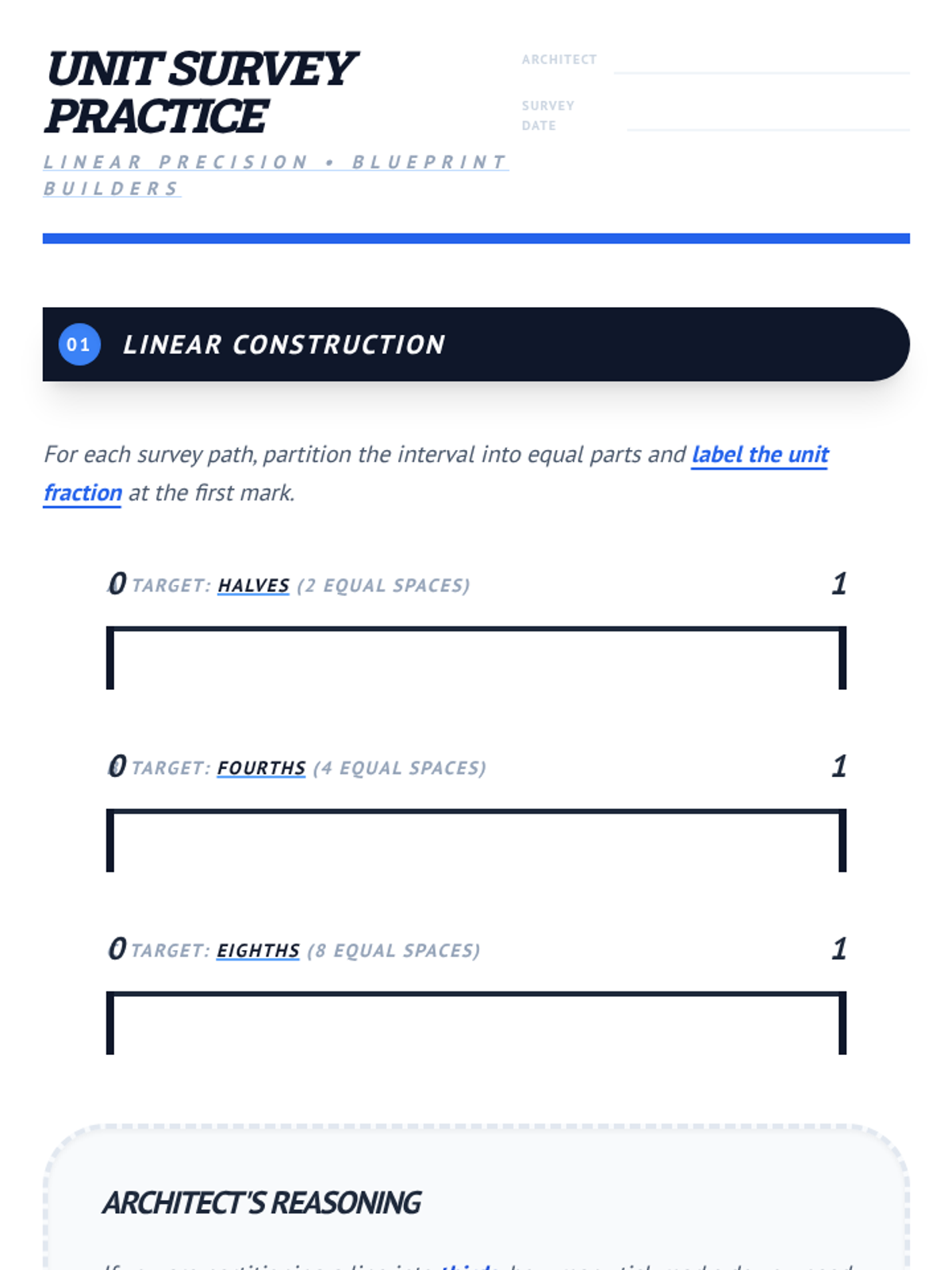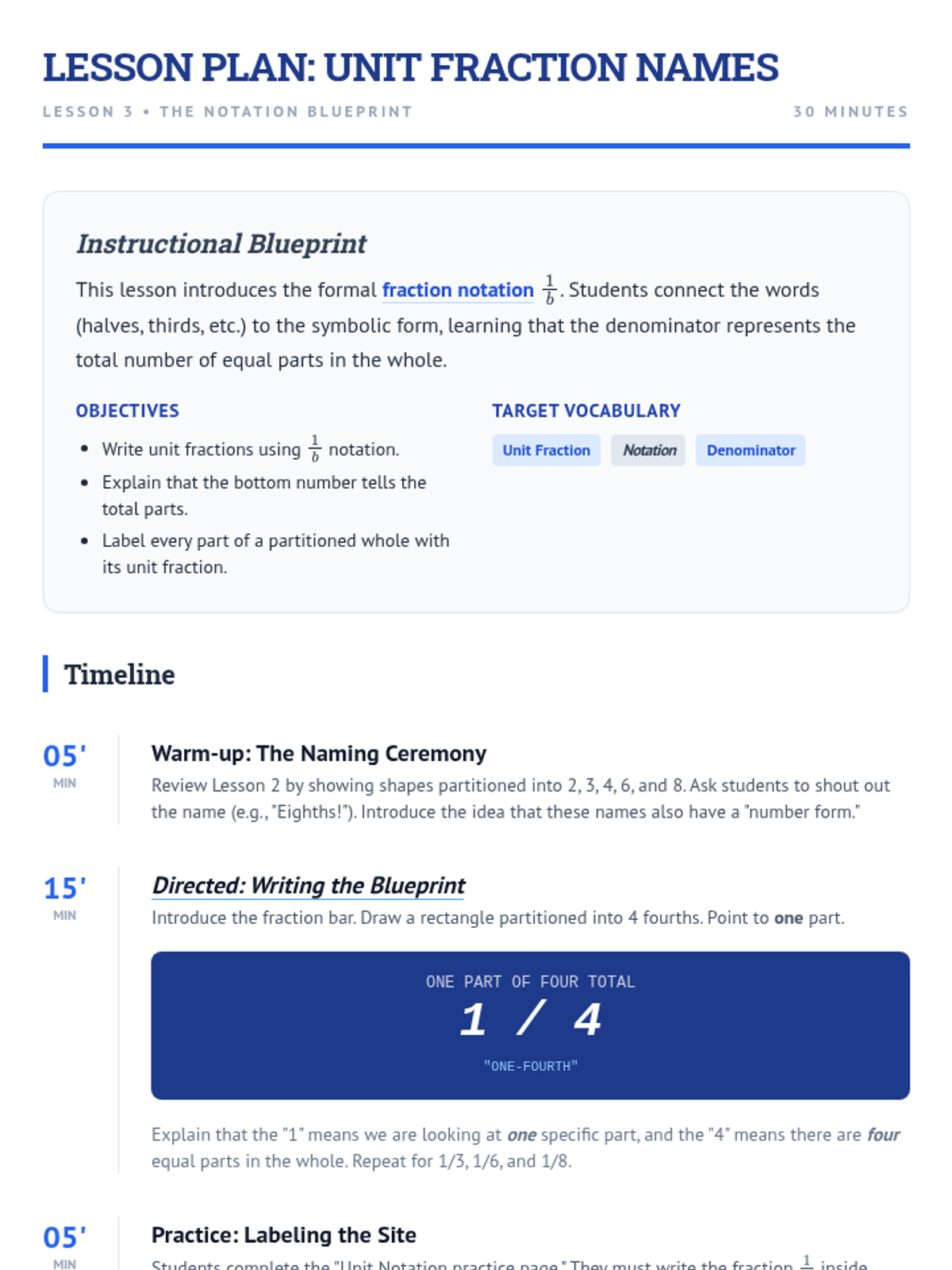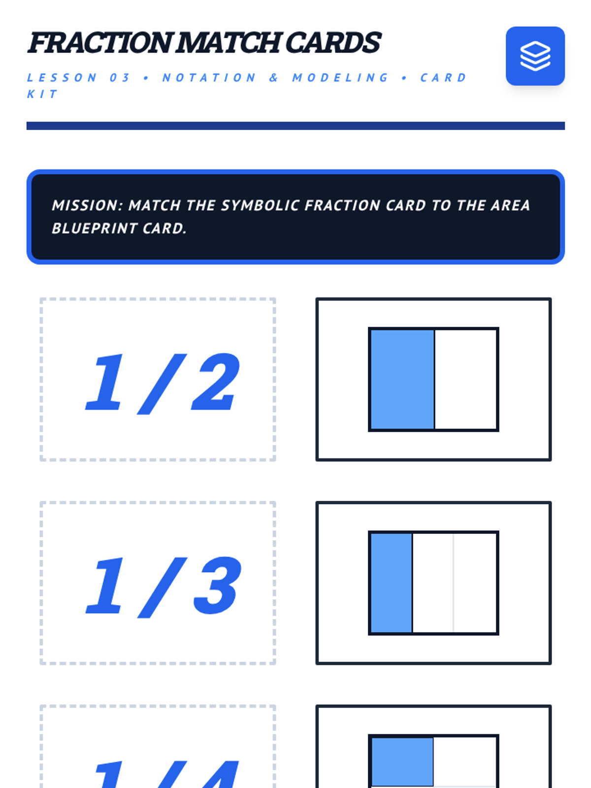 A 12-lesson series focused on understanding fractions as numbers, partitioning shapes and number lines, and exploring equivalence through a 'Blueprint Builder' architectural theme. Students progress from naming parts of a whole to locating fractions greater than 1 on number lines.
