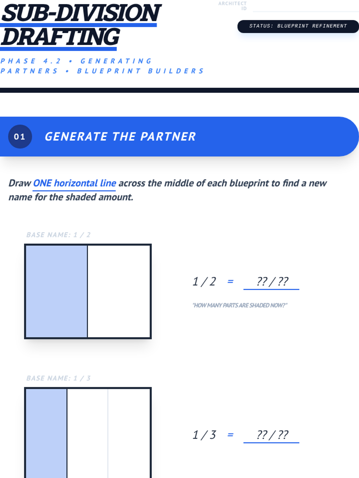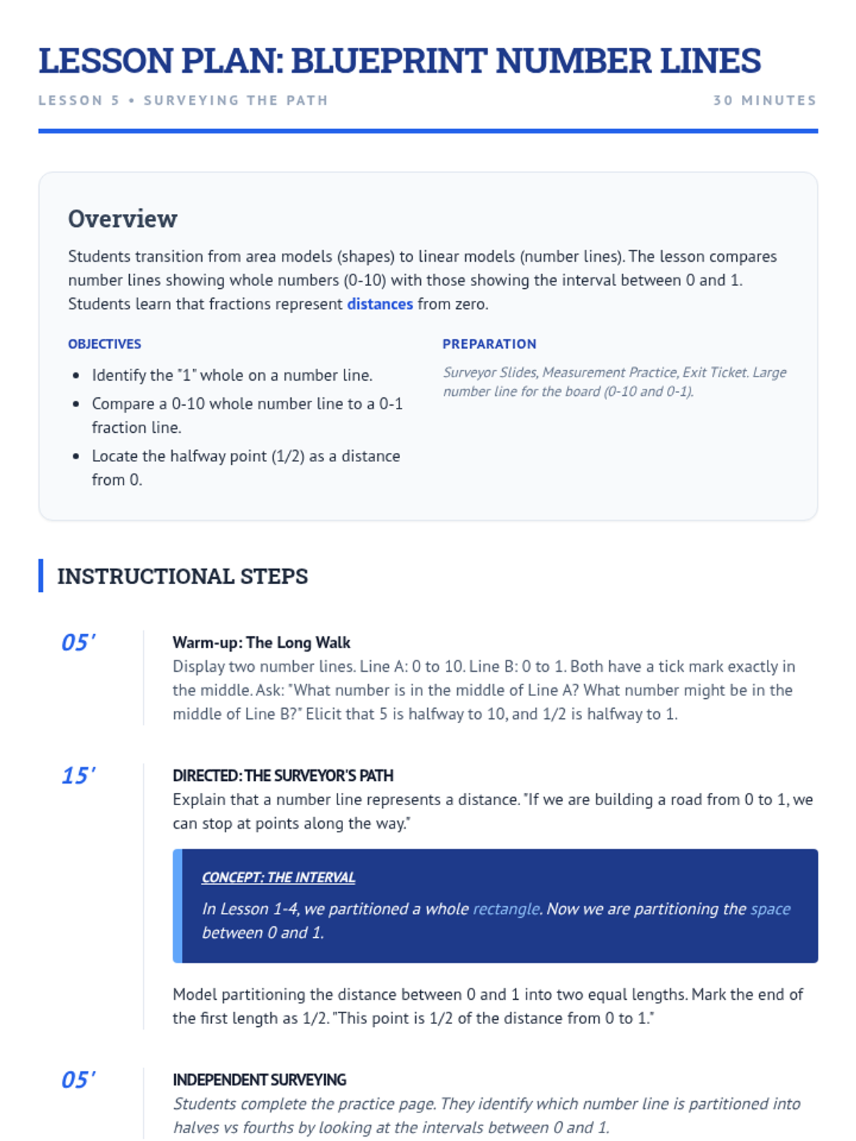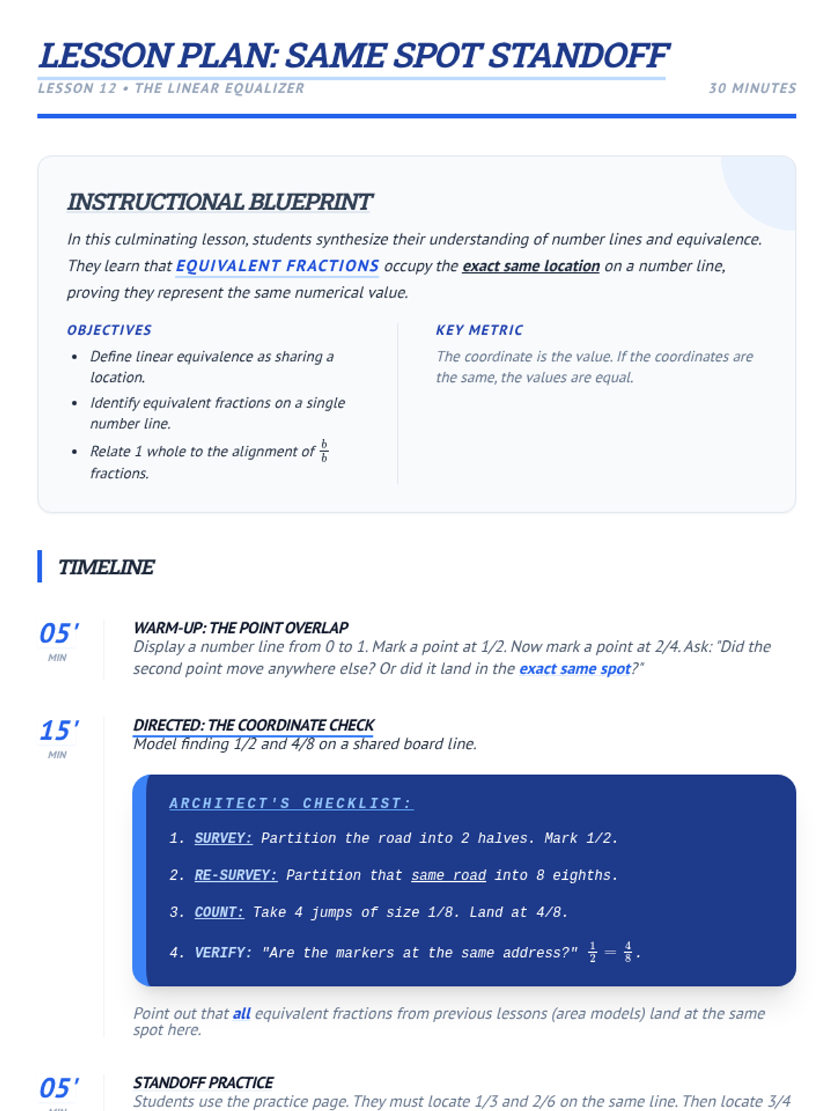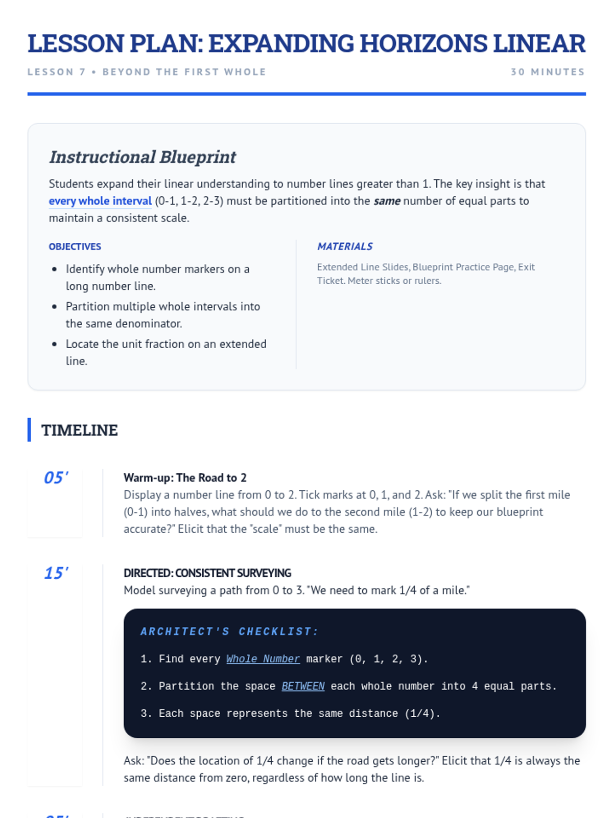 A 12-lesson series focused on understanding fractions as numbers, partitioning shapes and number lines, and exploring equivalence through a 'Blueprint Builder' architectural theme. Students progress from naming parts of a whole to locating fractions greater than 1 on number lines.
