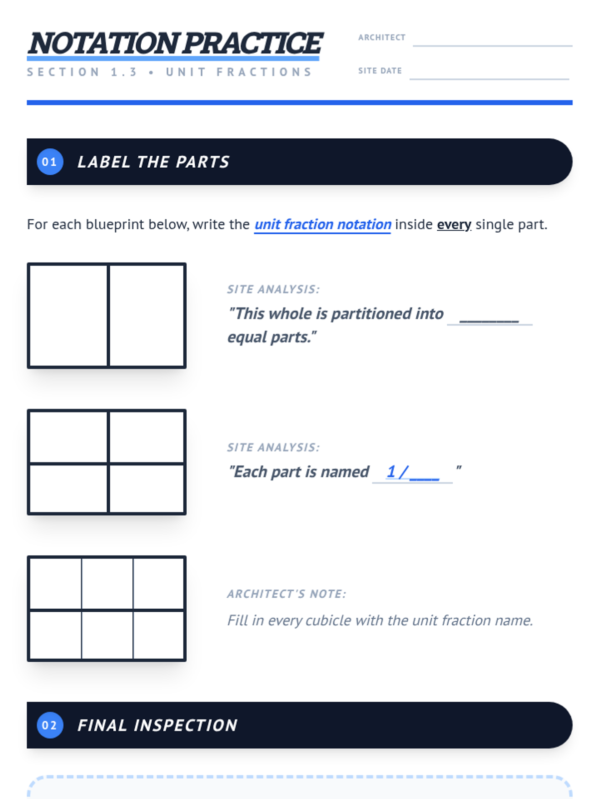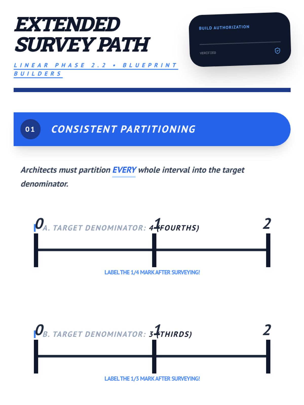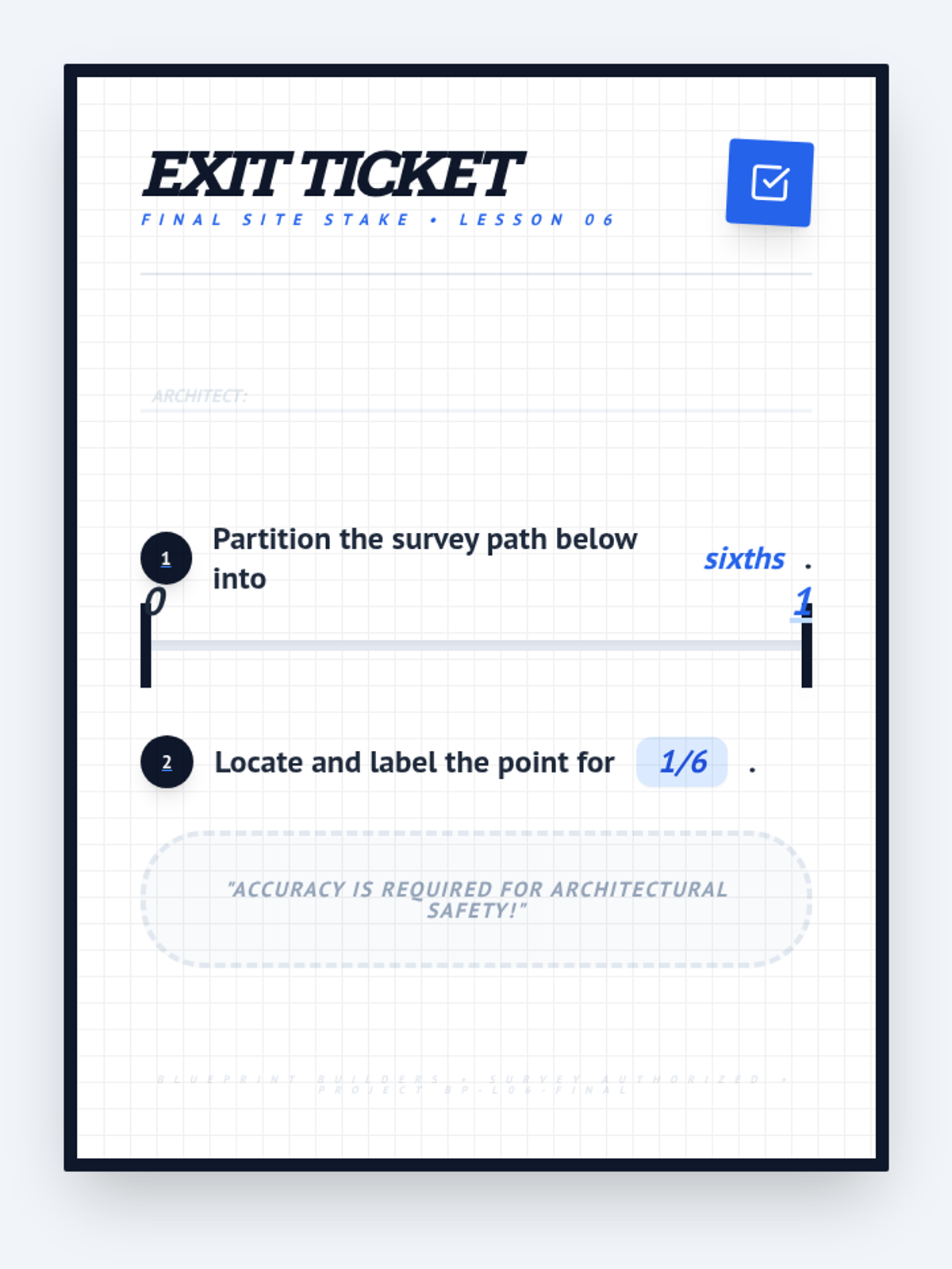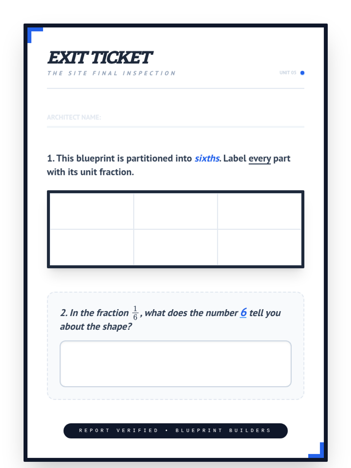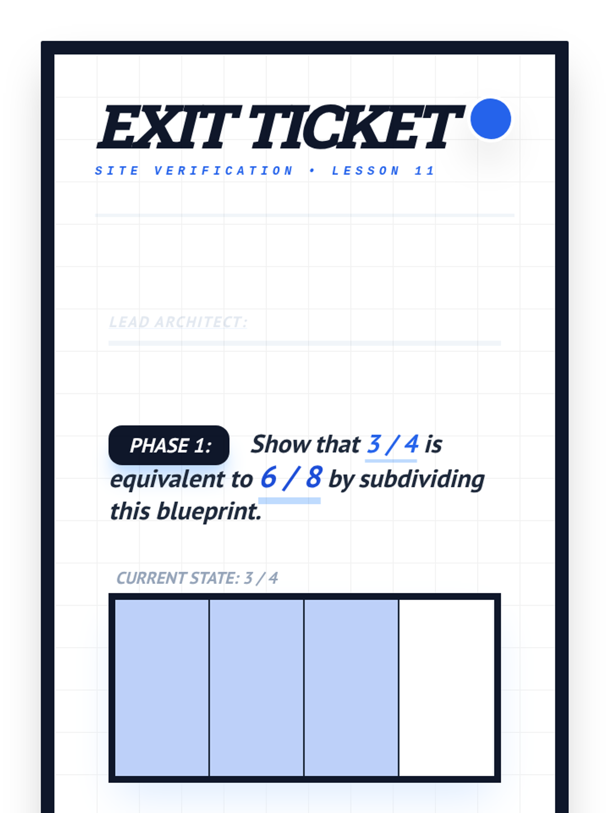 A 12-lesson series focused on understanding fractions as numbers, partitioning shapes and number lines, and exploring equivalence through a 'Blueprint Builder' architectural theme. Students progress from naming parts of a whole to locating fractions greater than 1 on number lines.