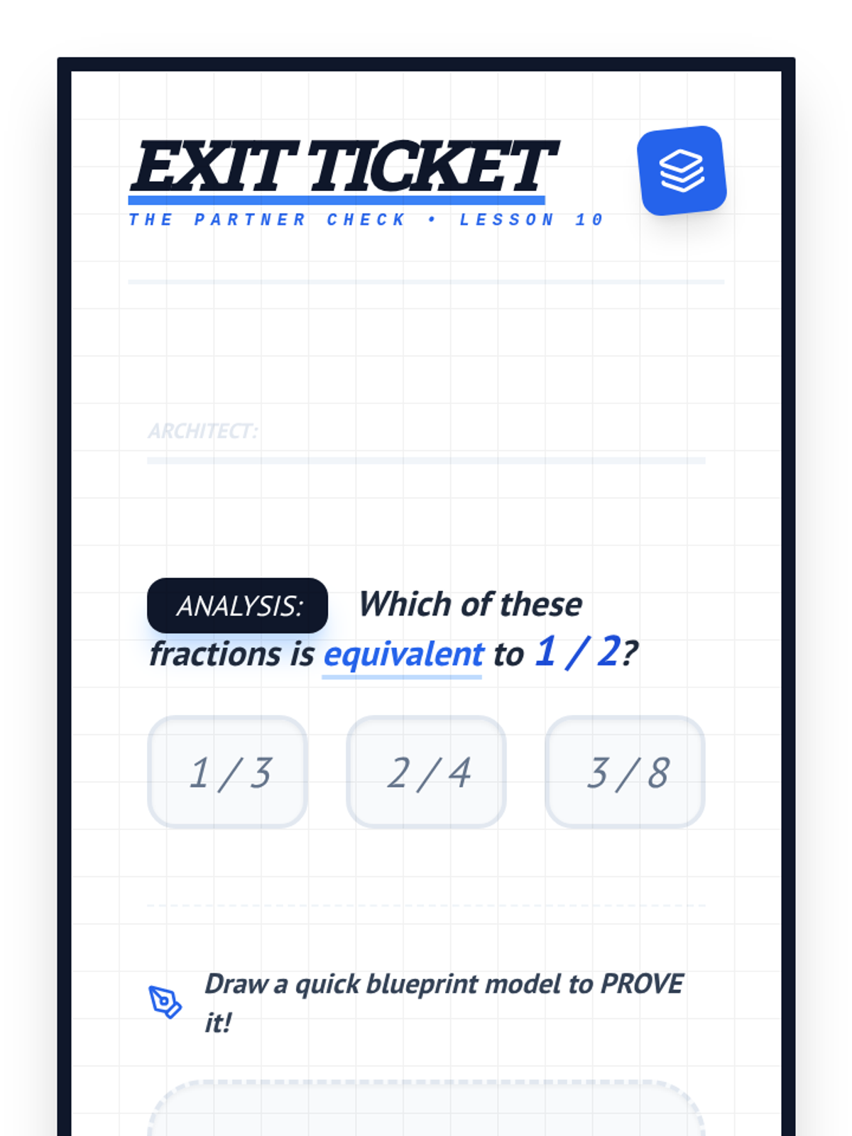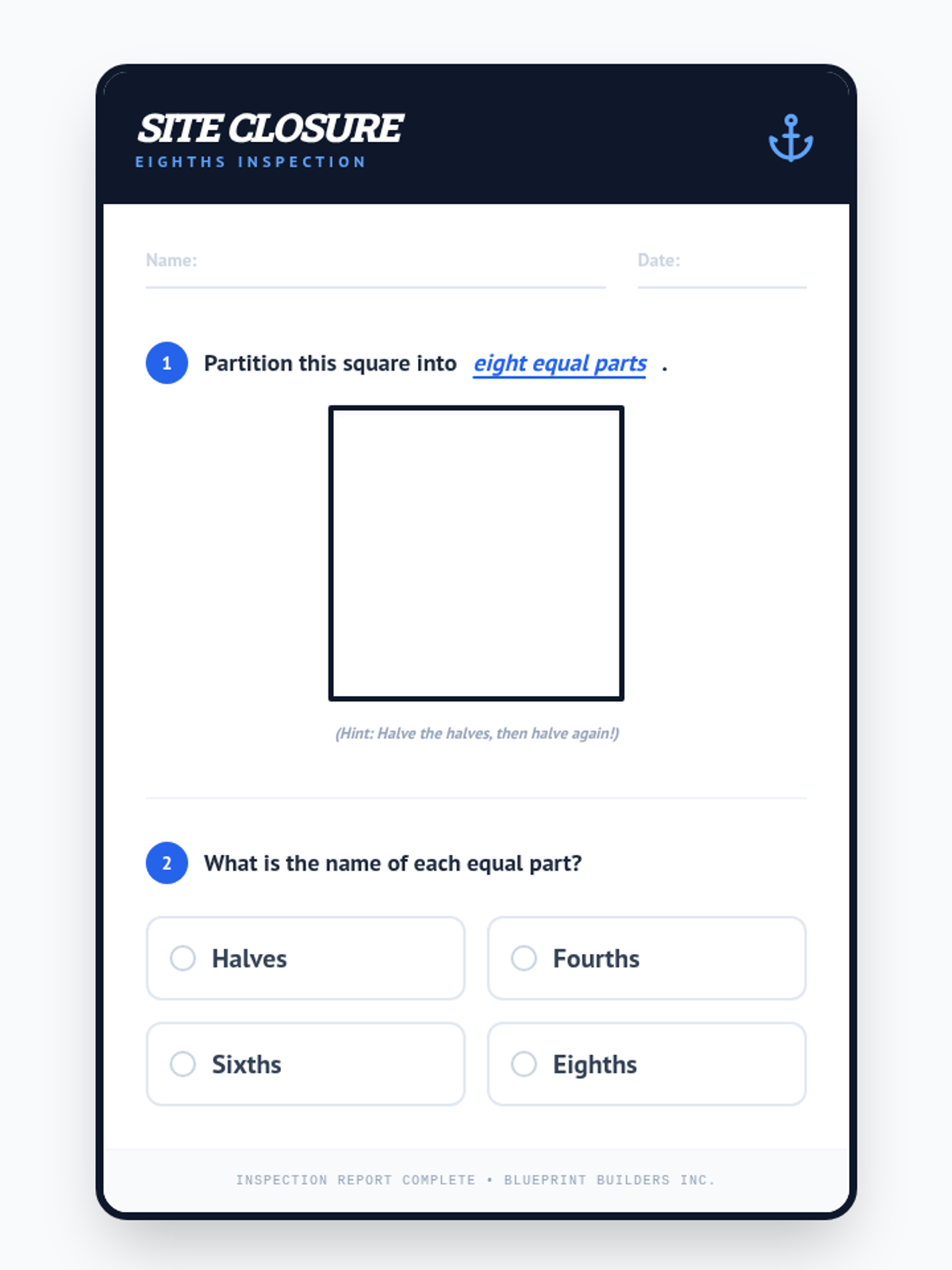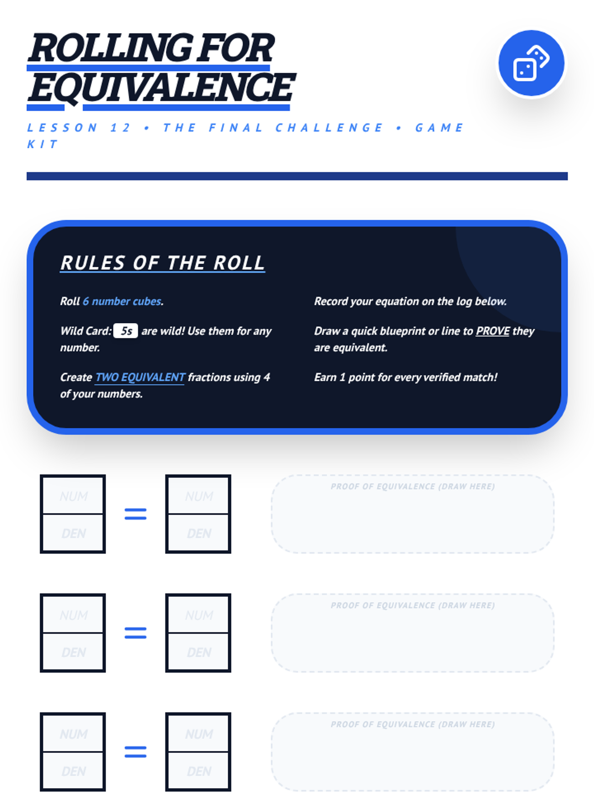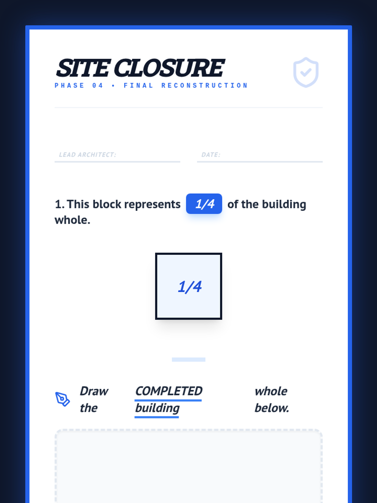 A 12-lesson series focused on understanding fractions as numbers, partitioning shapes and number lines, and exploring equivalence through a 'Blueprint Builder' architectural theme. Students progress from naming parts of a whole to locating fractions greater than 1 on number lines.