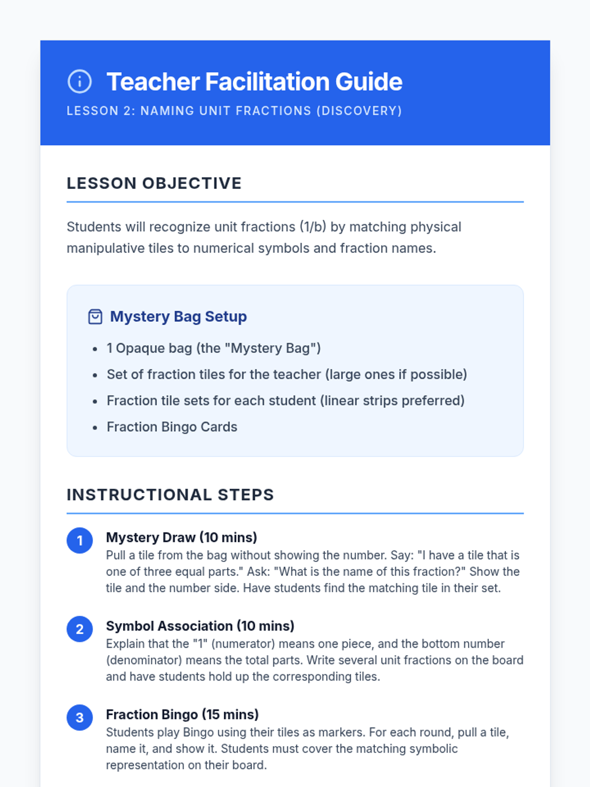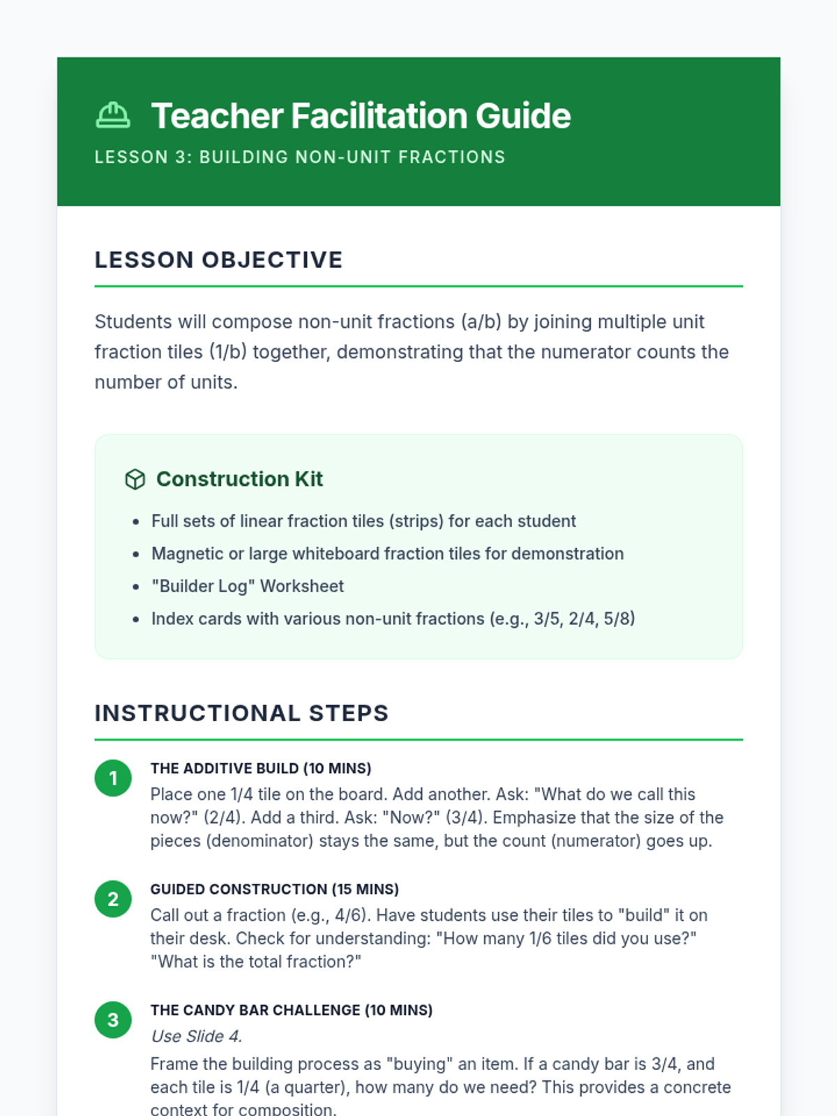 A 5-lesson series for 3rd-grade students focusing on hands-on fraction understanding using manipulatives like playdough, fraction tiles, and number lines. Students move from physical partitioning to abstract numerical representations and equivalence.