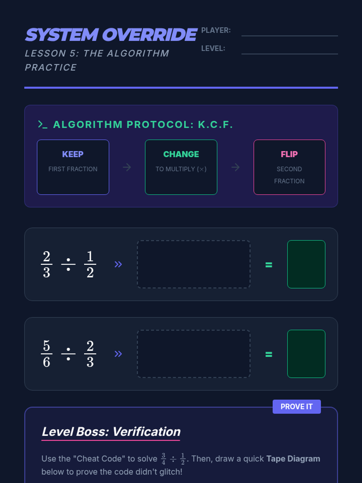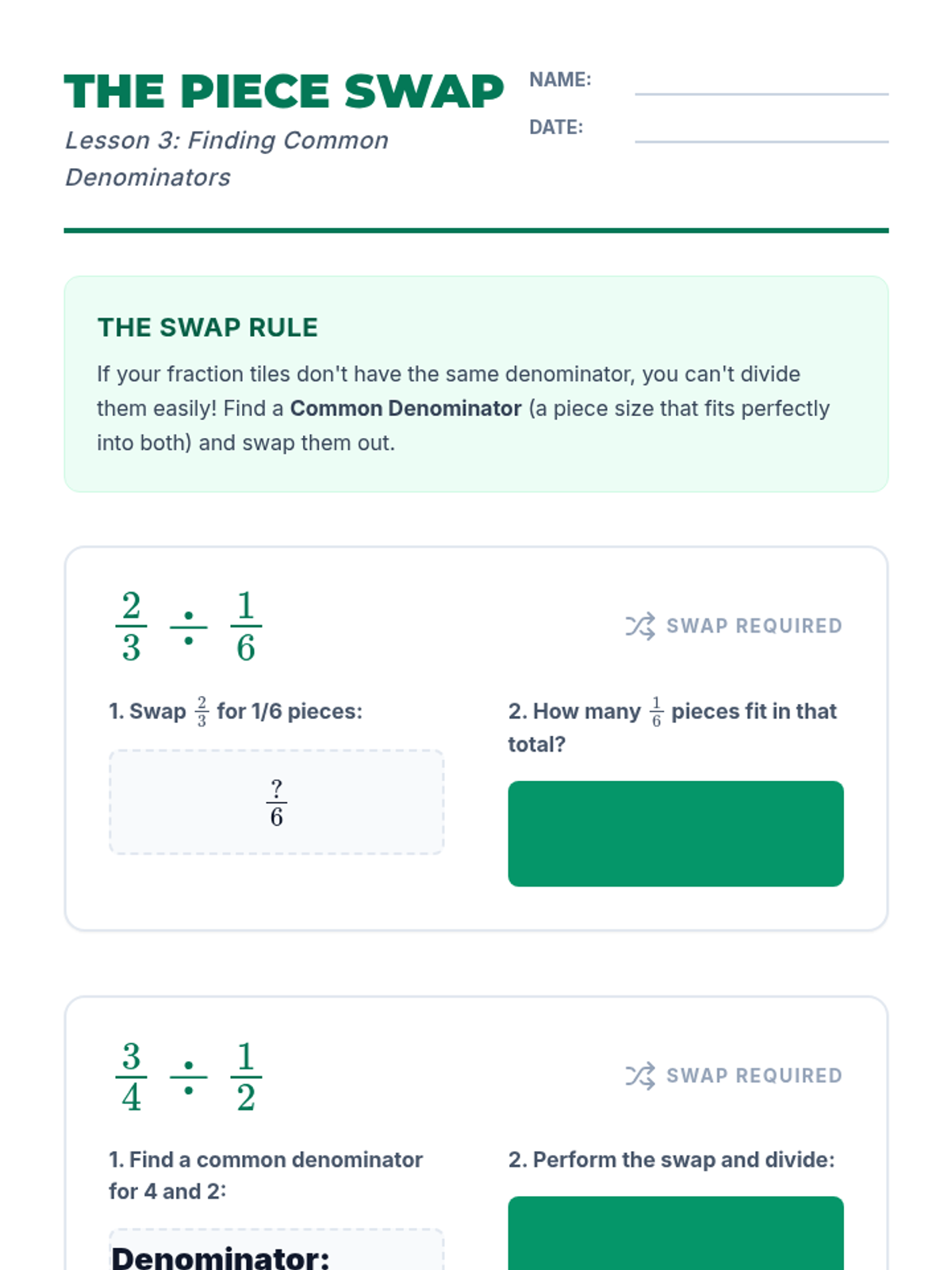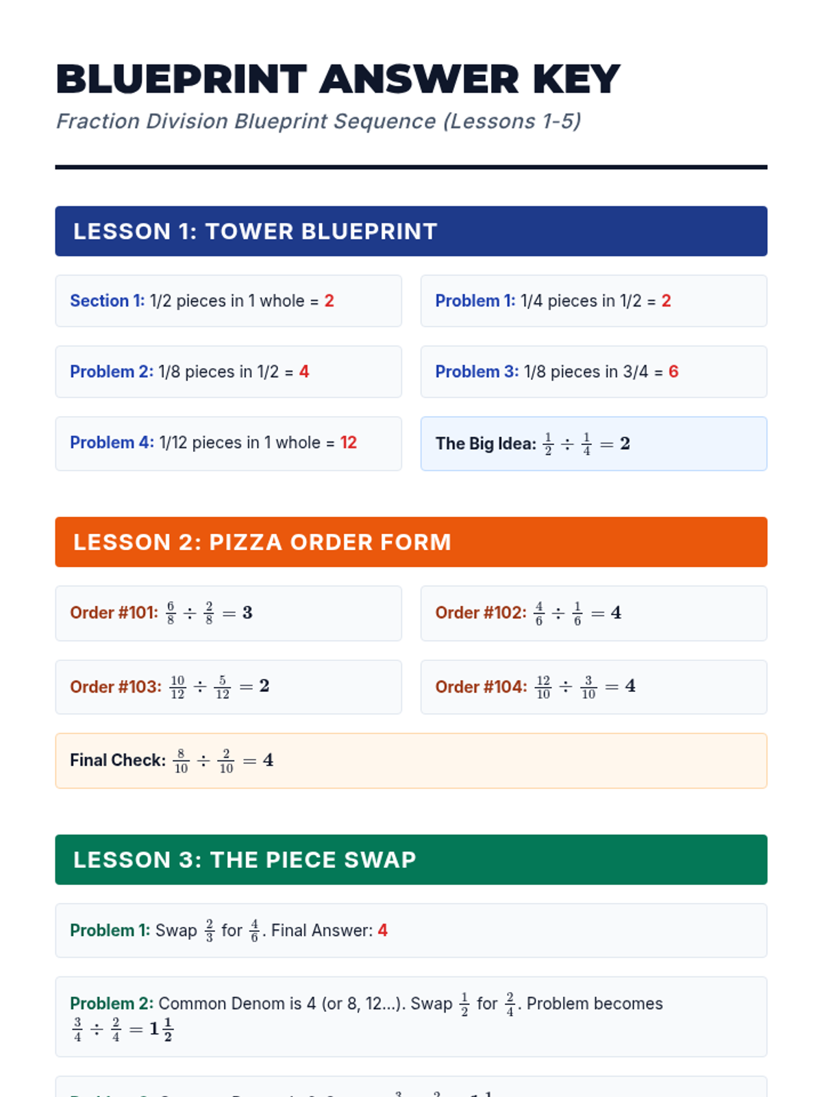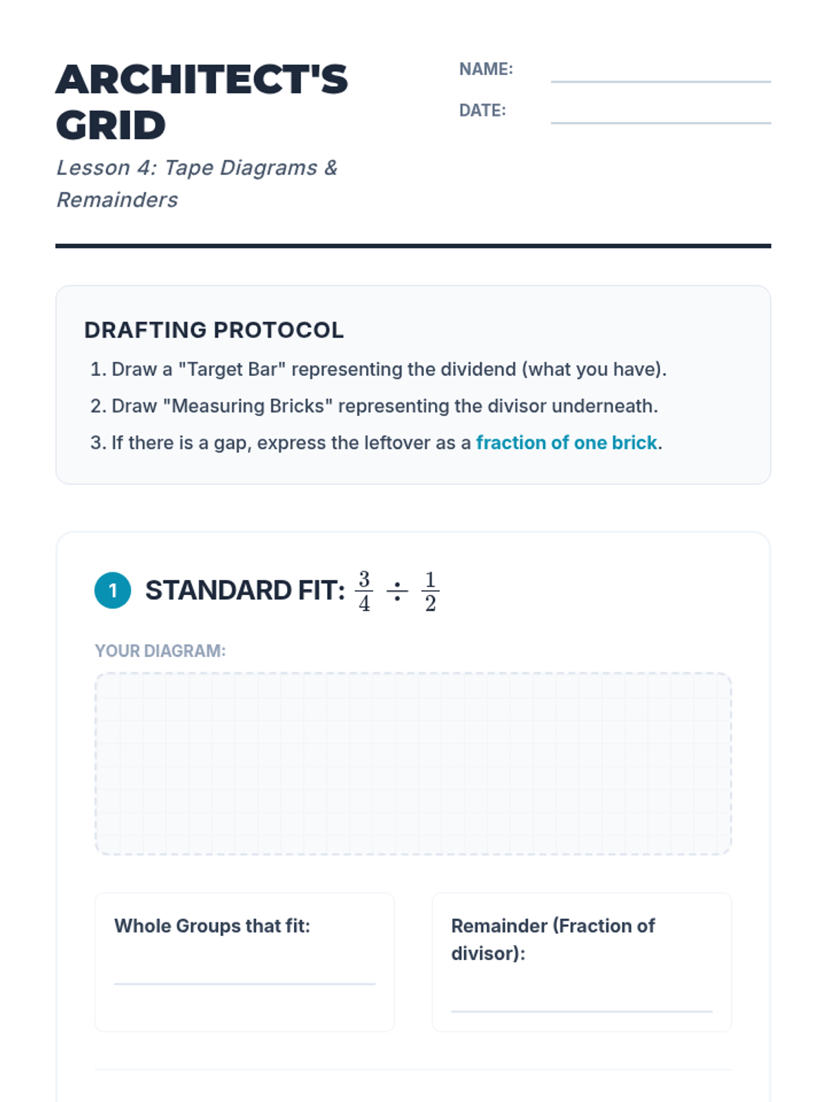 A specialized sequence for 6th-grade academic support focused on visual and concrete understanding of fraction division. Students use fraction towers and pattern blocks to move from the concept of 'how many fit' to the standard algorithm, with a heavy emphasis on interpreting remainders.