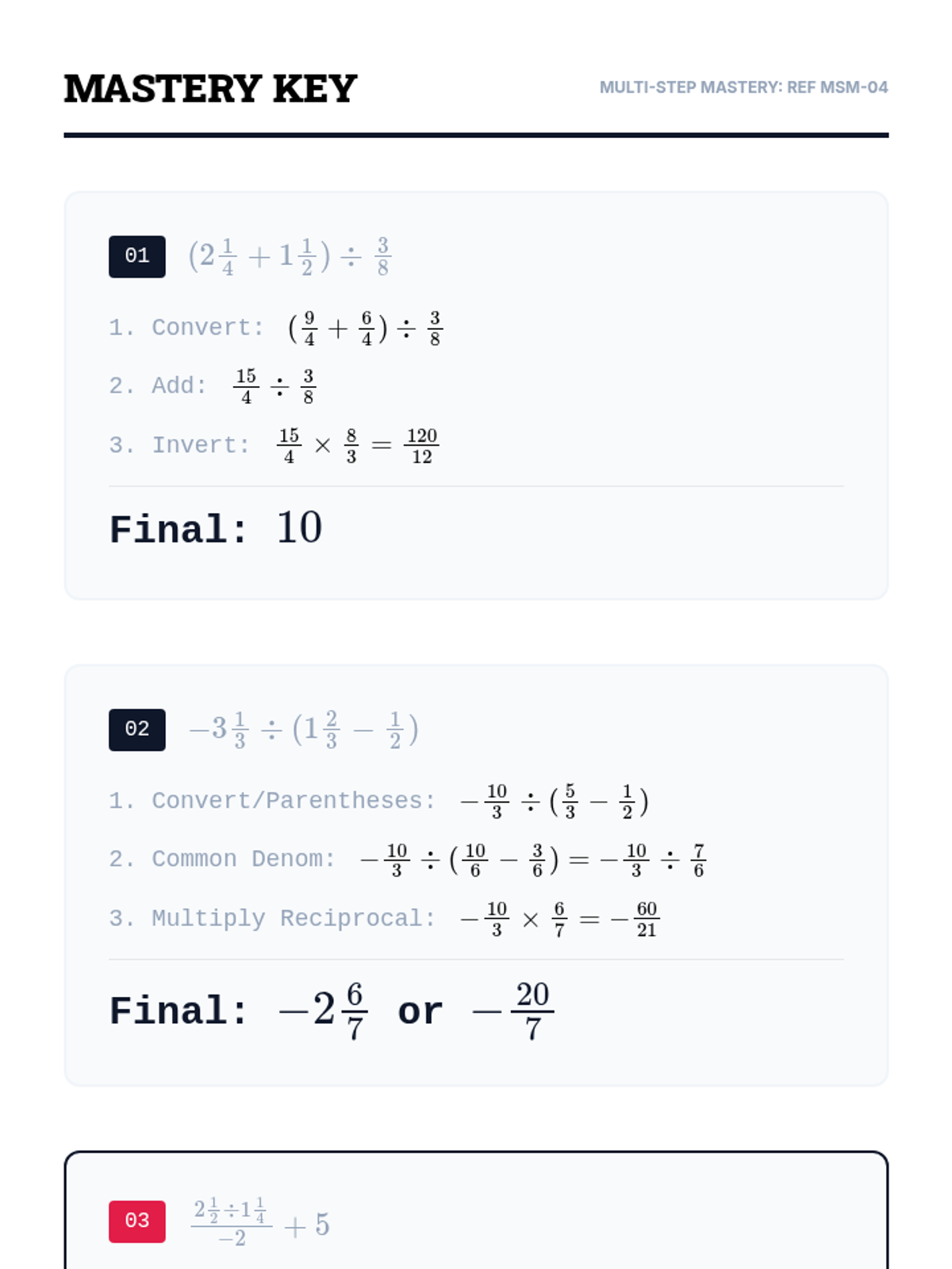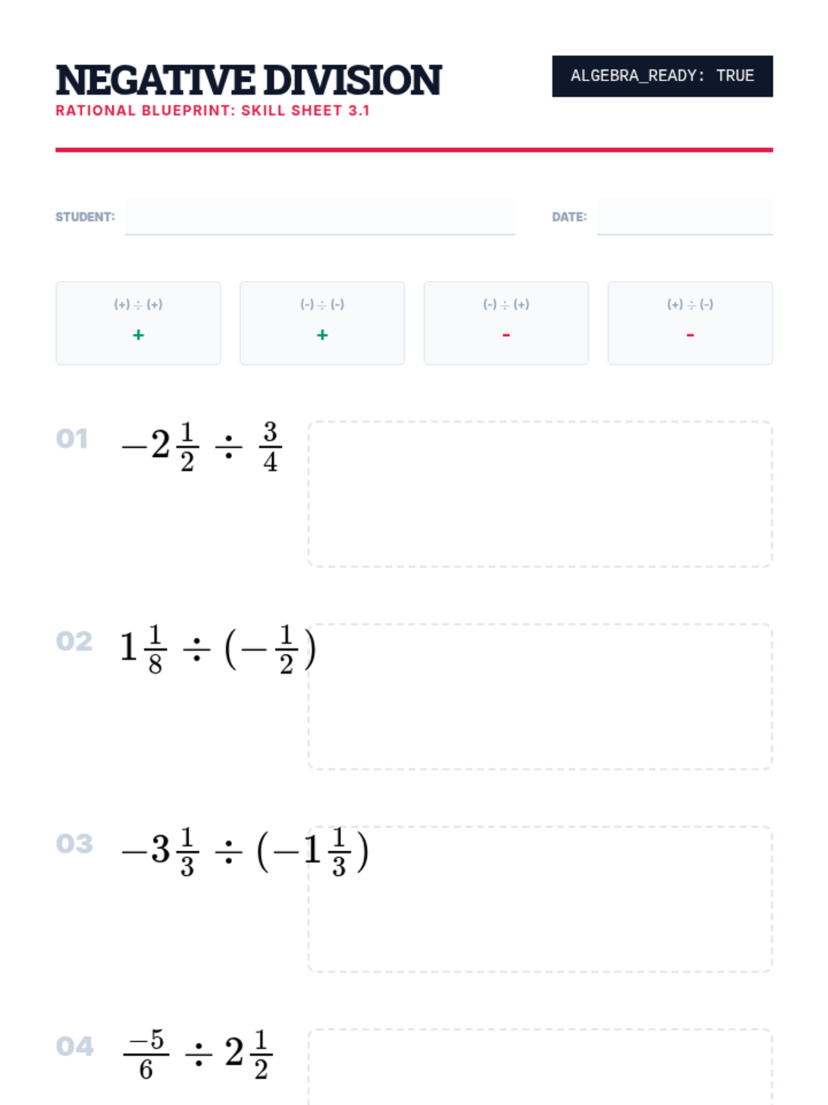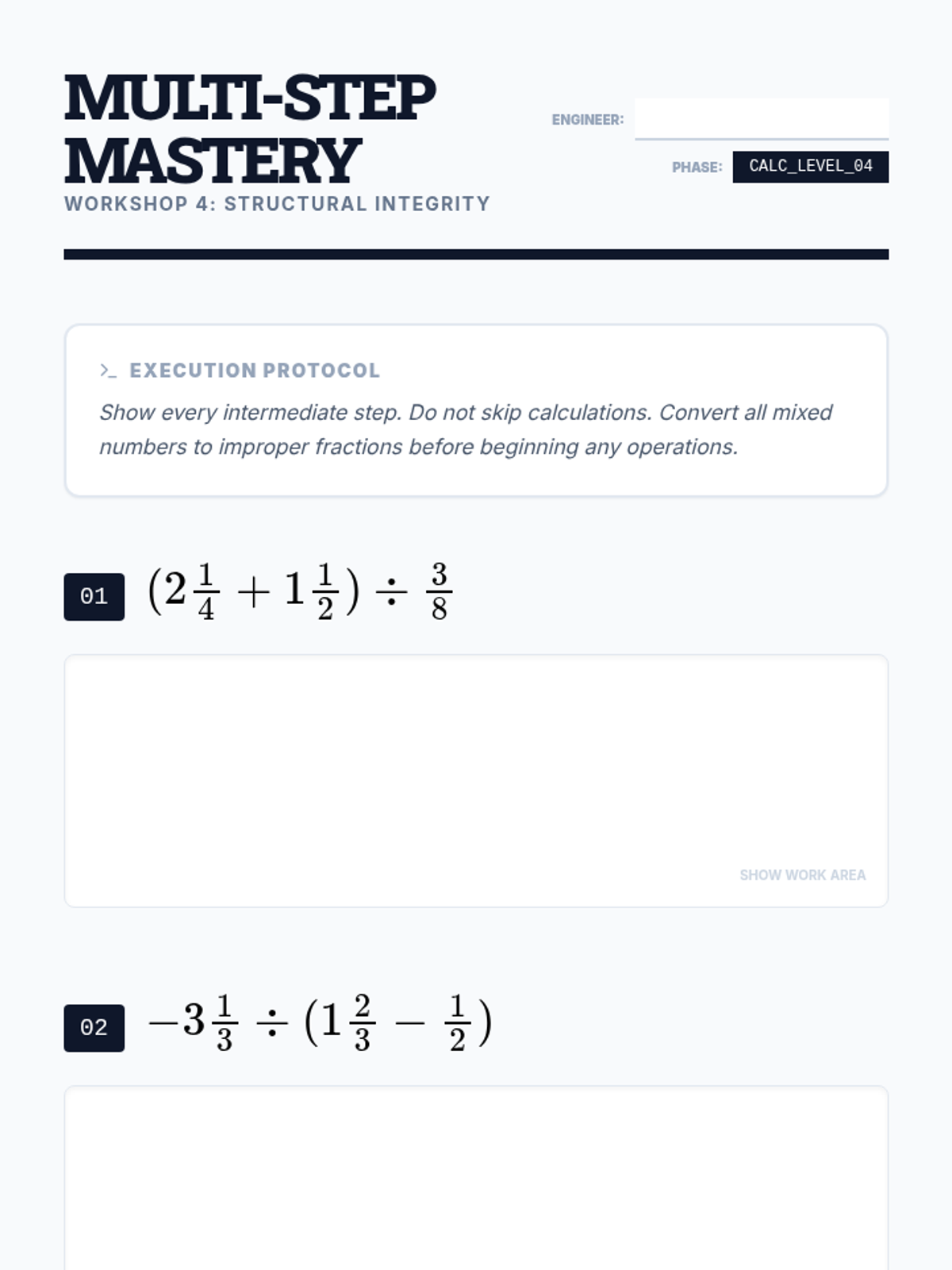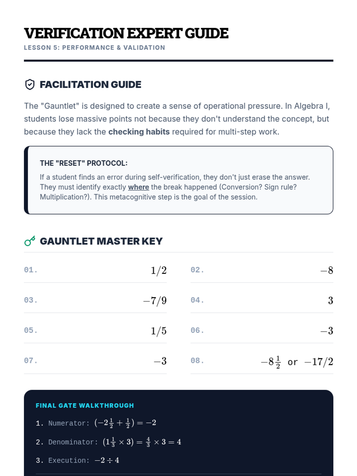 A 9th-grade workshop-style sequence focused on procedural fluency with mixed numbers and negative rational numbers. Students progress from basic conversion and estimation to complex order of operations and signed fraction division, preparing them for algebraic success.