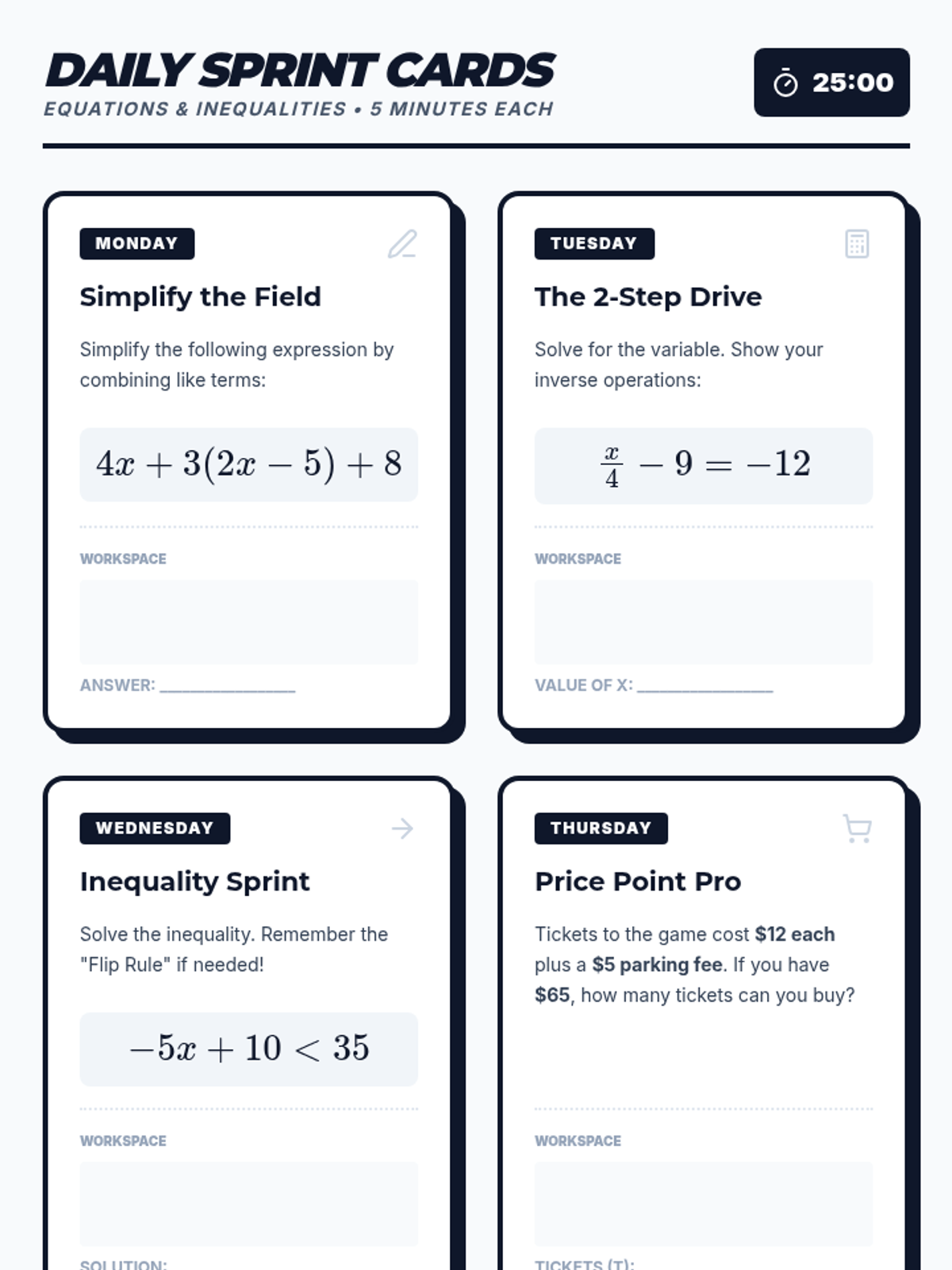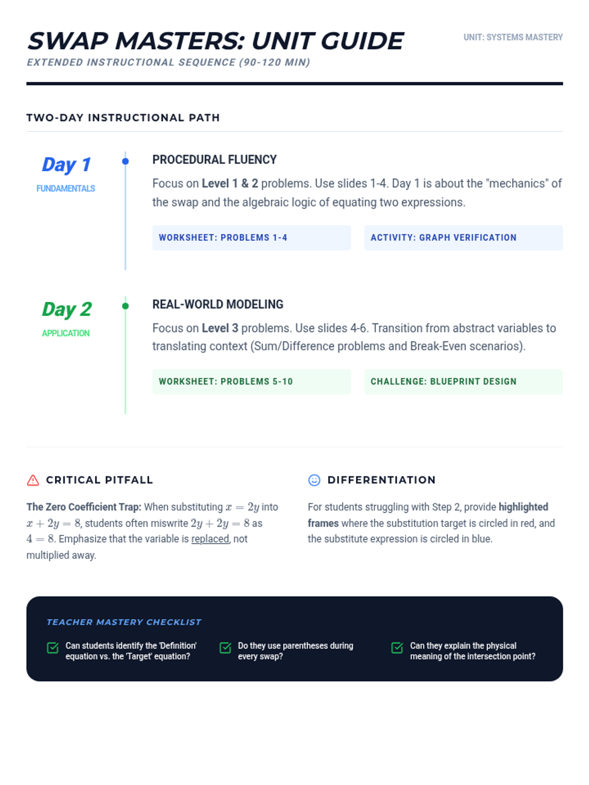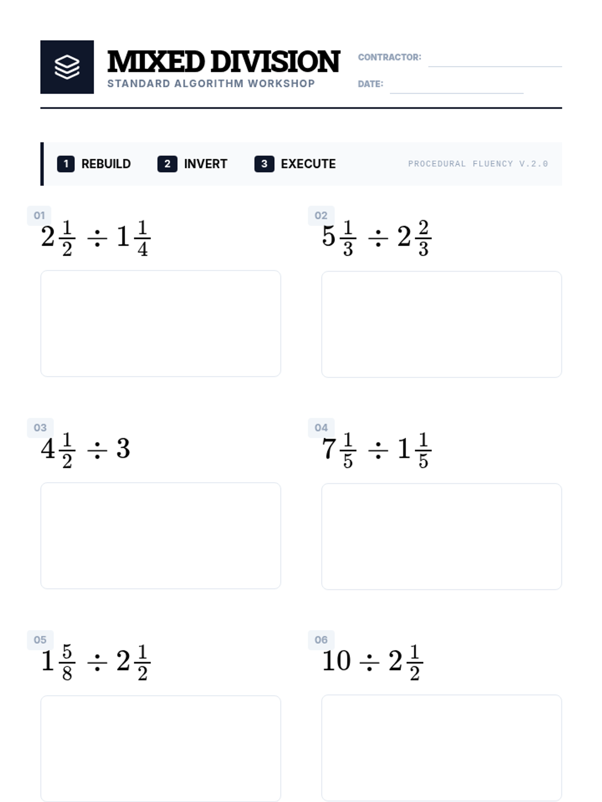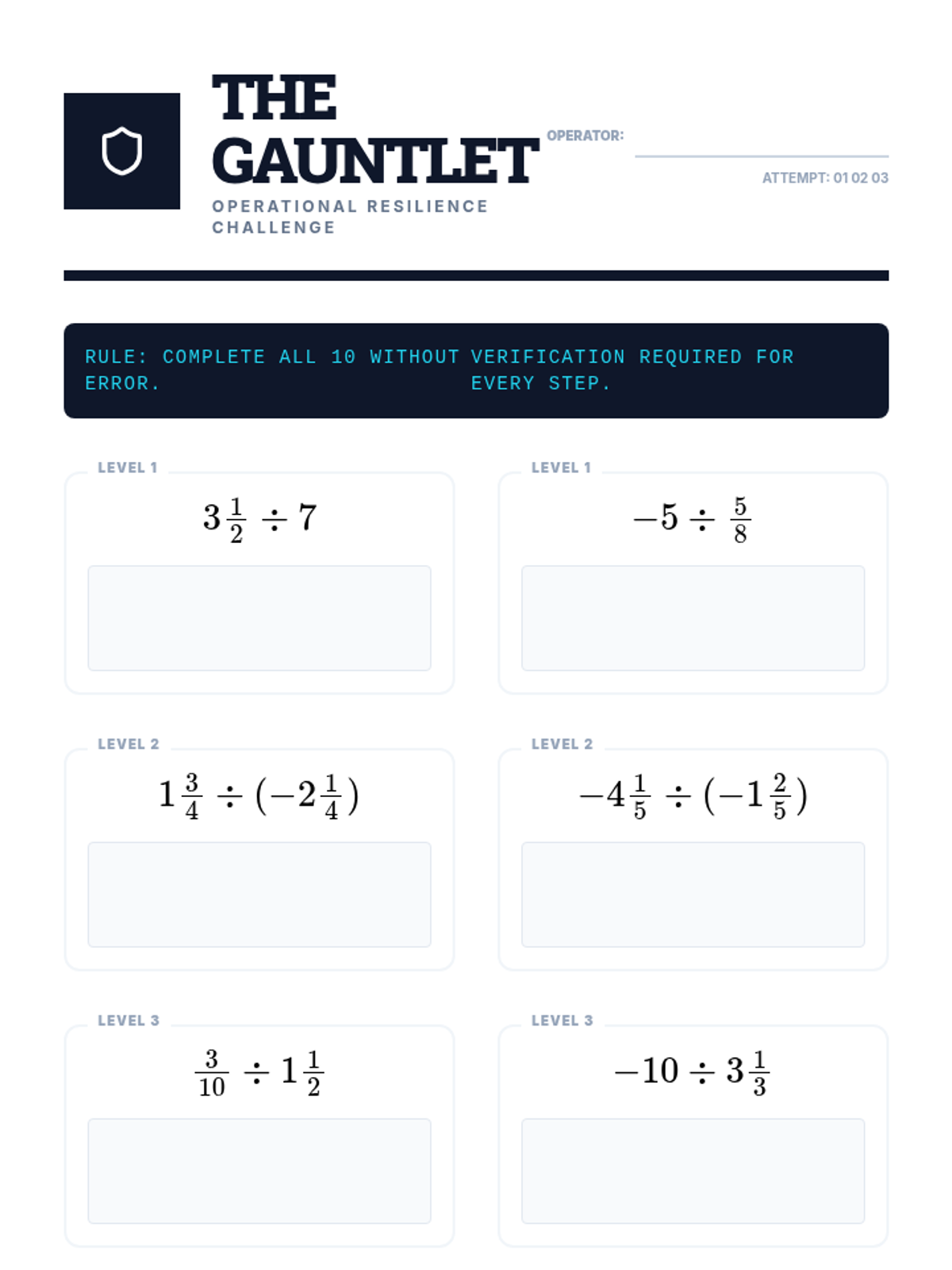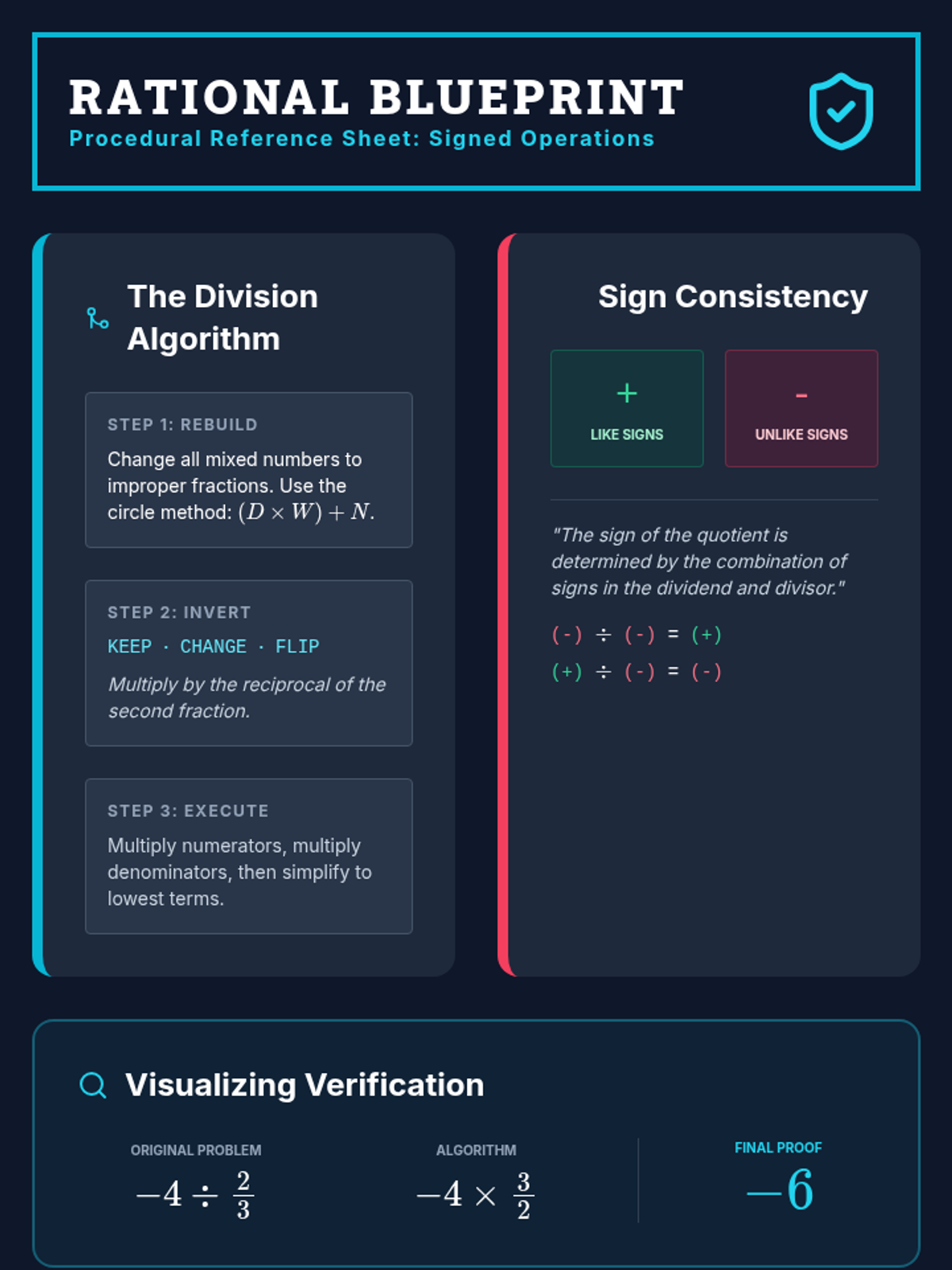 A 9th-grade workshop-style sequence focused on procedural fluency with mixed numbers and negative rational numbers. Students progress from basic conversion and estimation to complex order of operations and signed fraction division, preparing them for algebraic success.