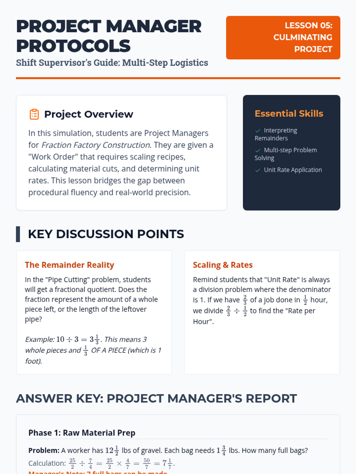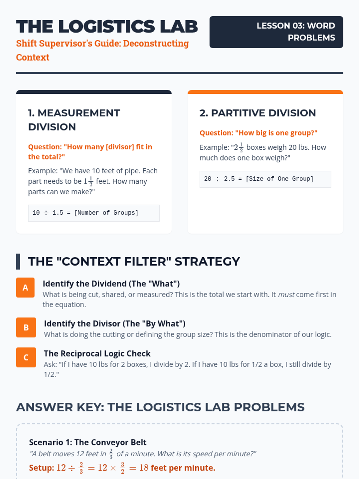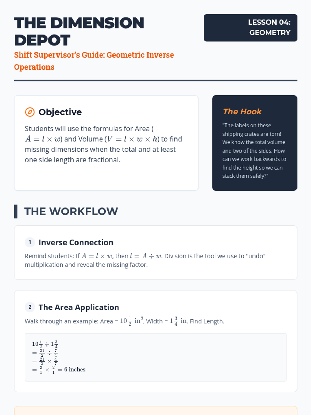 This sequence guides students from conceptual modeling of fraction division to applying the standard algorithm with mixed numbers in complex geometric and real-world contexts. Students will explore the 'why' behind the reciprocal before mastering the 'how' and applying it to find missing dimensions and unit rates.
