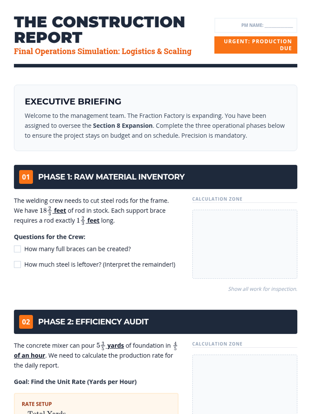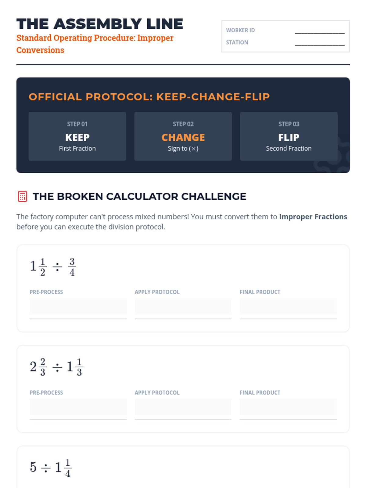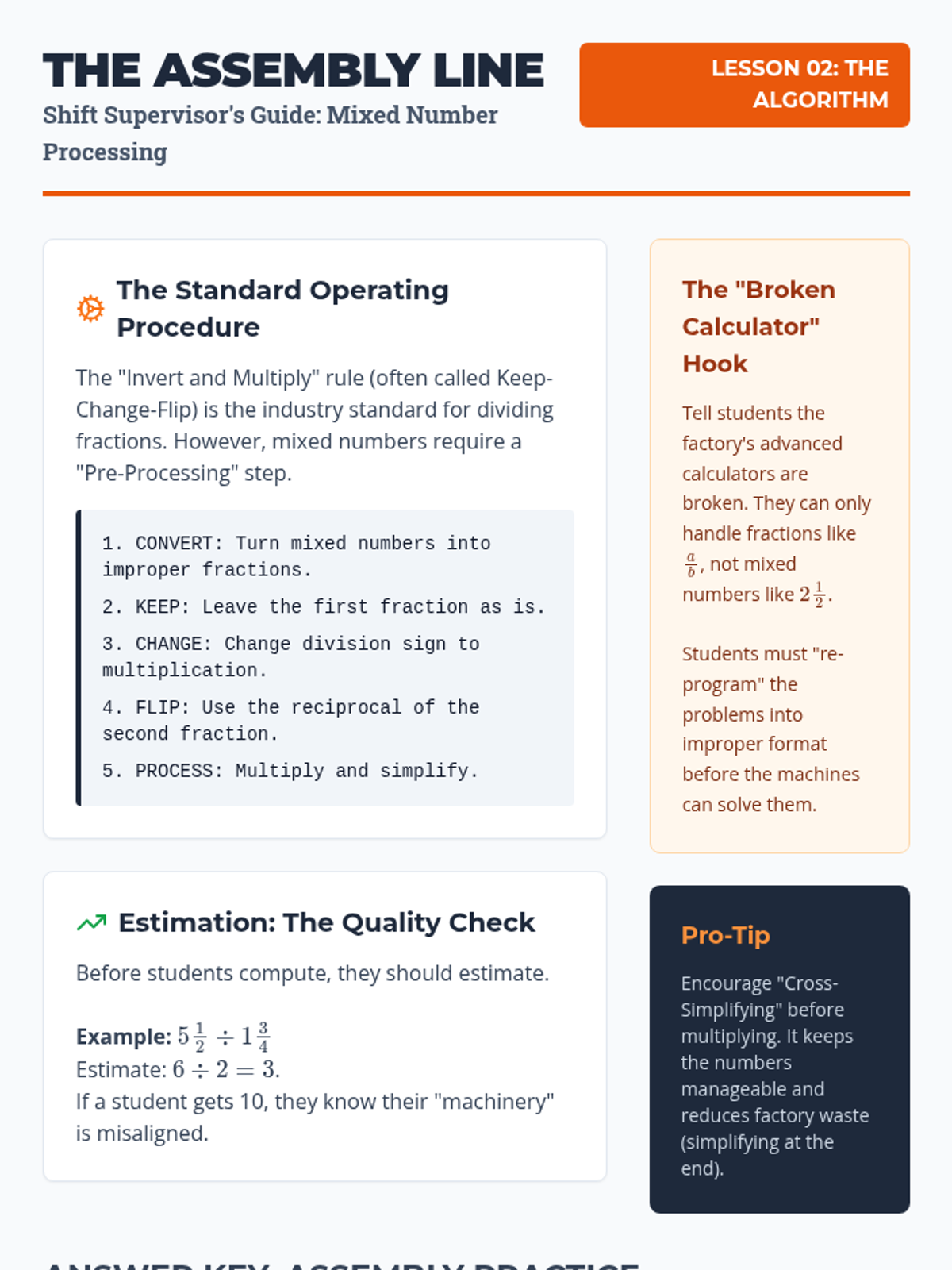 This sequence guides students from conceptual modeling of fraction division to applying the standard algorithm with mixed numbers in complex geometric and real-world contexts. Students will explore the 'why' behind the reciprocal before mastering the 'how' and applying it to find missing dimensions and unit rates.