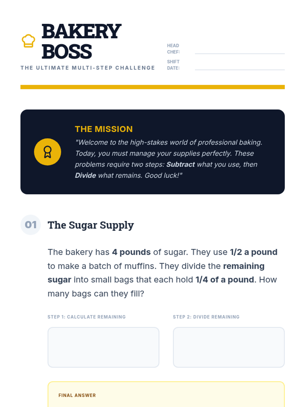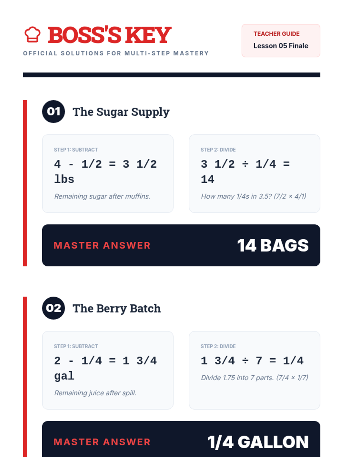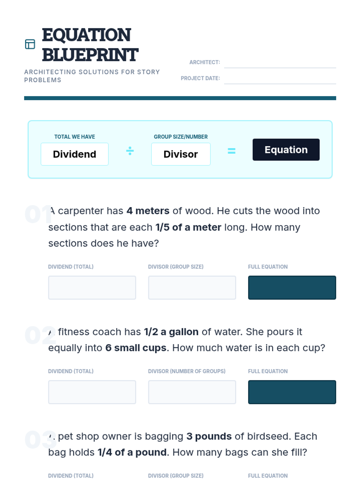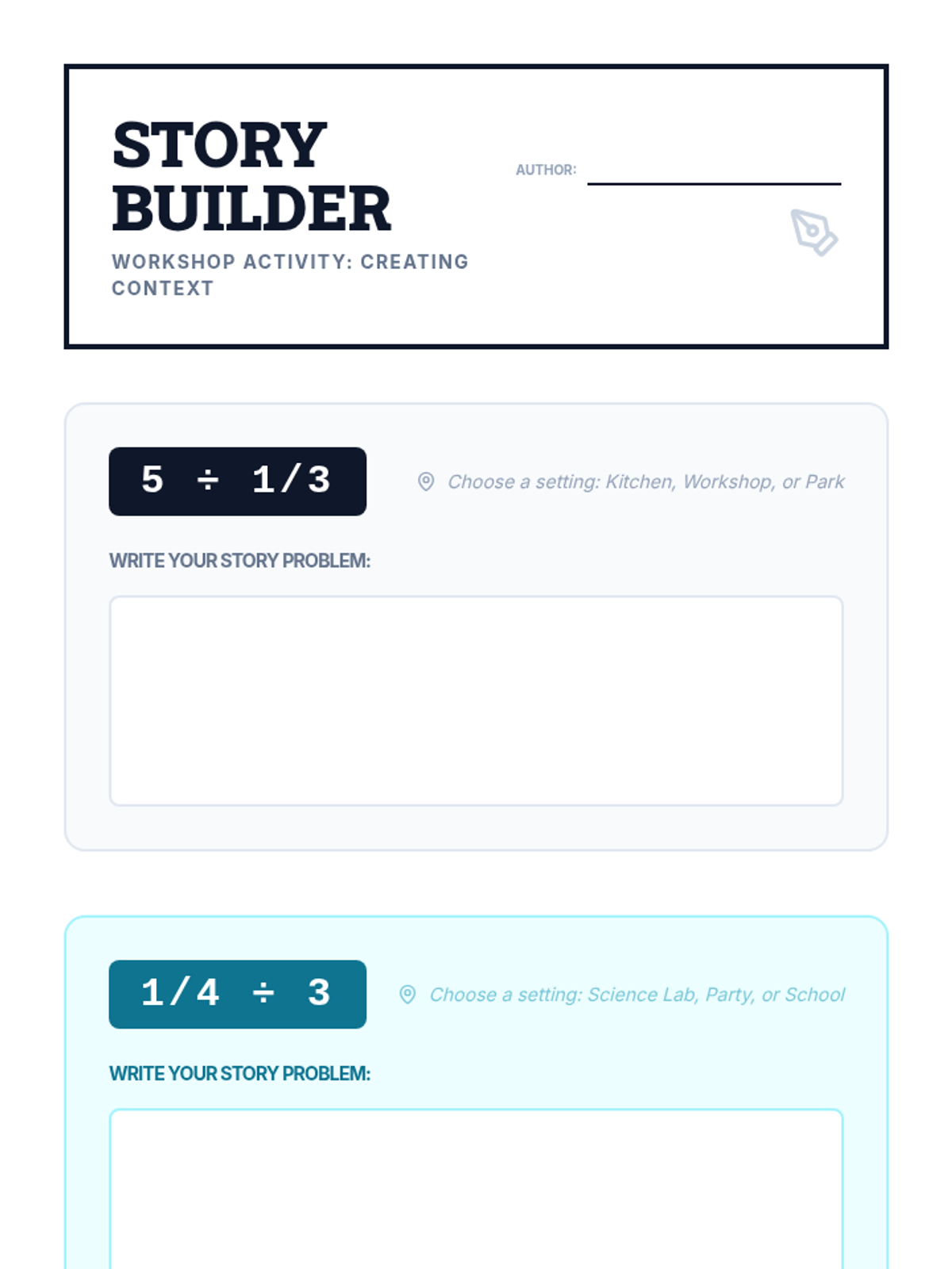 This sequence immerses 5th-grade students in real-world scenarios requiring fraction division. Students learn to distinguish between multiplication and division contexts, translate stories into equations, and solve complex multi-step problems using visual modeling and linguistic clues.