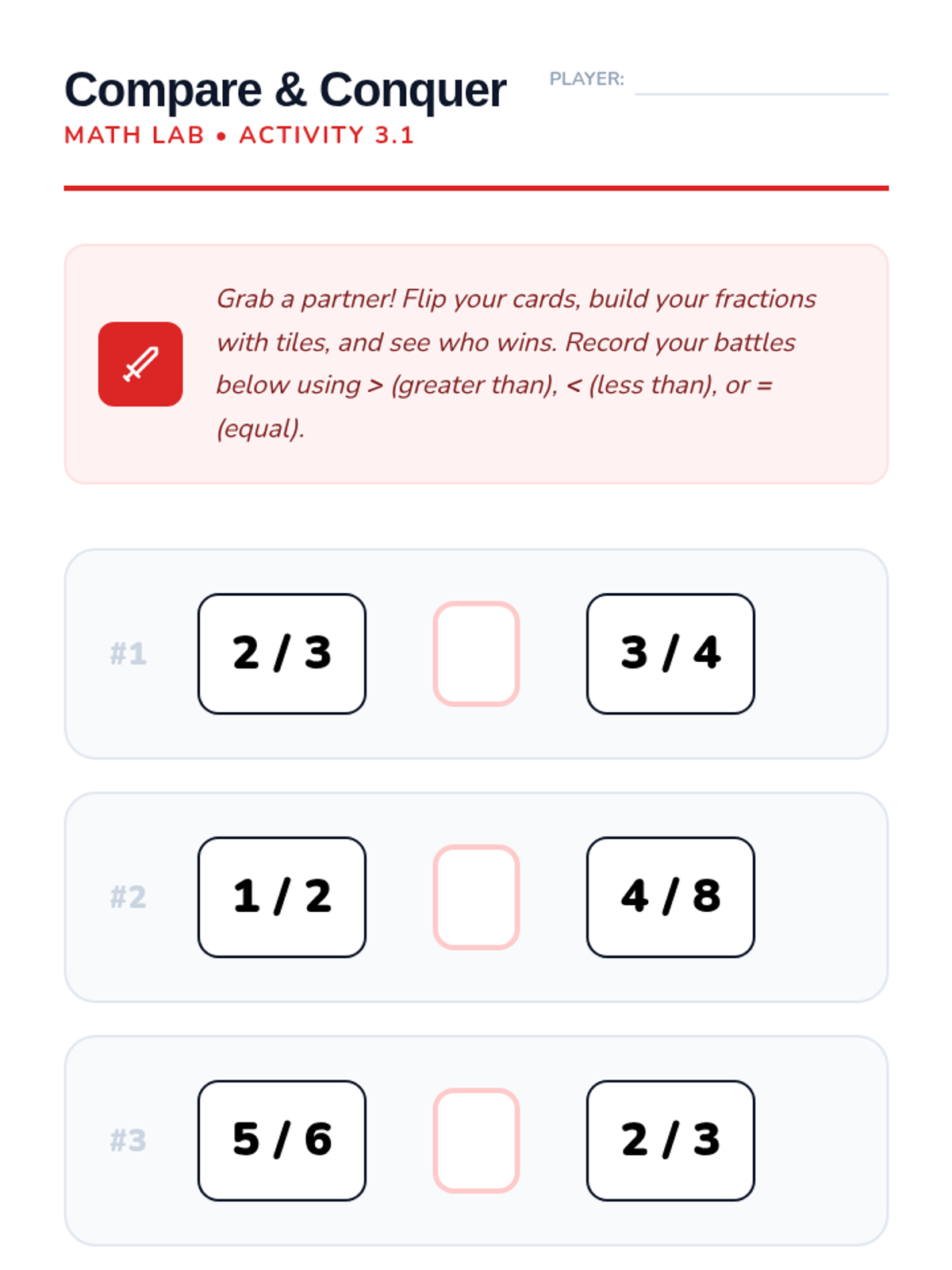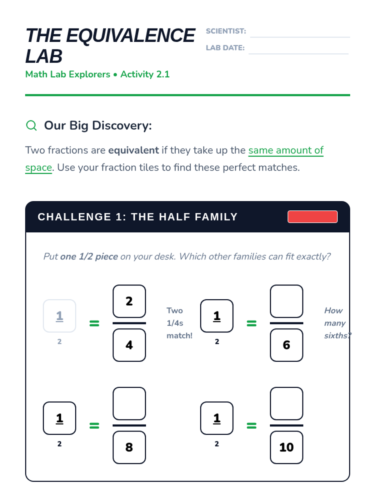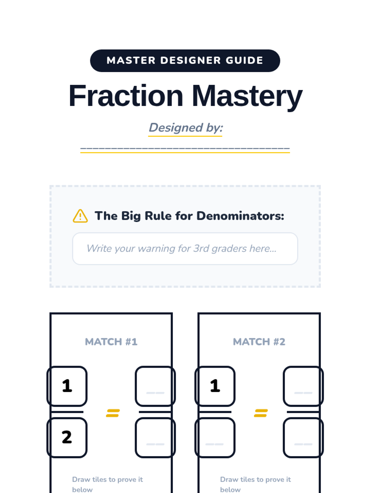 A 5-lesson sequence for 4th-grade students (Special Education support) focused on using manipulatives like fraction strips and tiles to understand equivalence and comparison. The sequence moves from concrete exploration of denominators to abstract placement on a number line, culminating in a student-created reference guide.