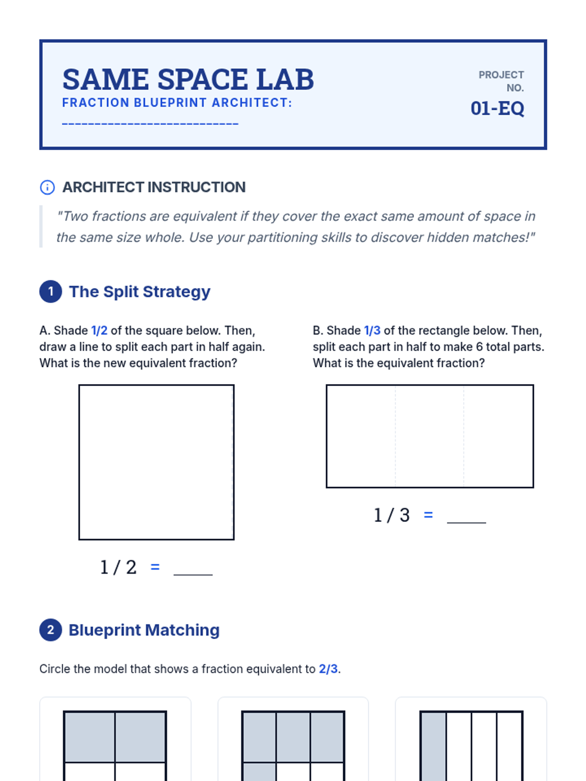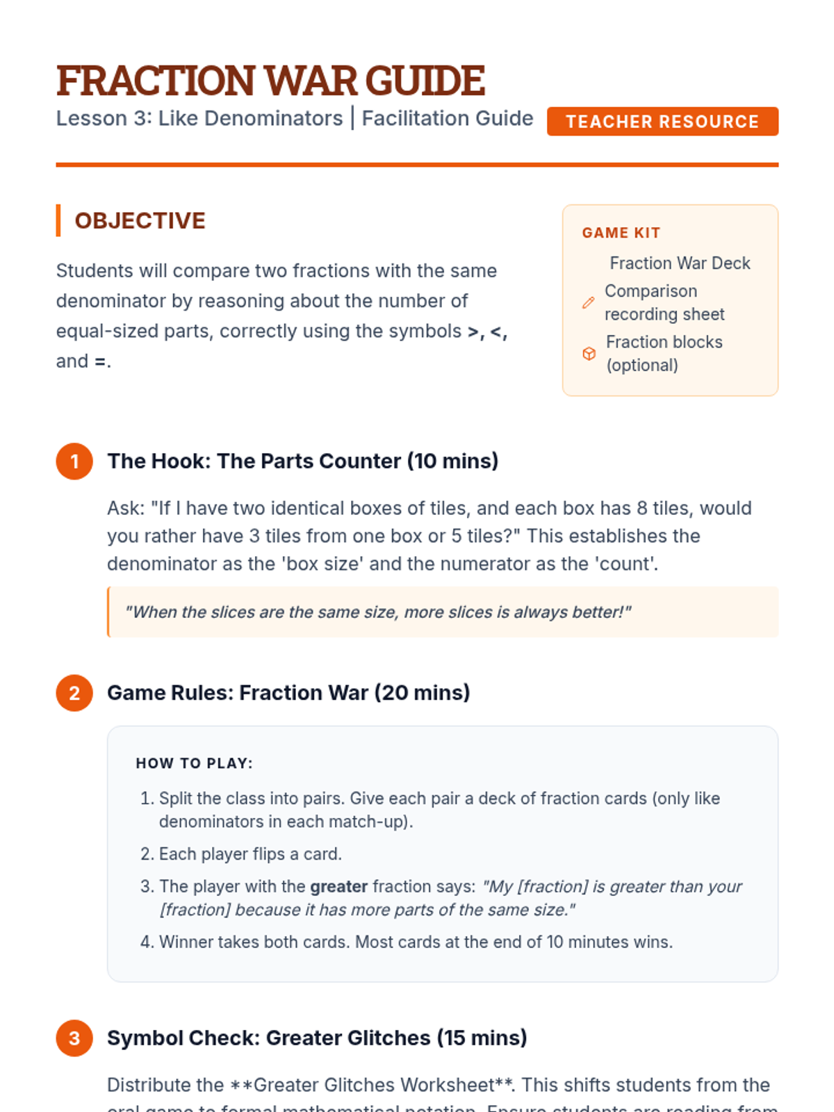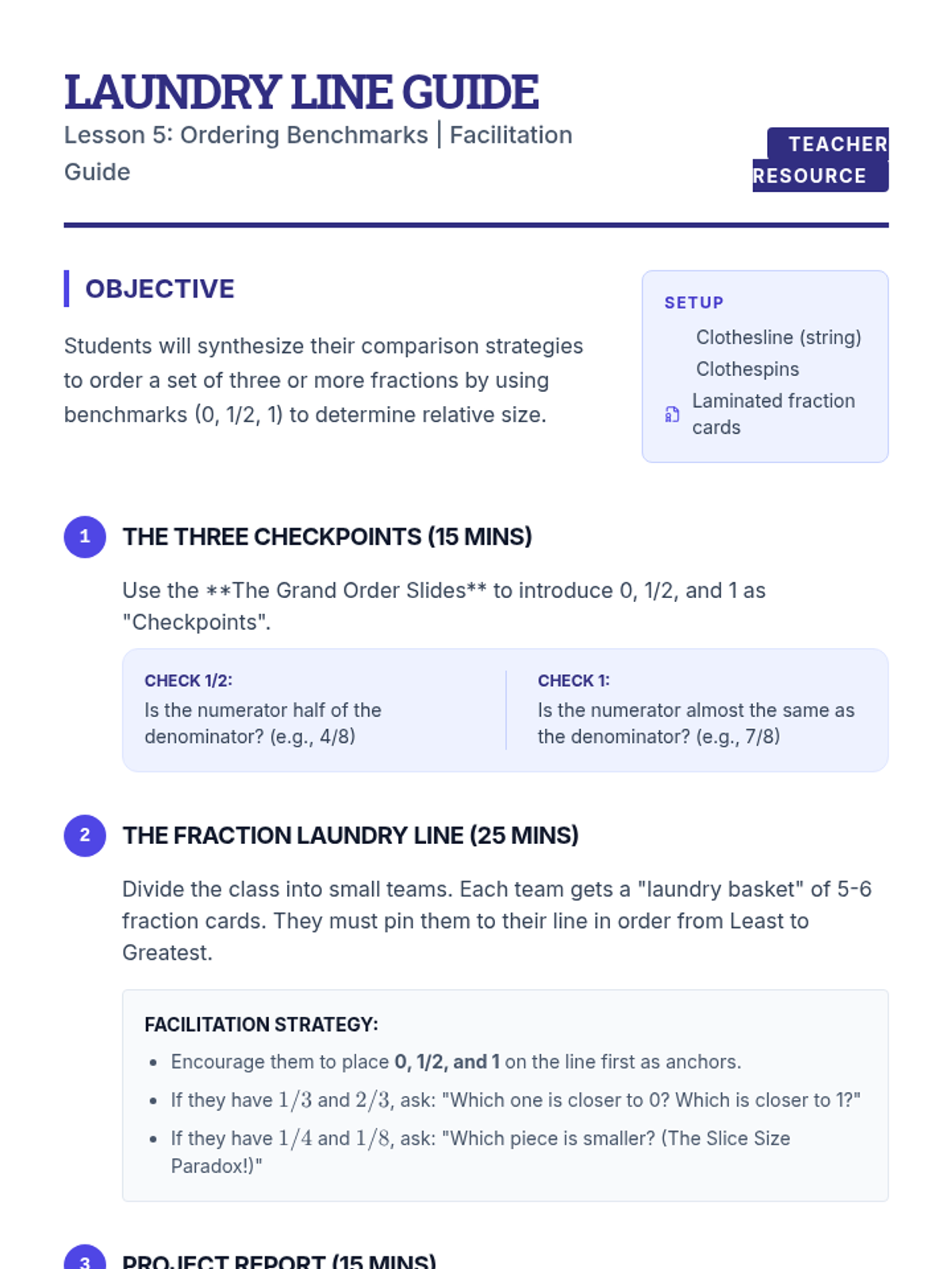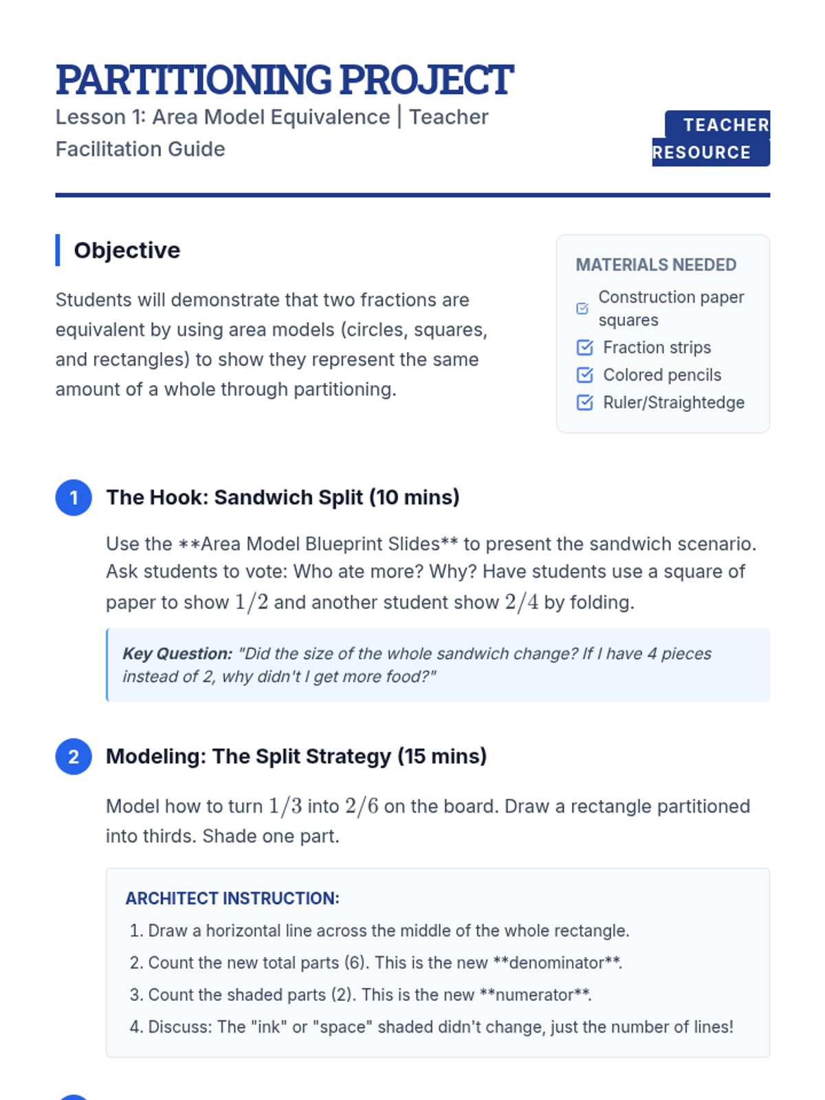 A comprehensive 3rd-grade sequence exploring fraction equivalence and ordering through area models, number lines, and conceptual reasoning about part sizes. Students move from concrete partitioning to abstract comparison using benchmarks and visual models.