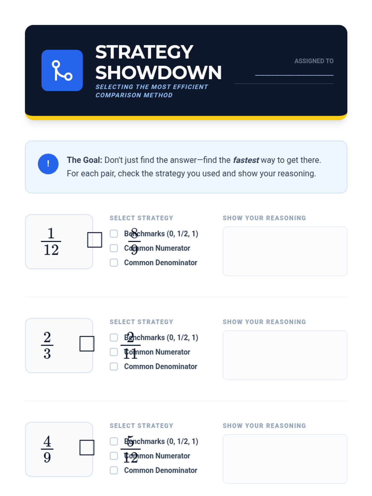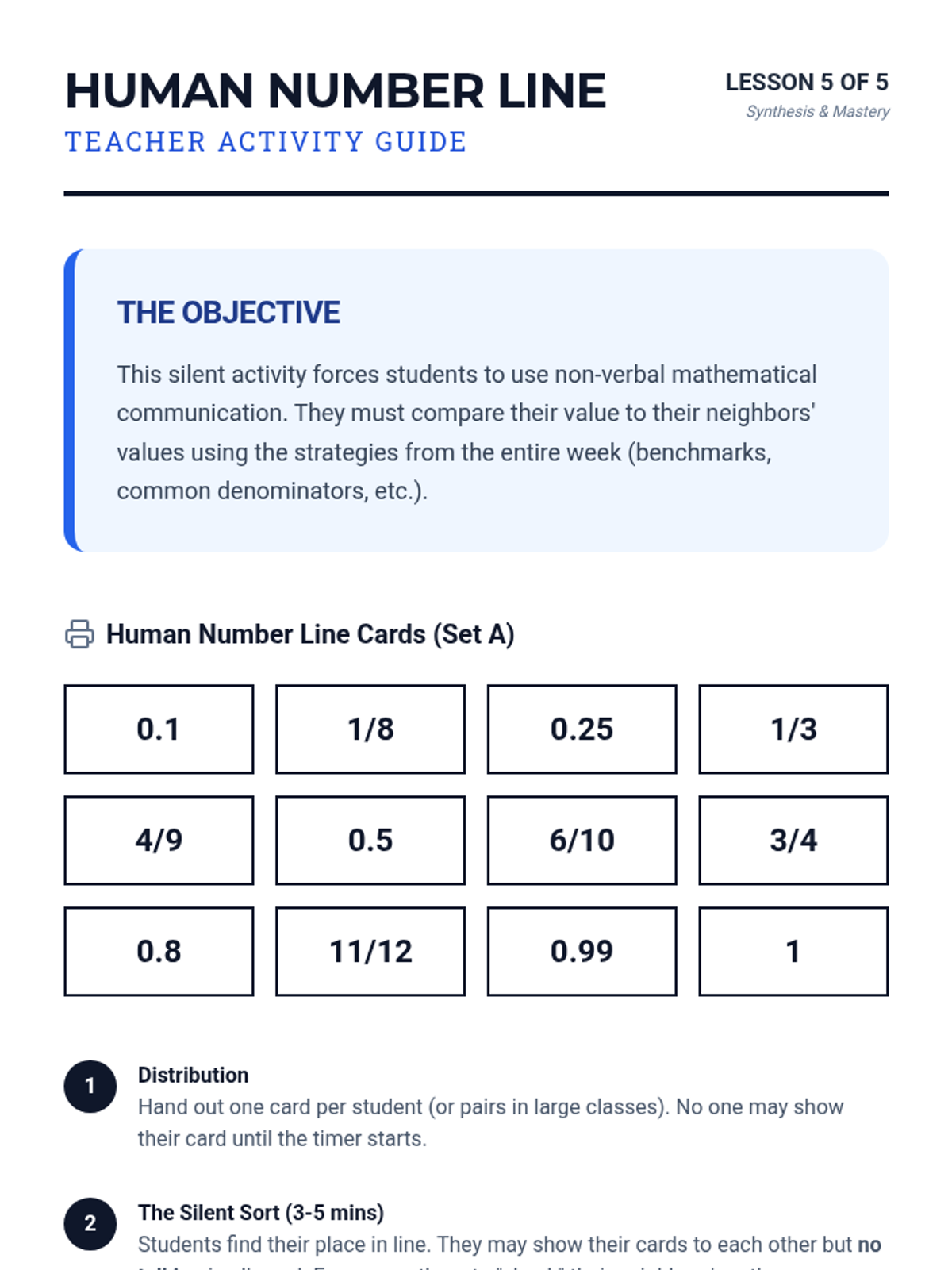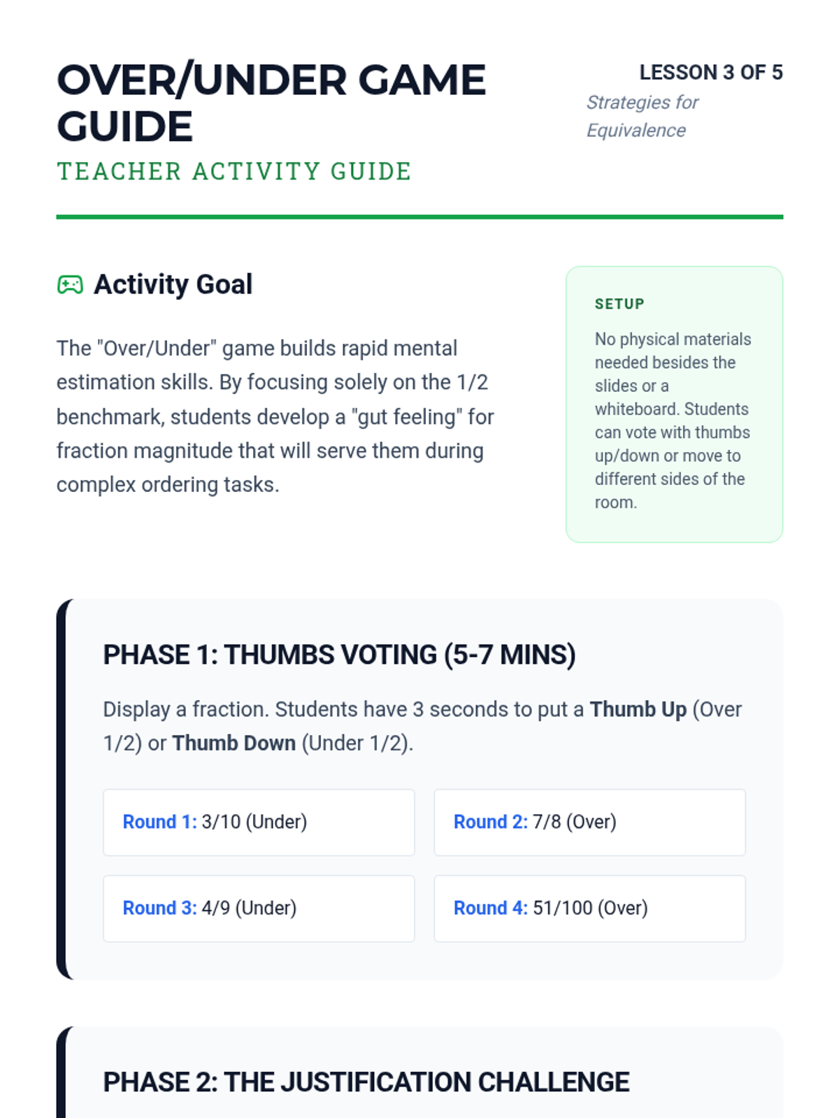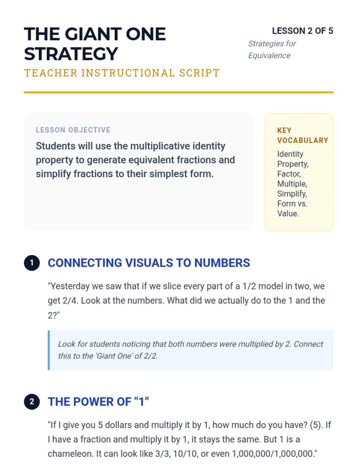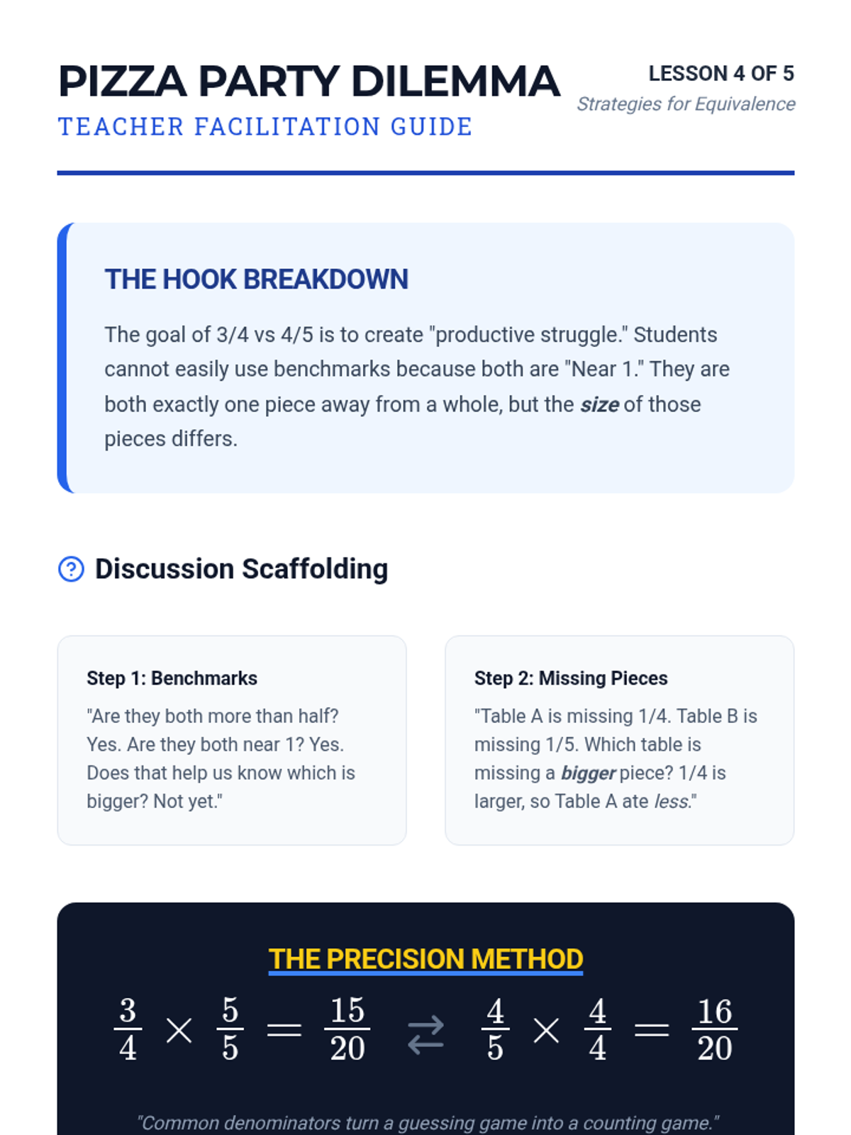 A comprehensive workshop-style sequence for 6th-grade students to master fraction equivalence and ordering. The sequence moves from visual area models to algebraic strategies using the multiplicative identity, culminating in precise number line placement and justification.