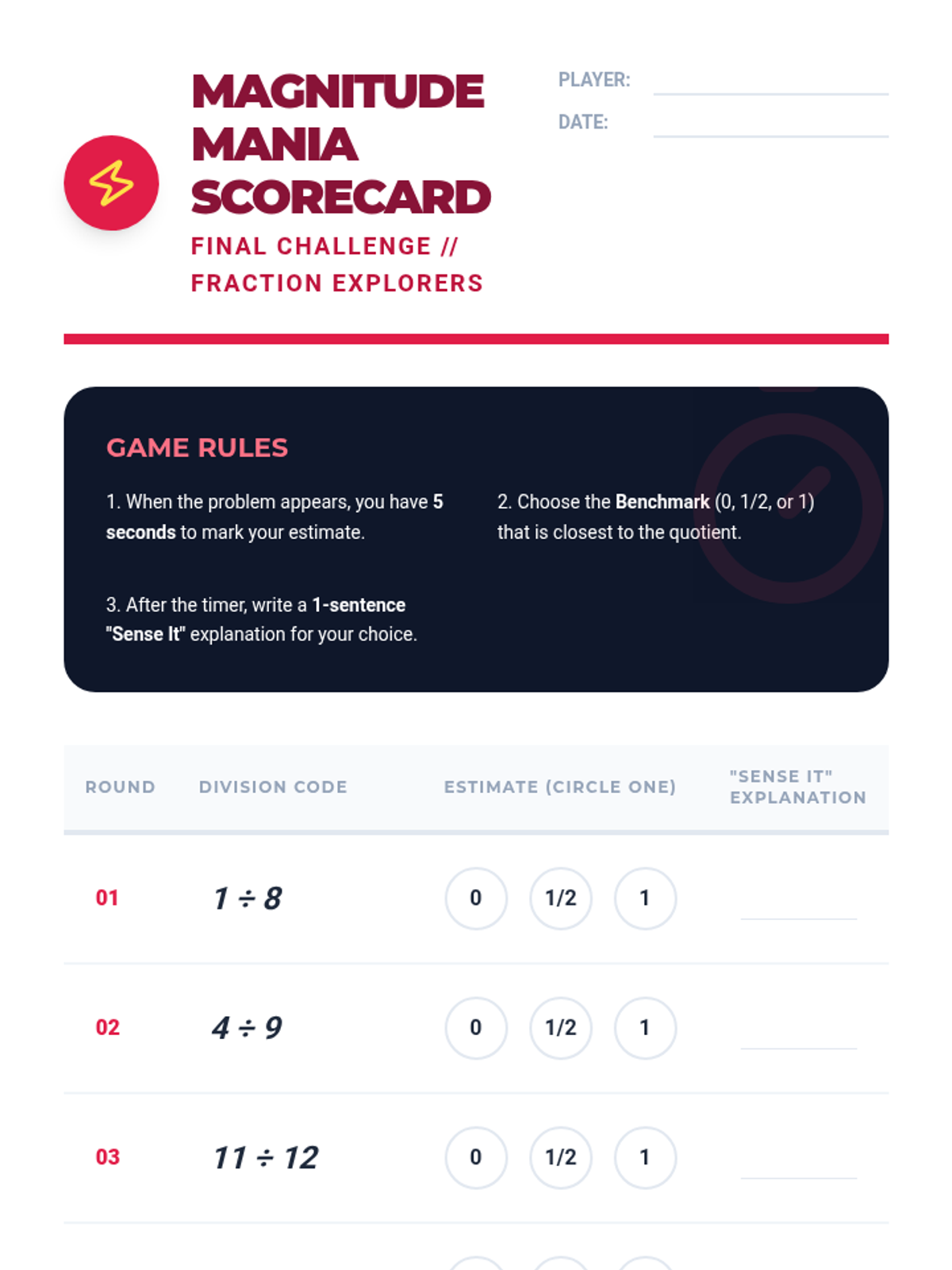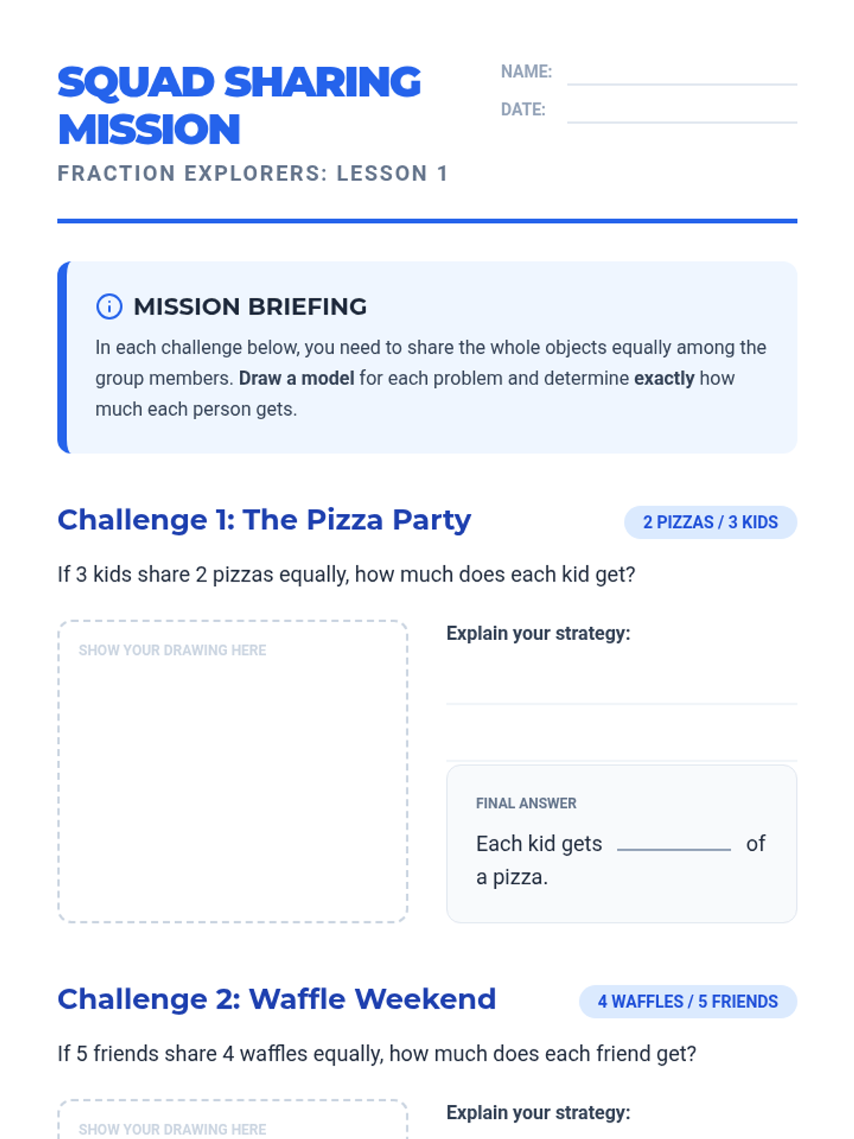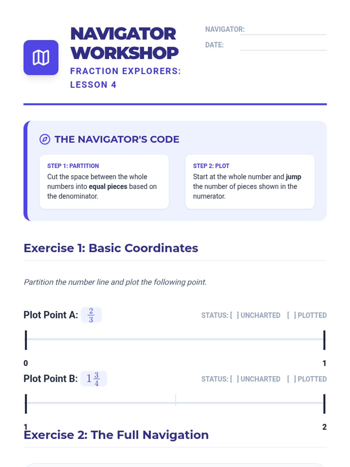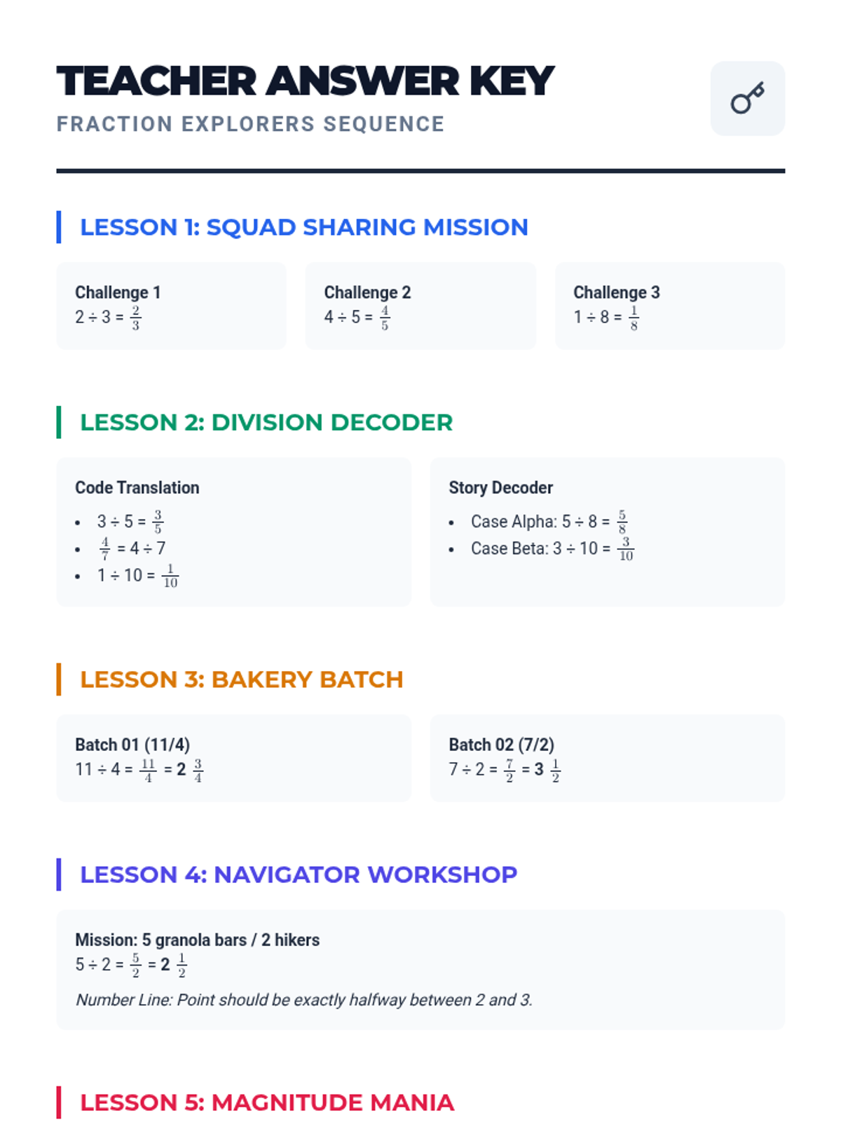 This sequence guides 5th-grade students through the conceptual shift of seeing fractions as division operations. Starting with concrete sharing problems and moving toward abstract number line representation, students develop a deep understanding of fractions as specific values between whole numbers.