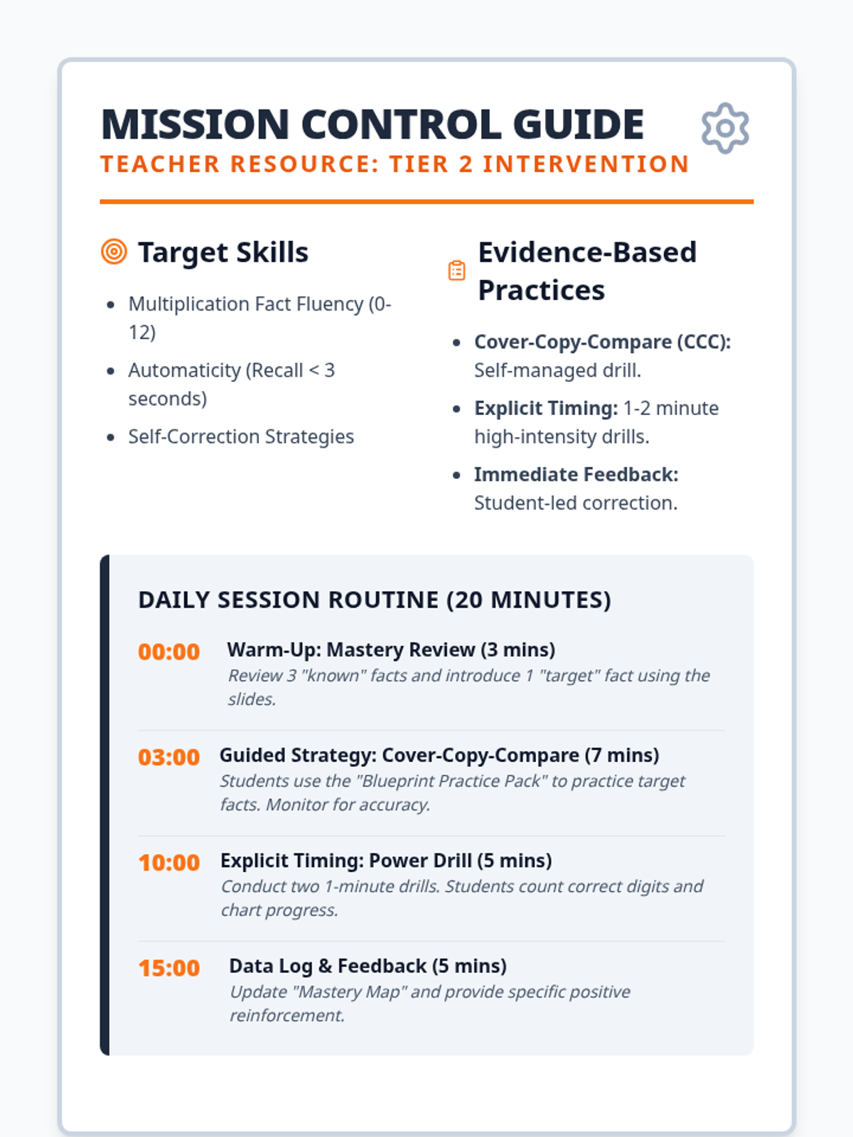 A Tier 2 evidence-based intervention sequence designed to improve multiplication fact fluency (0-12) for 4th grade students using strategies like Cover-Copy-Compare and Explicit Timing.