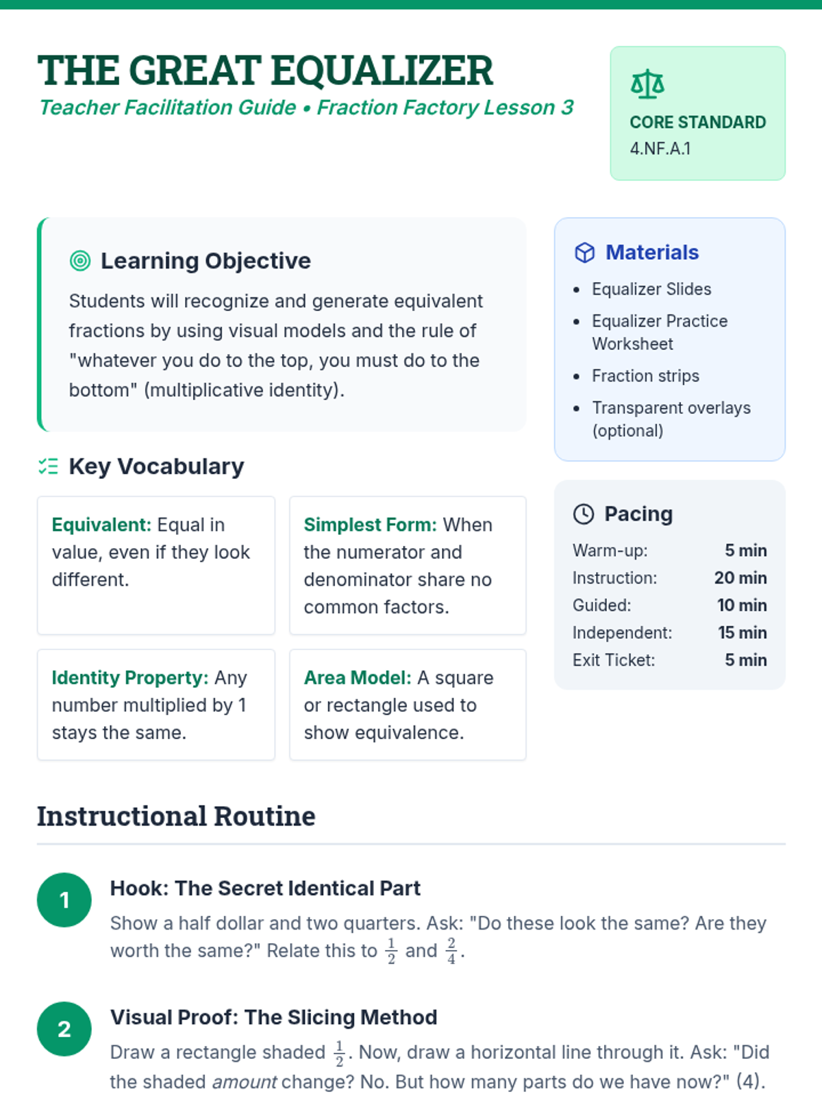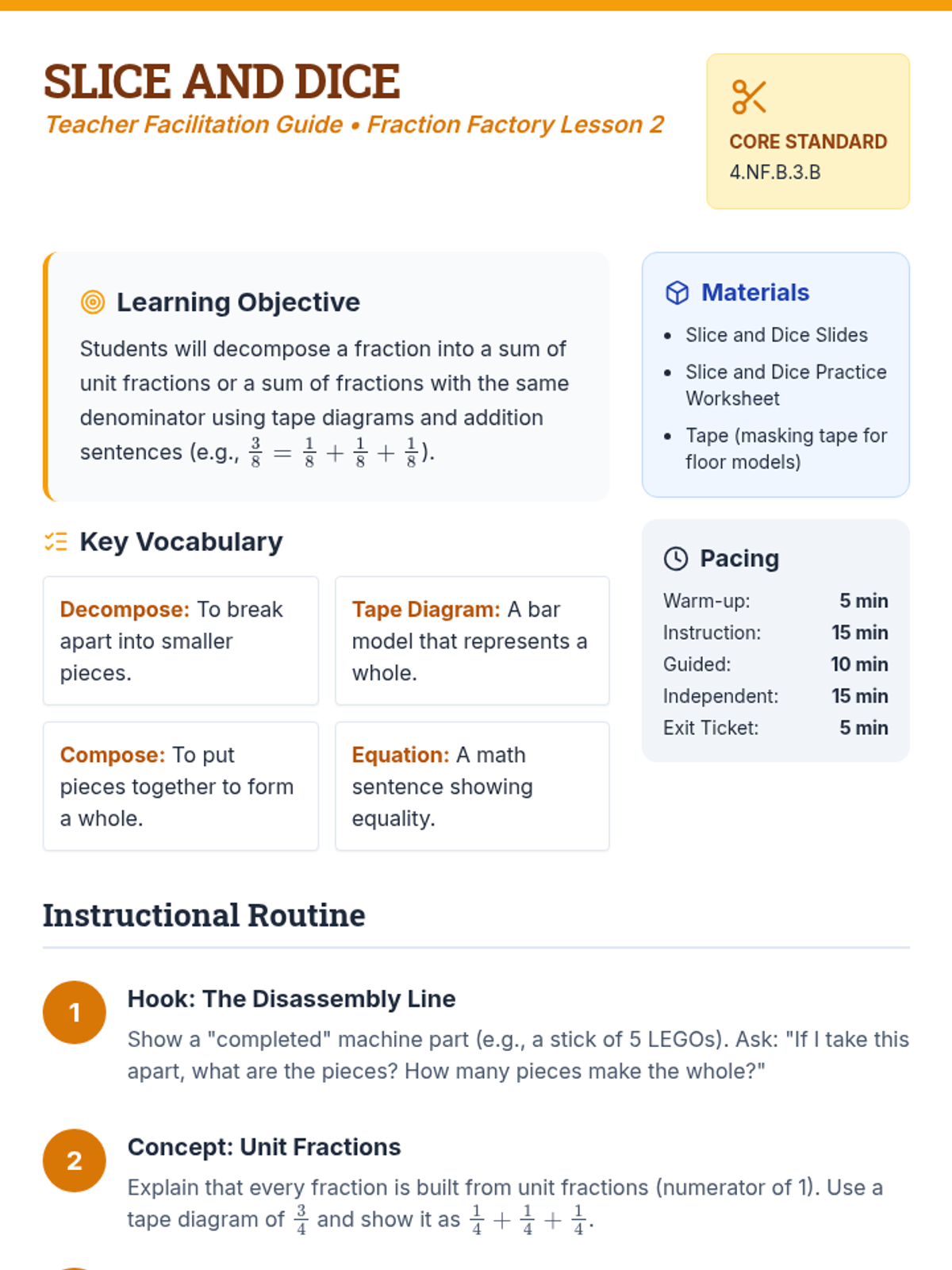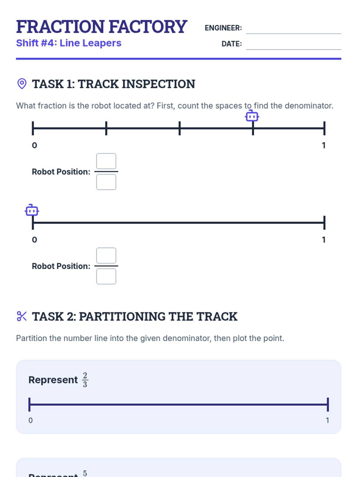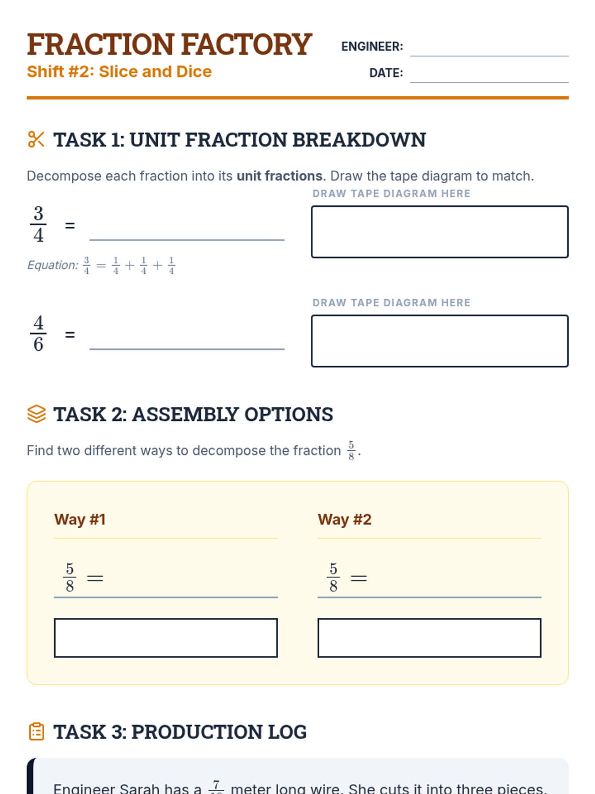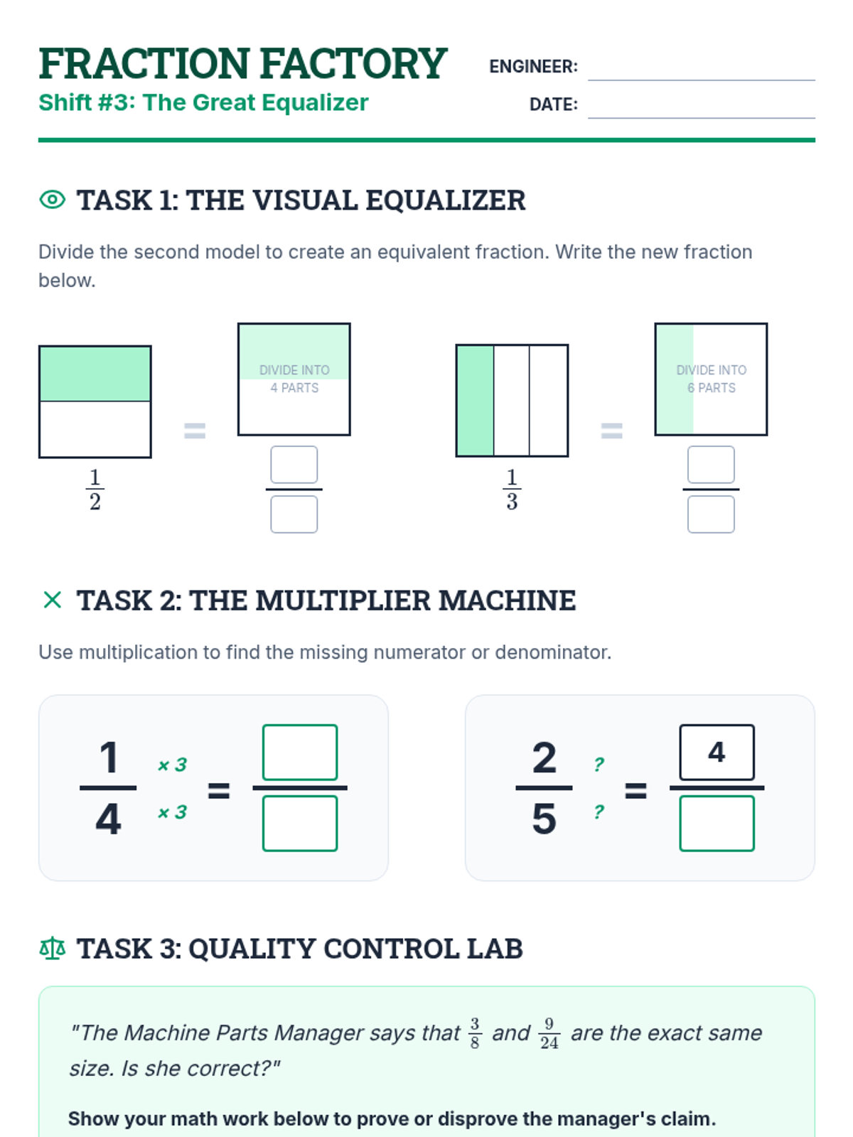 A comprehensive unit on fractions covering identification, decomposition with tape diagrams, equivalent fractions, and representing fractions on a number line. Students act as 'Factory Engineers' to build and analyze numerical parts.