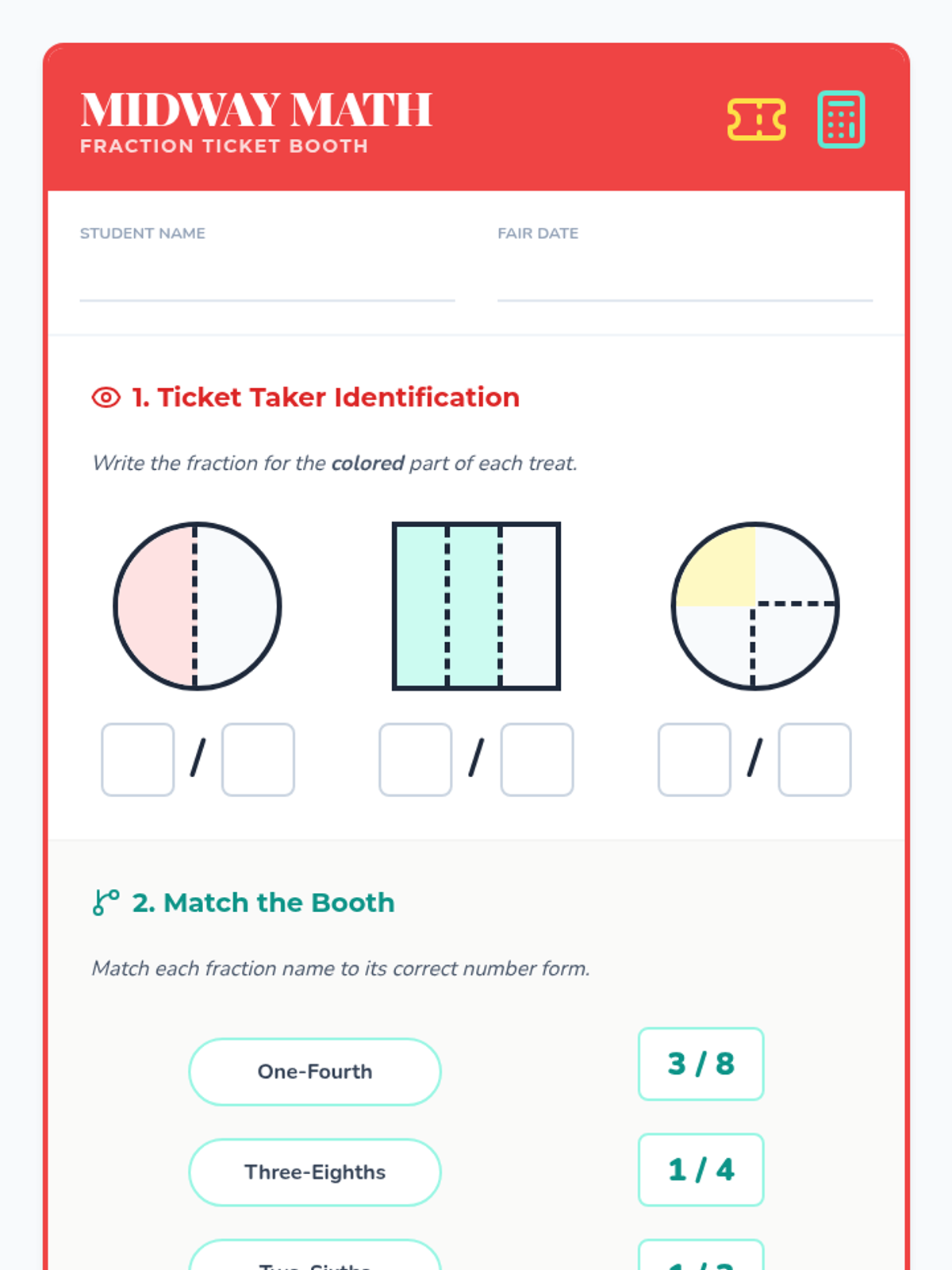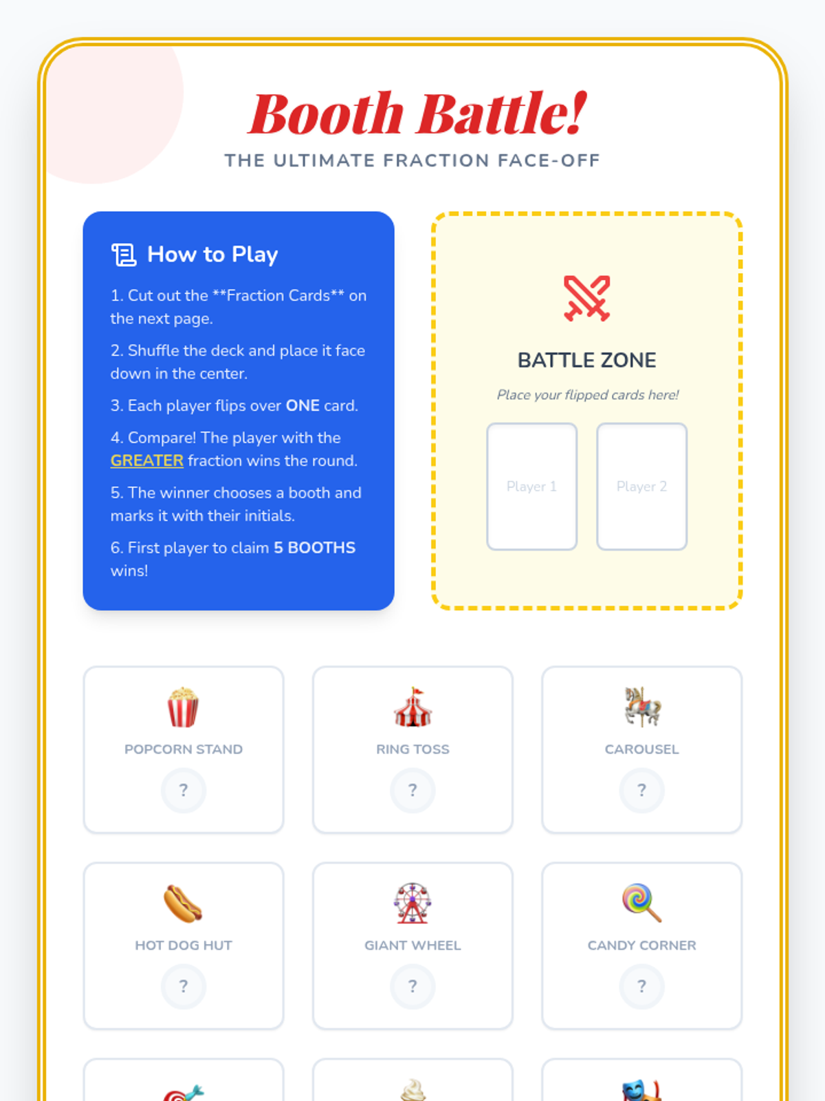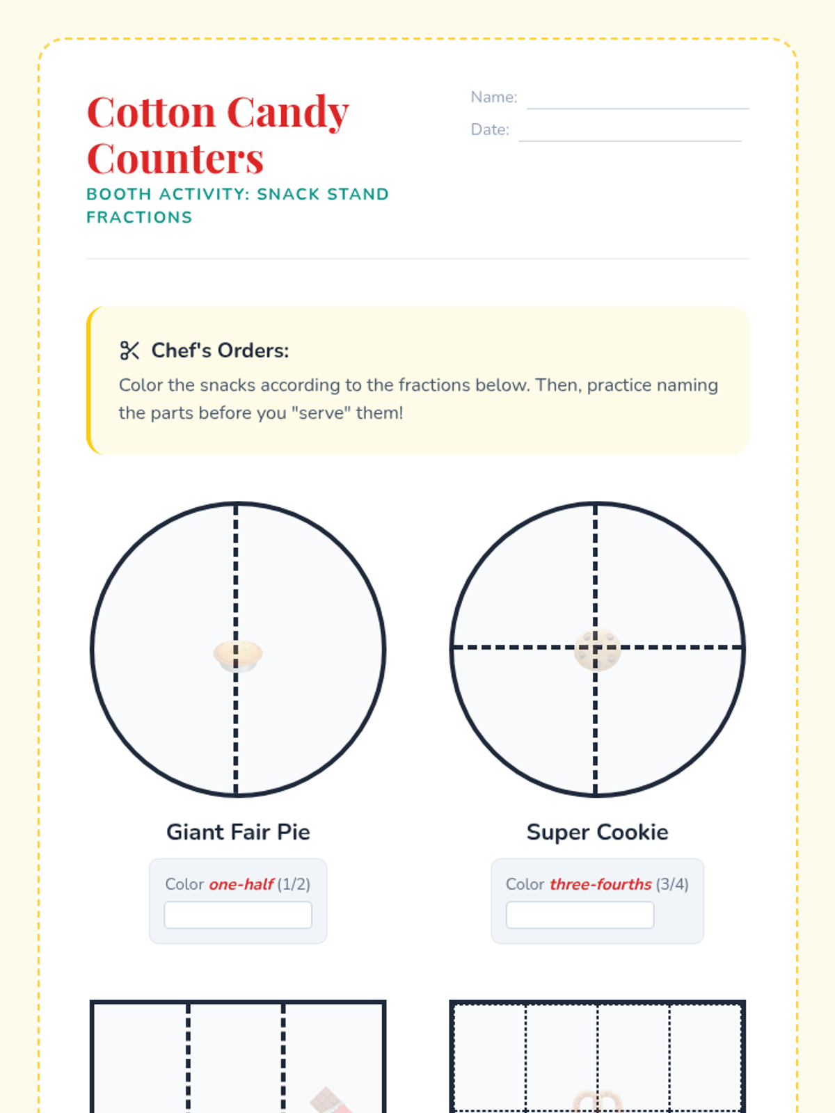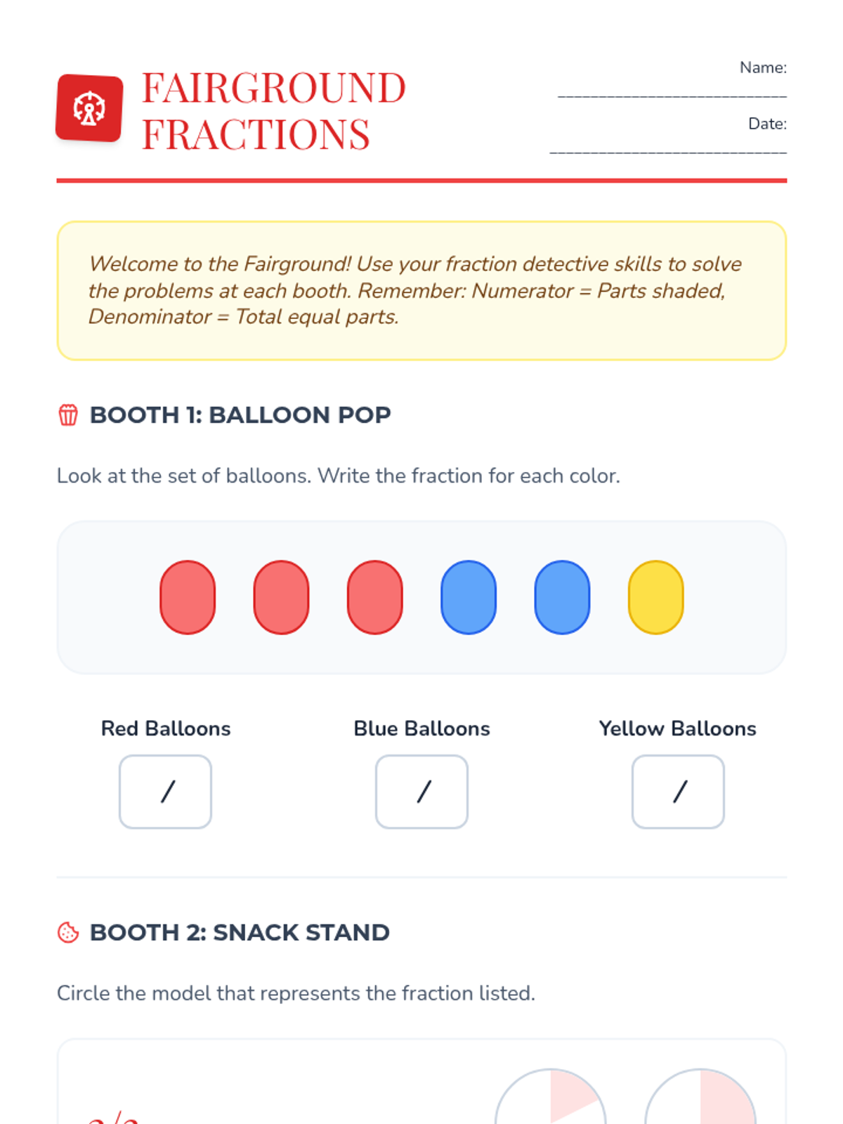 A fair-themed math unit where students explore fractions through interactive carnival games and activities, focusing on identifying, representing, and comparing parts of a whole.