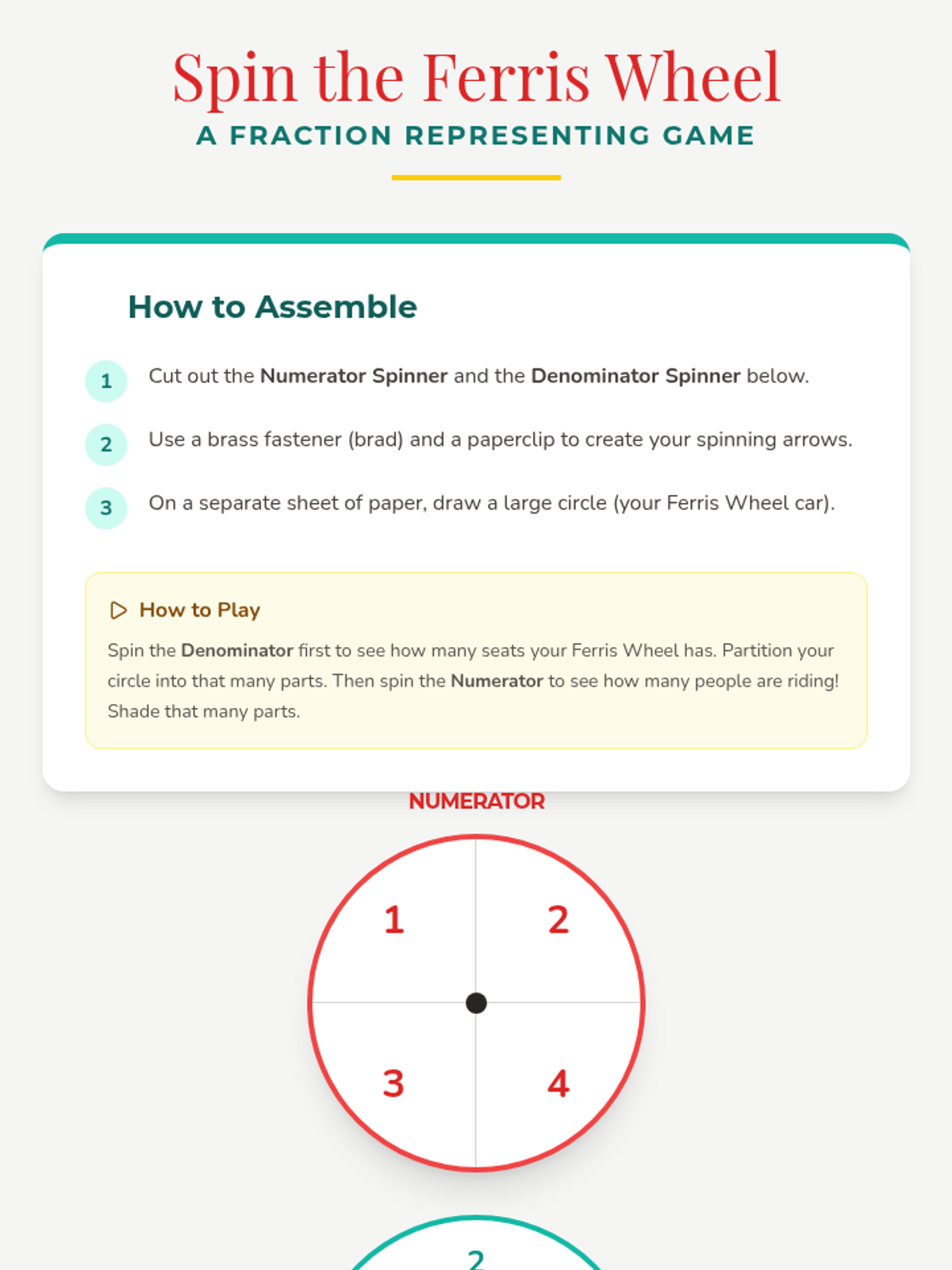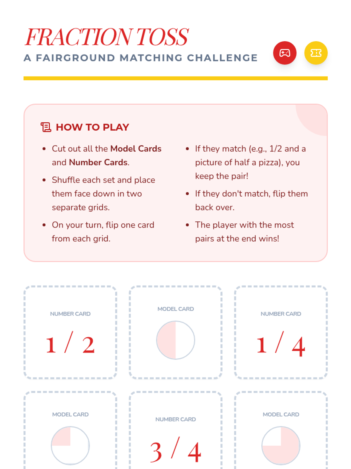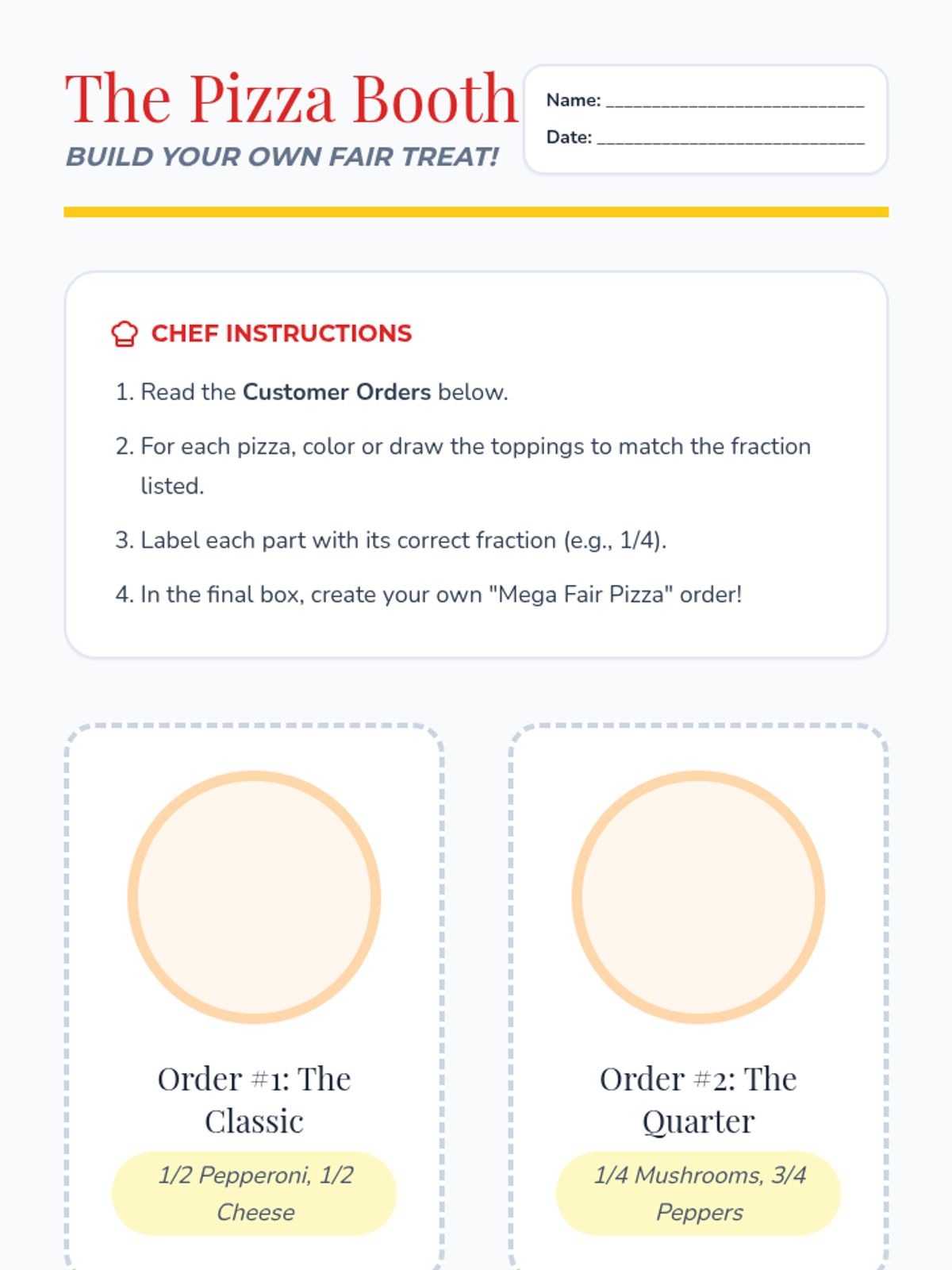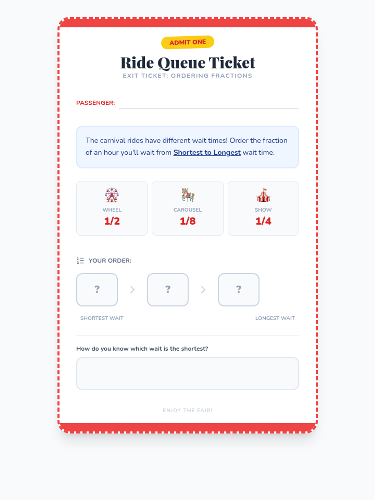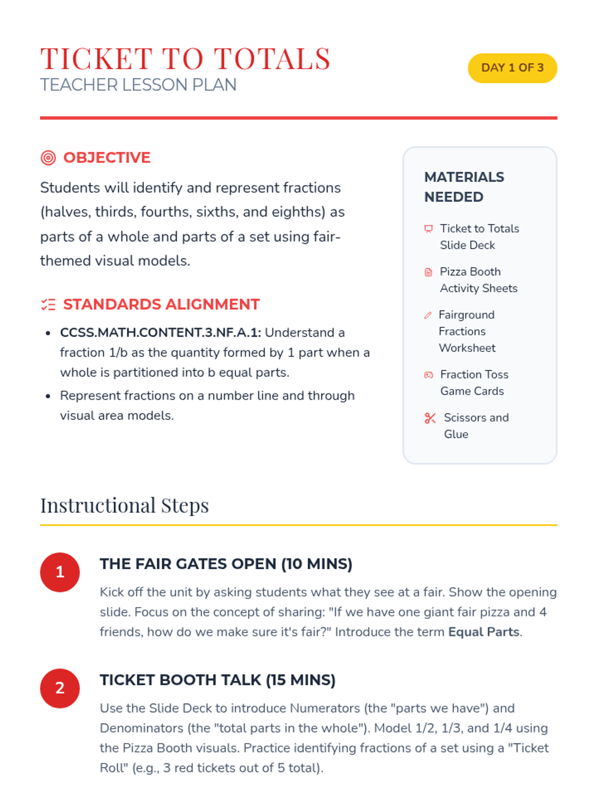 A fair-themed math unit where students explore fractions through interactive carnival games and activities, focusing on identifying, representing, and comparing parts of a whole.