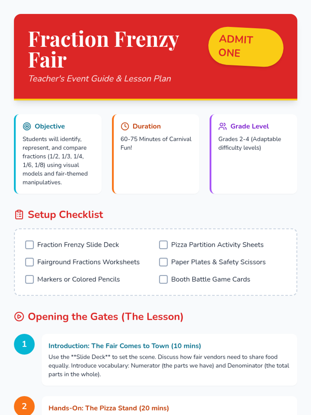 A carnival-themed math unit where students explore fractions through fair games and attractions. Students learn to identify, represent, compare, and order fractions using visual models like tickets, snacks, and prizes.