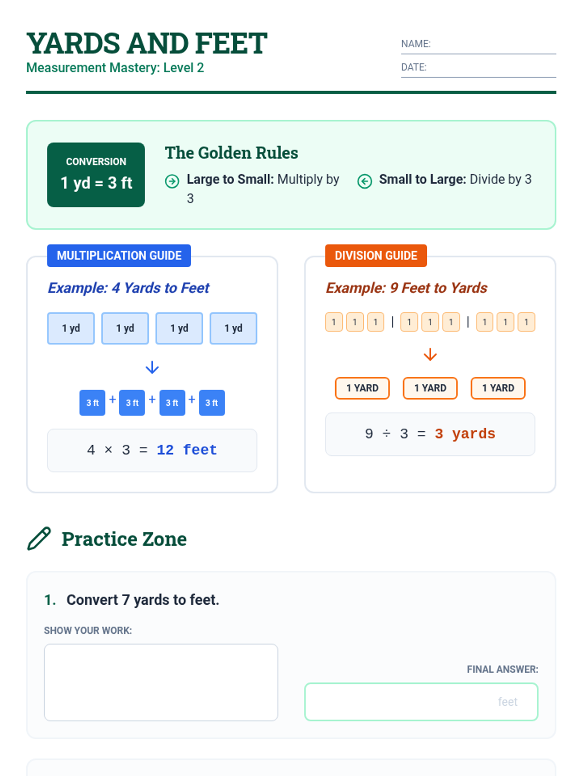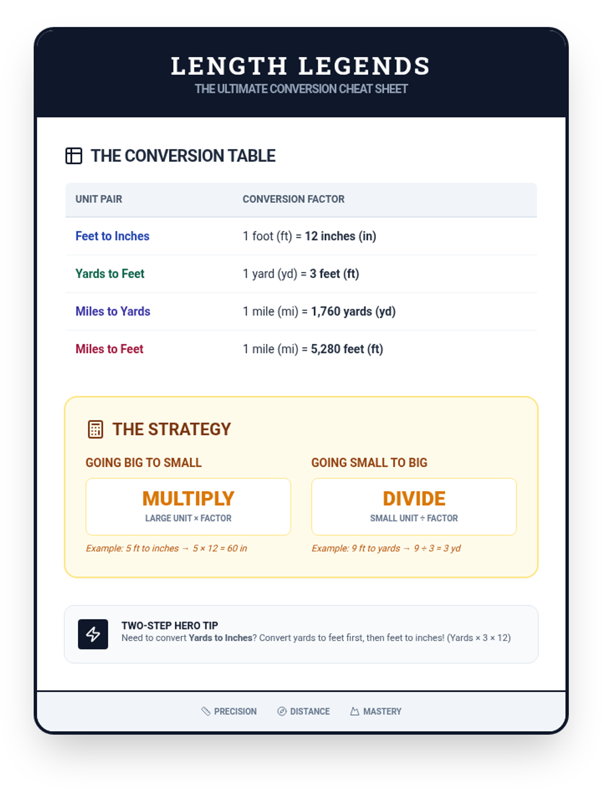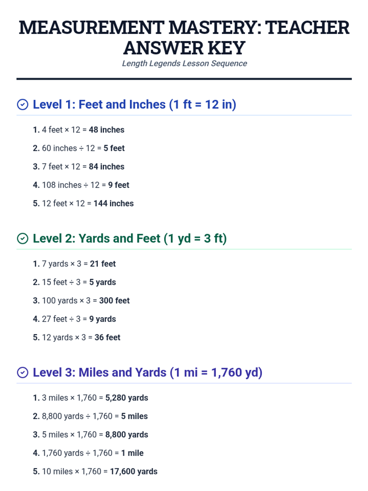 A comprehensive sequence focusing on linear measurement conversions, providing step-by-step visual guides and practice for converting between inches, feet, yards, and miles.