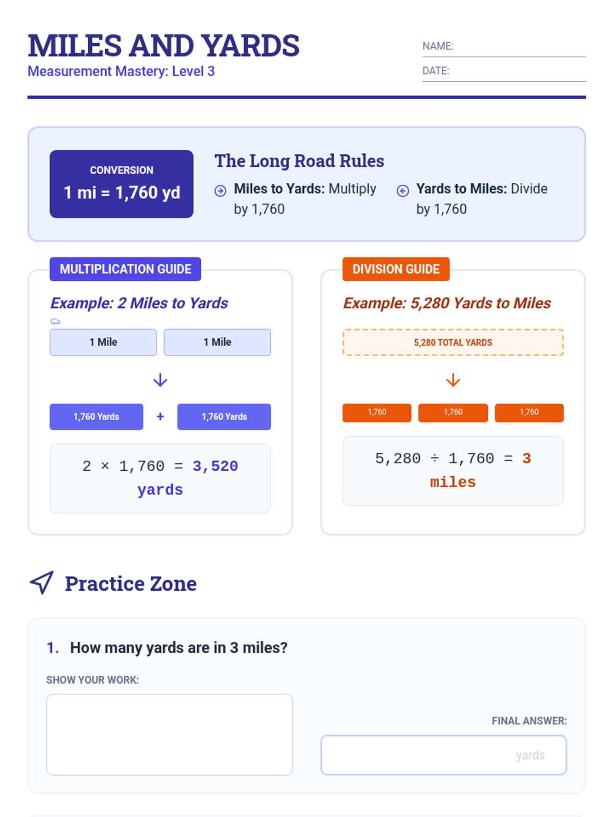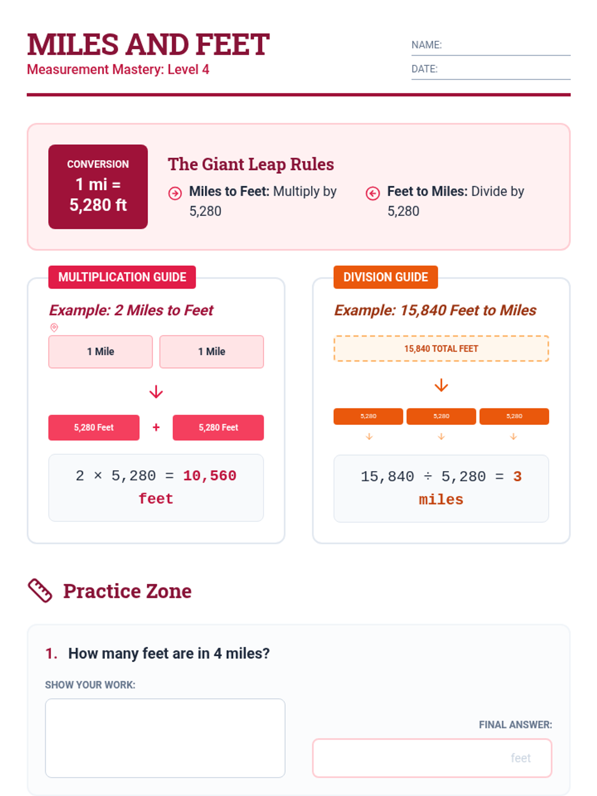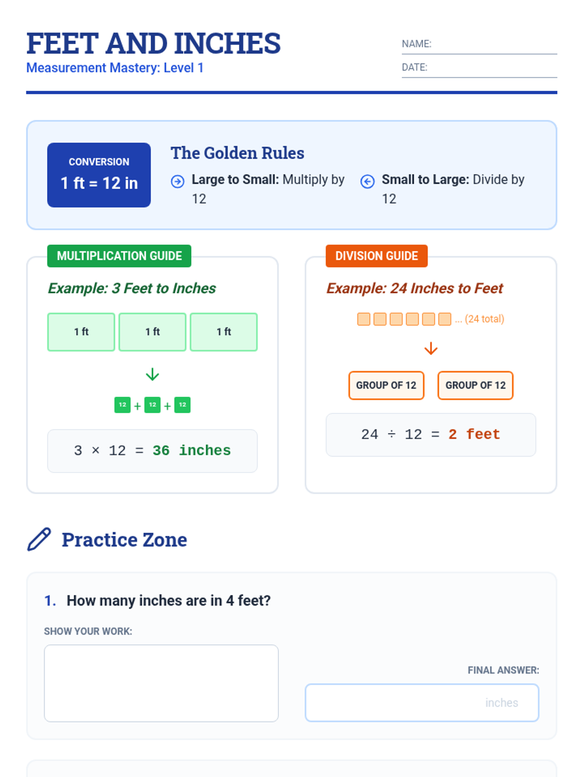 A comprehensive sequence focusing on linear measurement conversions, providing step-by-step visual guides and practice for converting between inches, feet, yards, and miles.