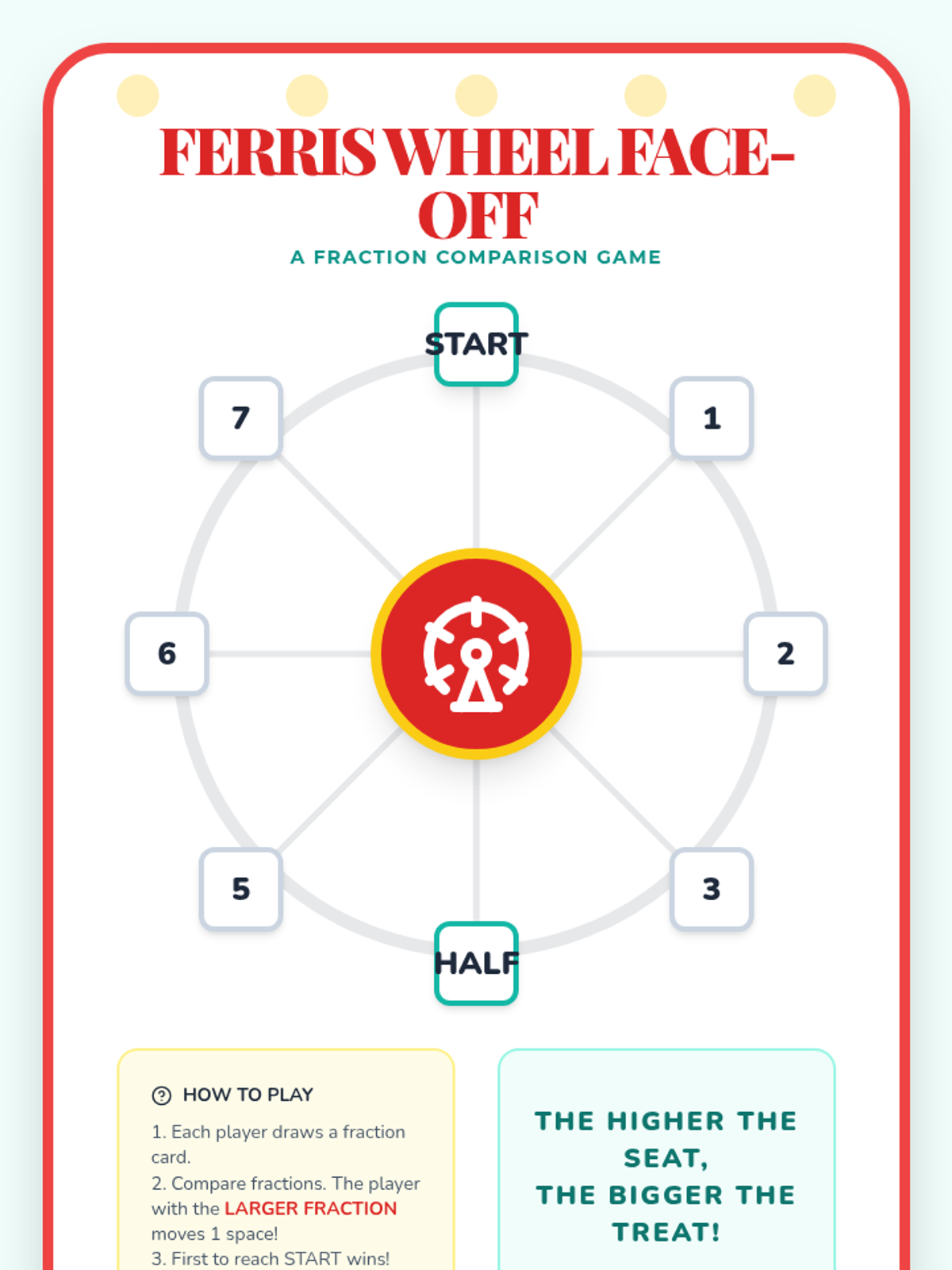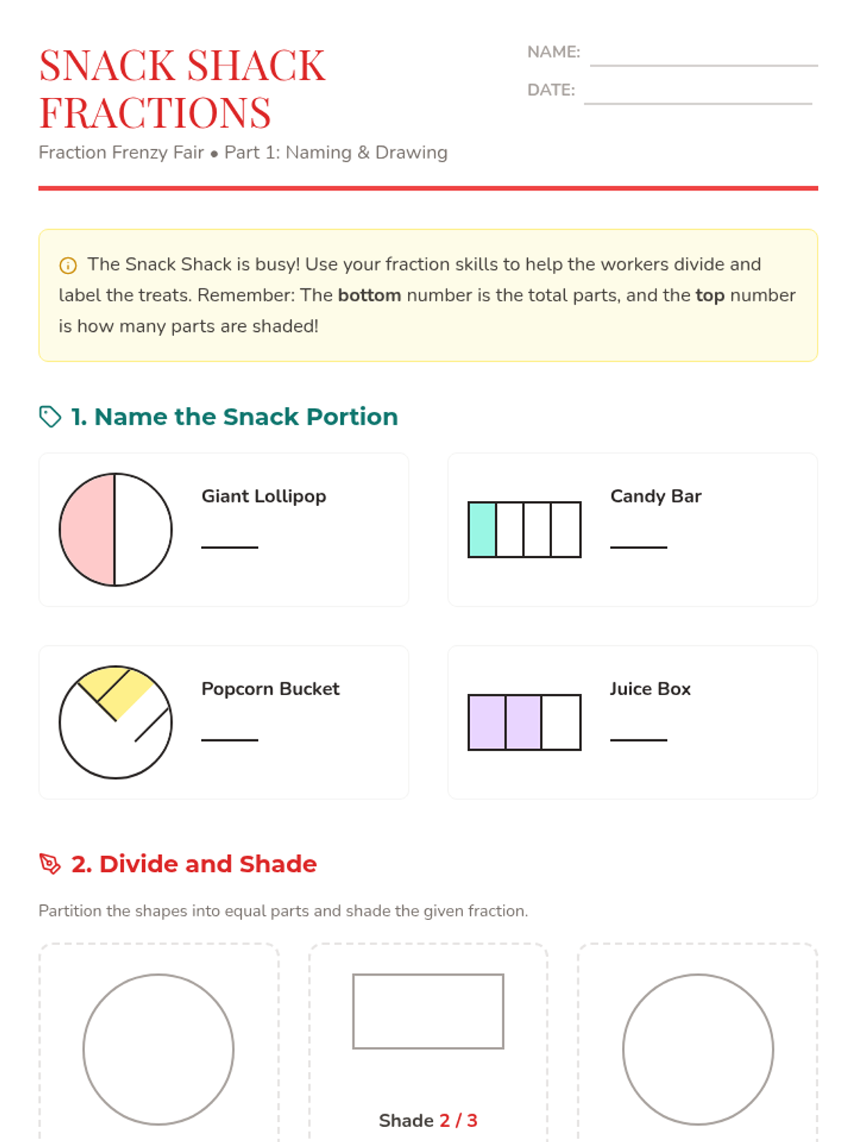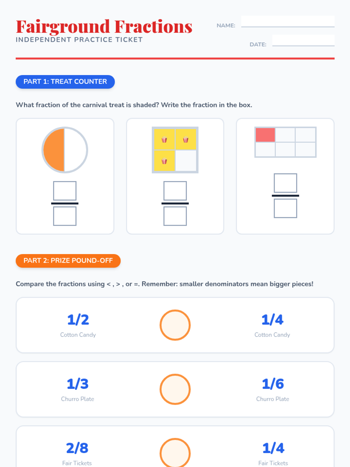 A vibrant, carnival-themed unit where students explore fractions through fair games and treats. Students will identify, represent, compare, and order fractions using visual models and hands-on activities.